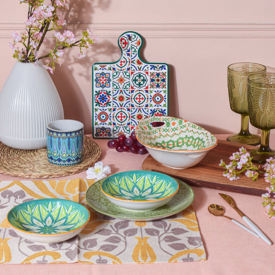 The mandala design on the ceramic snack dishes is handcrafted by skilled artisans. They apply each intricate detail of the mandala pattern by hand, ensuring that the design is precise and beautiful.