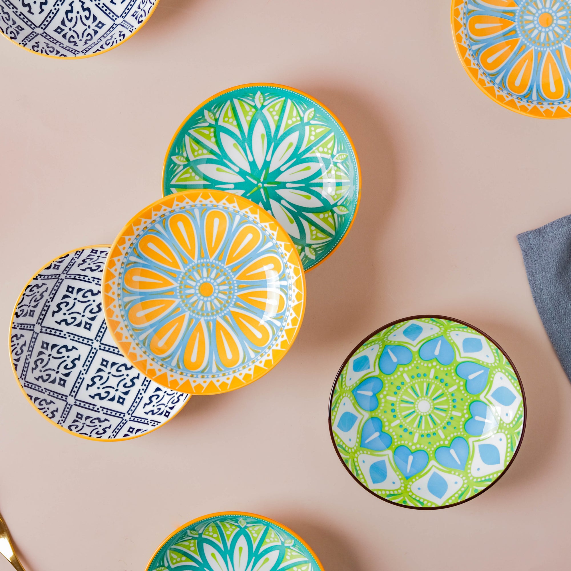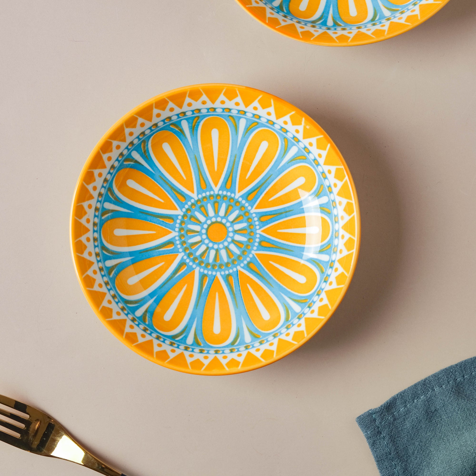 The mandala design on the ceramic snack dishes is handcrafted by skilled artisans. They apply each intricate detail of the mandala pattern by hand, ensuring that the design is precise and beautiful.
