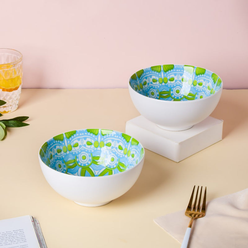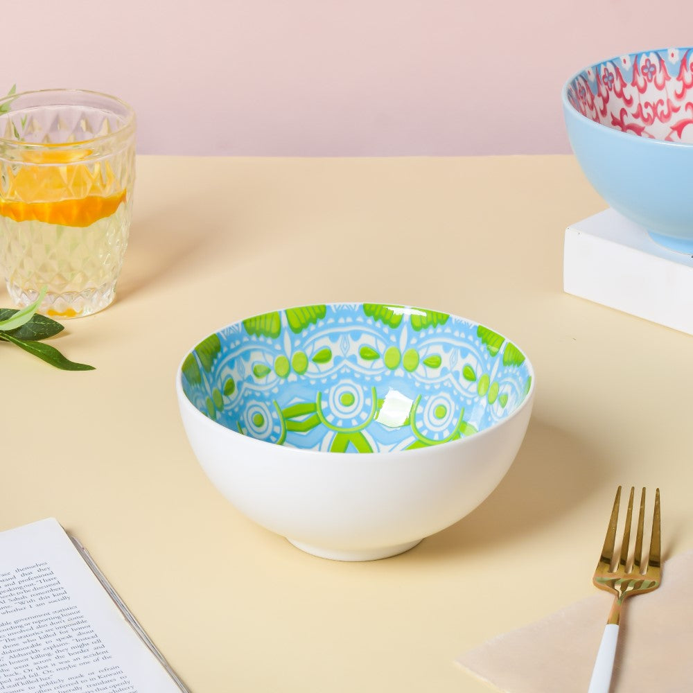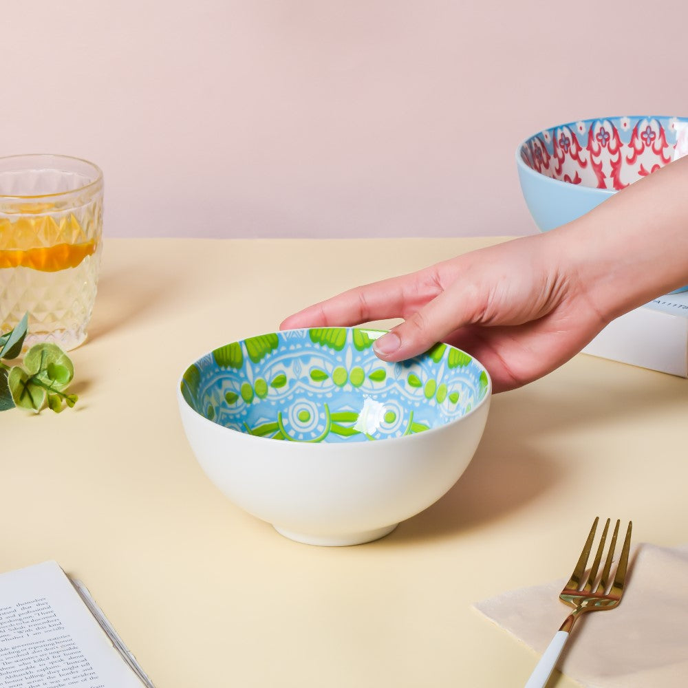 The ceramic snack bowl set has a smooth texture and features intricately detailed mandala patterns in bright green and sky blue on the inside. The combination of the soothing sky blue with the vibrant bright green makes the mandala design of the ceramic bowl set stand out from ordinary kitchenware. Moreover, the clear white exterior of the snack bowl set offers the perfect backdrop to arrange fresh fruits of different colours, making the ceramic fruit bowl set the centrepiece of the kitchen counter or dining table.