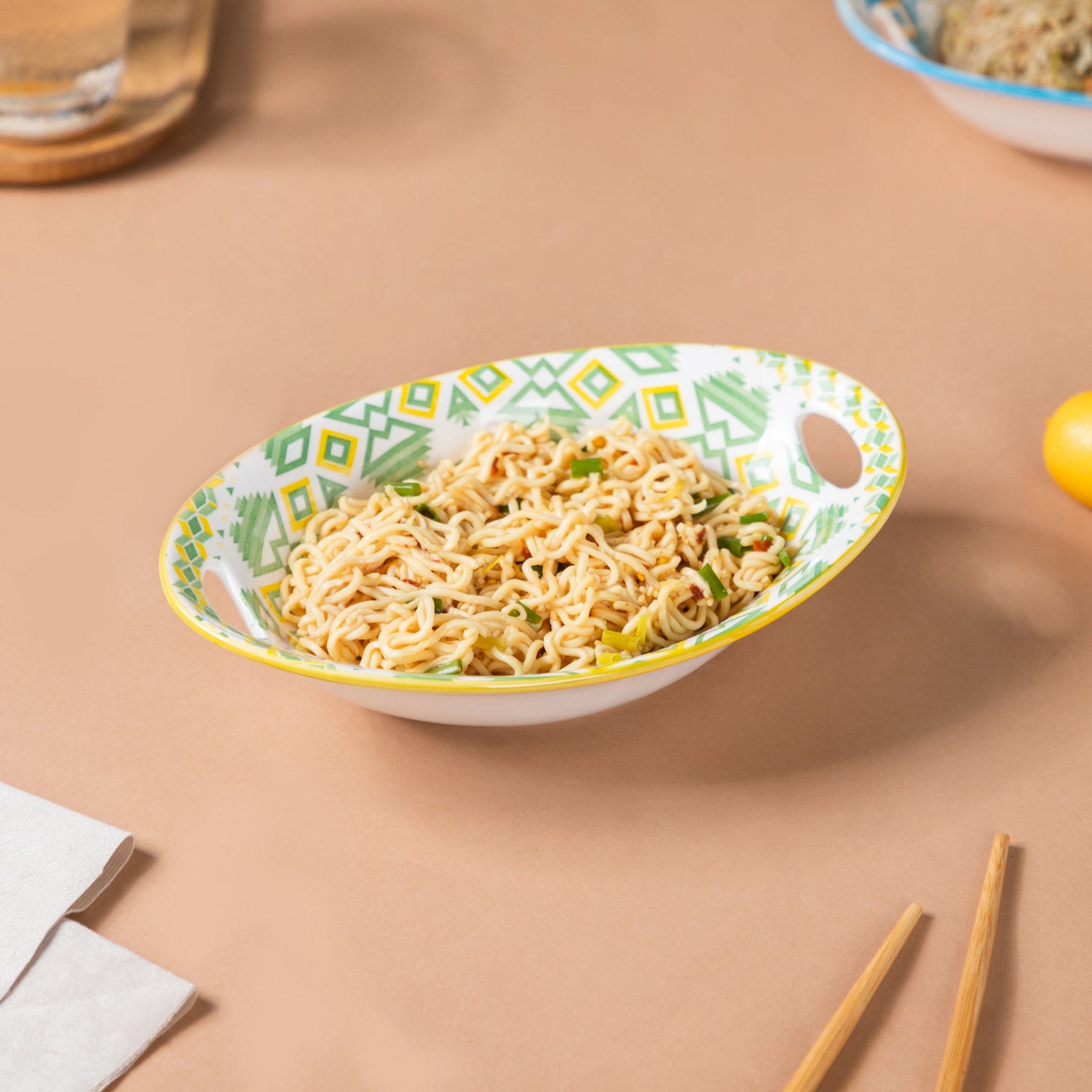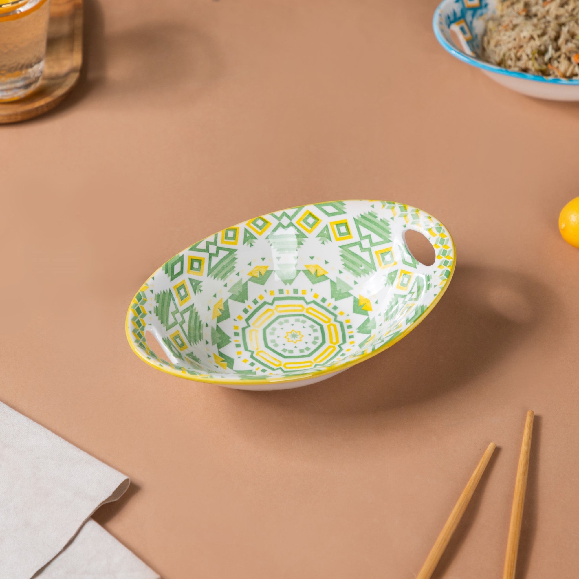 The circular symphony of the artistic wheel-like patterns embossed on the bowls and given a glazed finish will add a feeling of comfort and calm to one's table increasing one's enjoyment while dining. Experience the joy of harmonious dining with shades of green and yellow to add a soothing nature-inspired vibe to one's home. Nestip: Use the mandala bowls to place party favors for a colorful theme party. Size: 23cm L x 15cm B x 6cm H Color: Green, white, and yellow Material: Ceramic Products included: 1 baking dish Style: PRS67C05