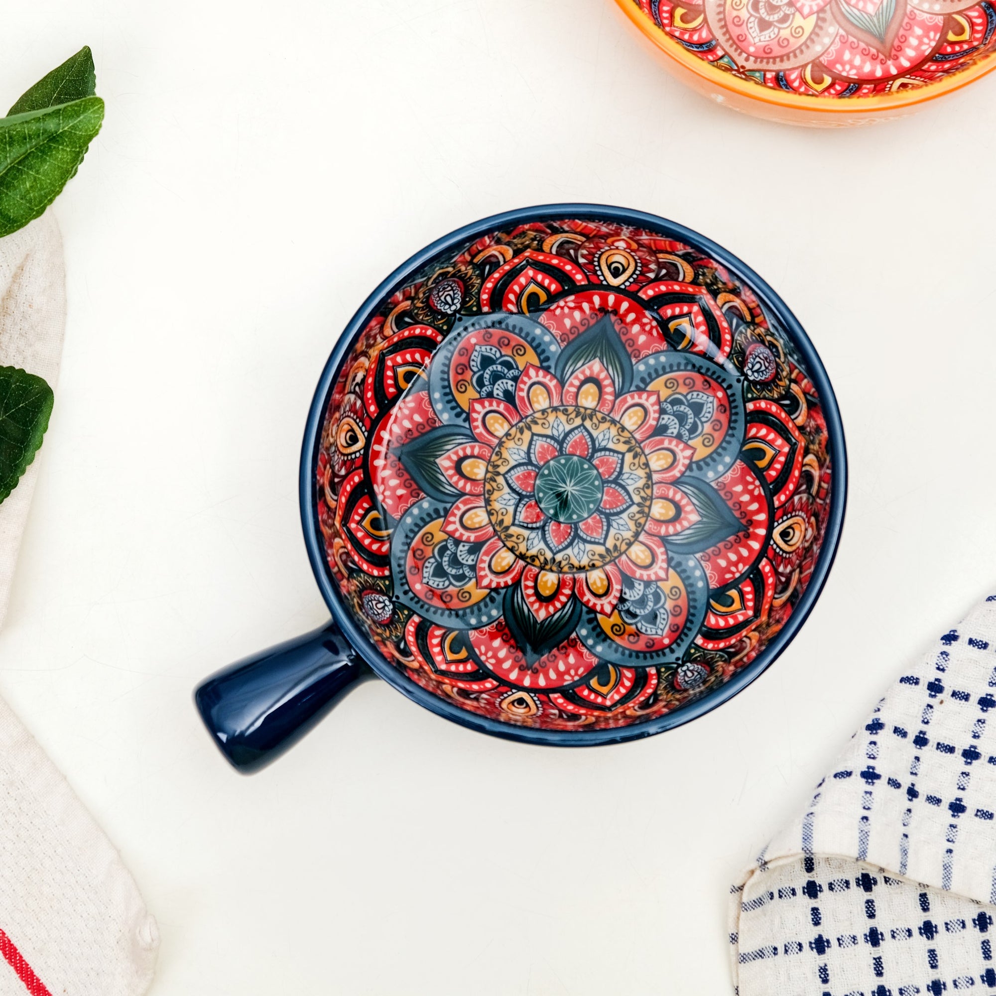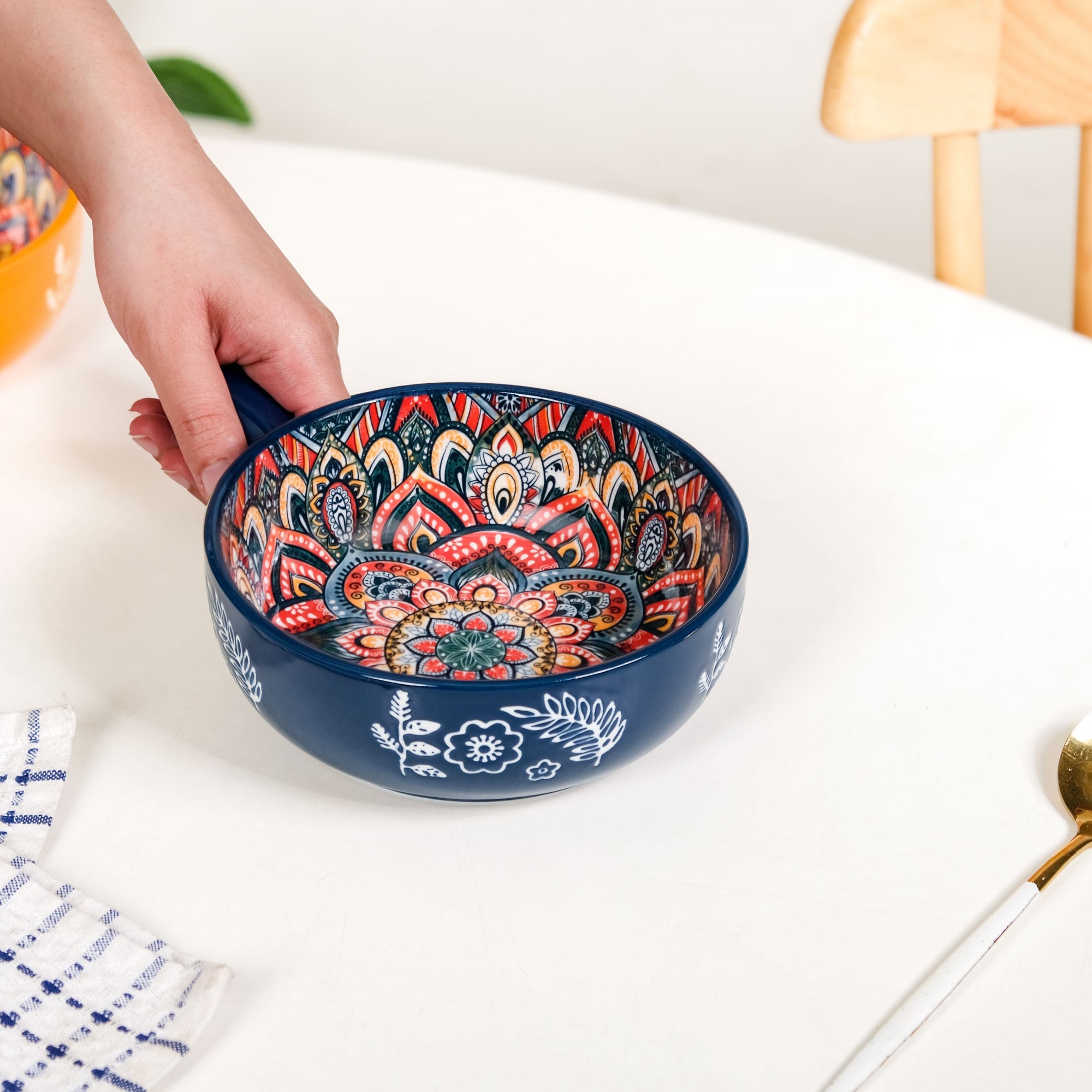 Benefit: Crafted from durable, heat-resistant ceramic, this bowl is made to handle both microwave and dishwasher use with ease. The ergonomic handle offers a firm grip, perfect for carrying hot dishes straight from the microwave to the table. Its ceramic body retains heat longer, keeping your food warm. Easy to clean and resistant to chipping, this bowl is ideal for daily use. Use it for meals, snacks, or even as a unique serving dish at small gatherings. The vibrant inner design adds visual appeal to every meal served.