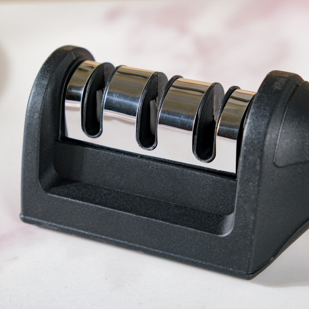 The knife sharpener is designed to sharpen, hone, and polish all types of knives and scissors, including straight-edge and serrated blades. The sharpening process uses a three-stage sharpener that is quick and easy to use and can make any dull and damaged knife fine and polished. This three-stage knife sharpener creates a fast, easy, and effective sharpening system for every knife owner. The ergonomic handle and anti-skid base of the knife sharpener provide a comfortable grip. The kitchen knife sharpener is not only a must-have for any kitchen, but also makes a great gift for a home cook or professional chef.