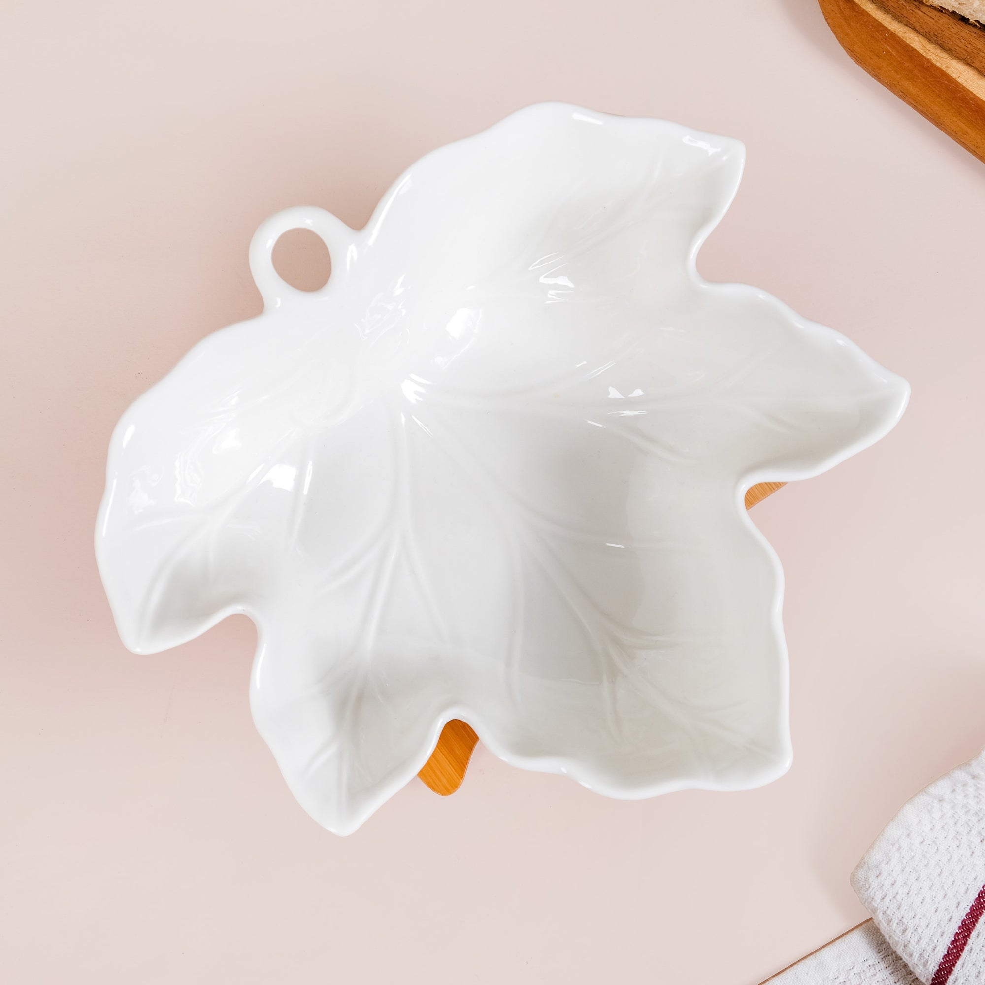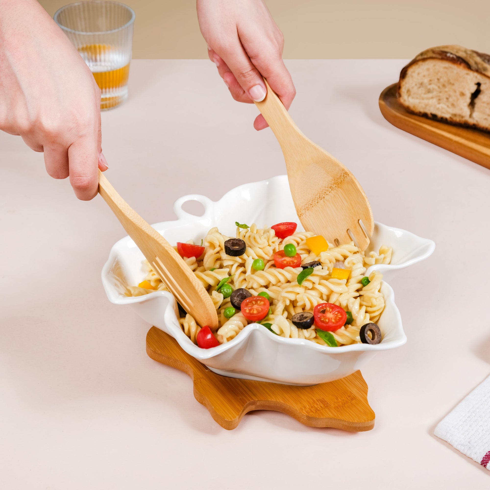 Design: The salad bowl boasts a distinctive maple leaf shape adorned with delicate leaf vein patterns, bringing a fresh, organic feel to your table. Its small handle ensures easy handling, while the wooden tray complements the ceramic bowl with its own maple leaf shape. Included in the set are a wooden spatula and a spork, designed to match the bowl’s unique style.