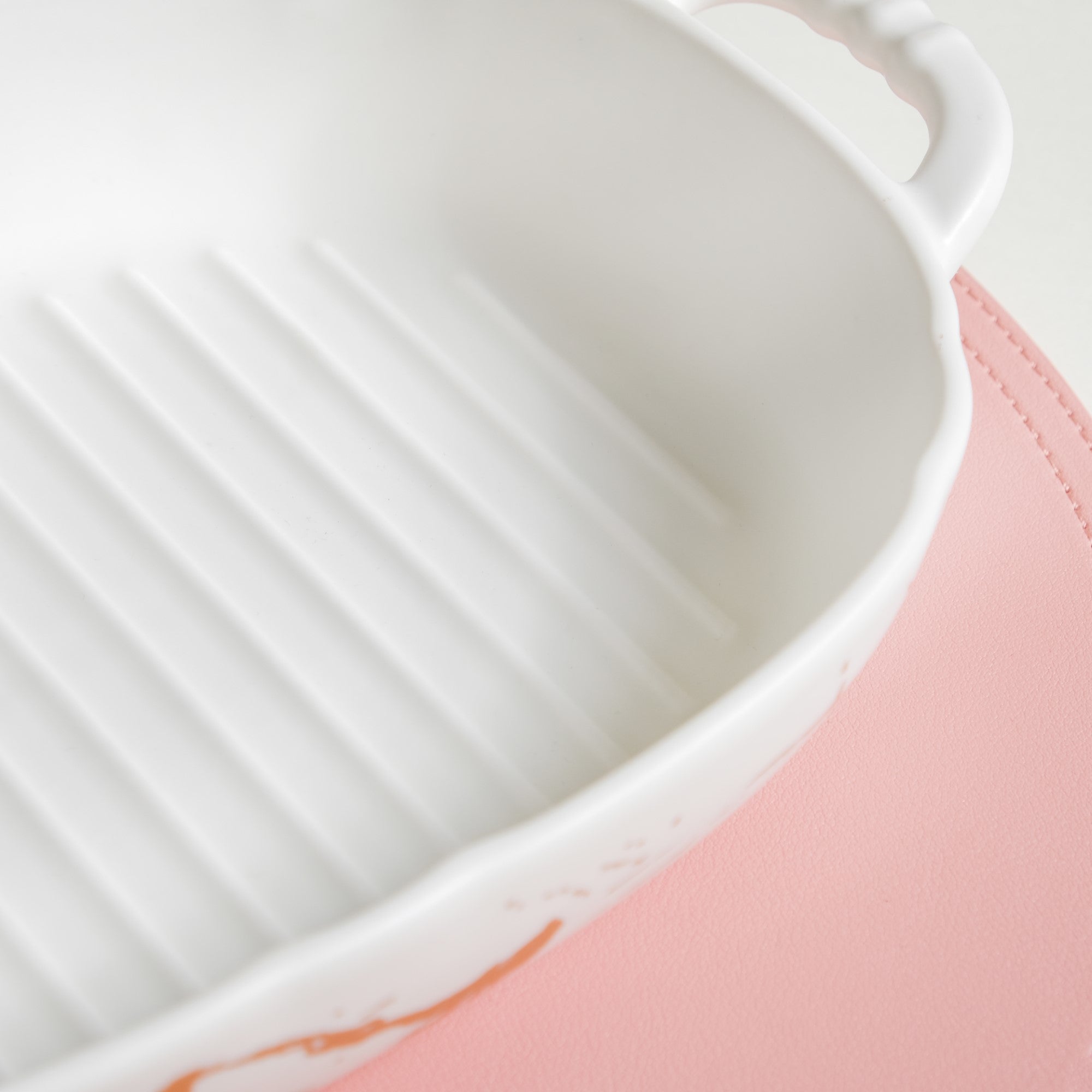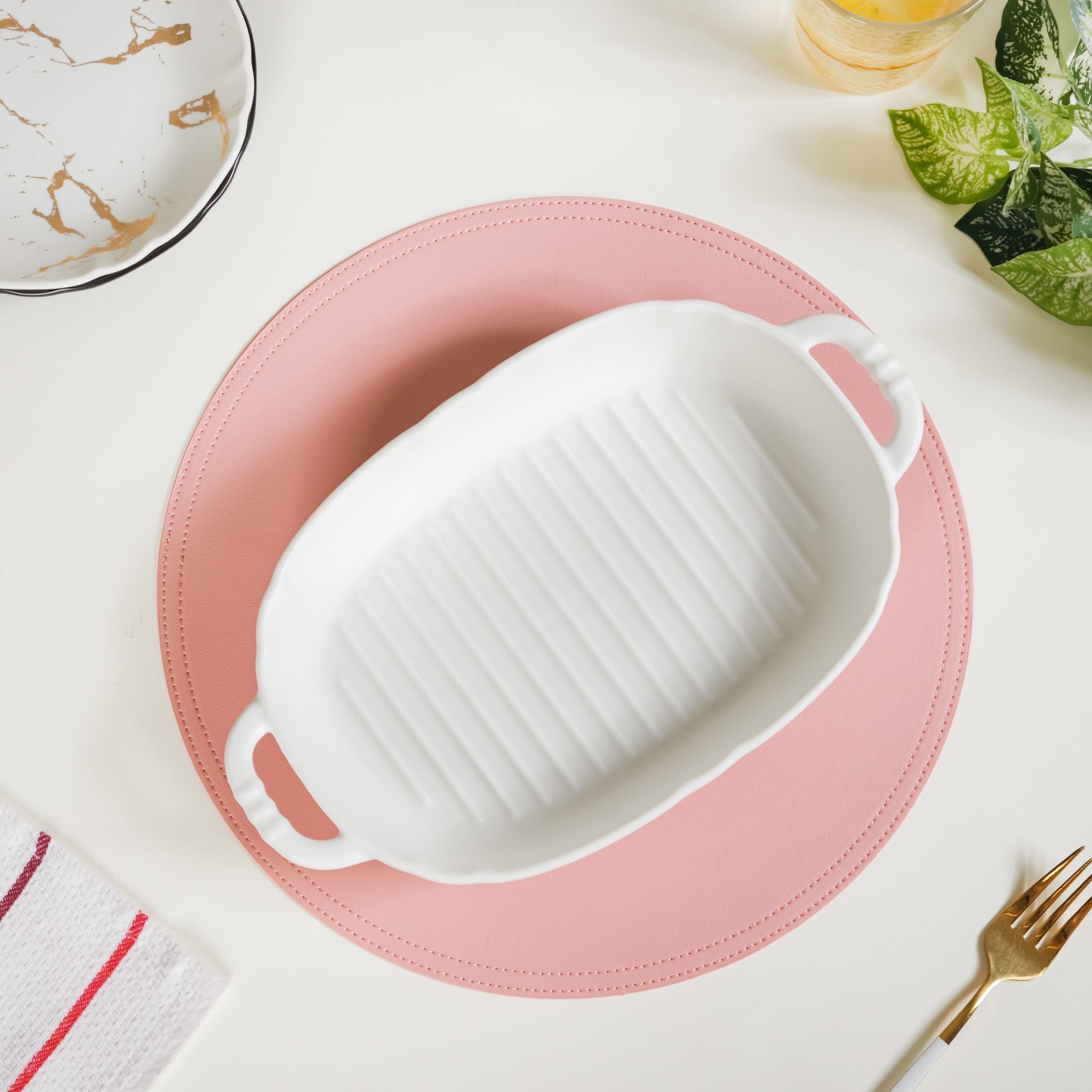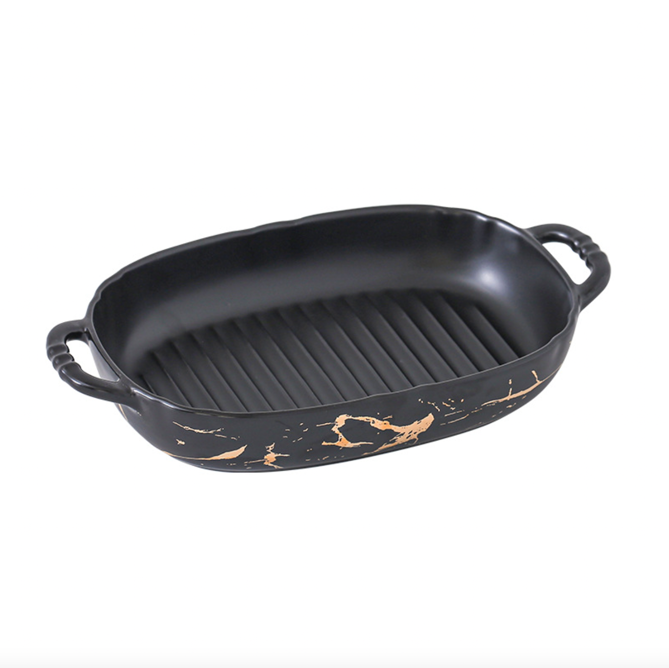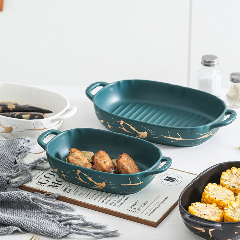 The serving tray comes in variant colors like white, black, green and has a bright golden dash on the outer surface. The ceramic dish comes with handles that make up for easy serving and easy to hold. Serve dishes like au gratin, baked potatoes, mushrooms, veggies, bacon and chicken, mud pie, cookies, brownies or simply use the dish with handles to serve snacks and sides.
