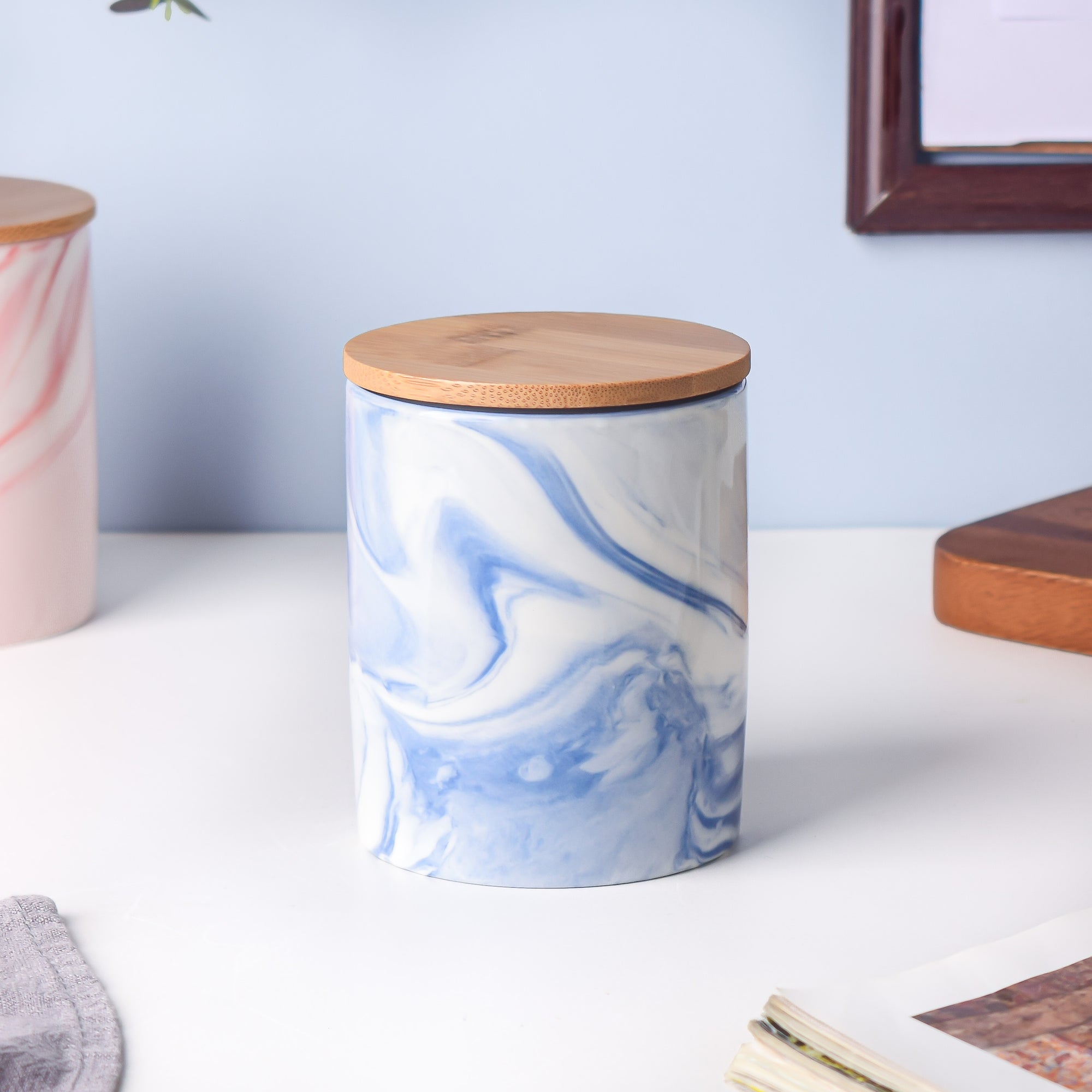 A soothing pattern of blue and white intertwines to make the ceramic jar look simplistic as well as elegant. The airtight jar can be used for storing chips, snacks, and condiments in the kitchen, as the lid ensures that the components inside the jar stay fresh. The utilitarian container has been made of high-quality chip-resistant ceramic, while the wooden lid has a smooth sleek finish, making the ceramic jar a modern addition to the kitchen. The airtight jar is microwave safe without the lid.