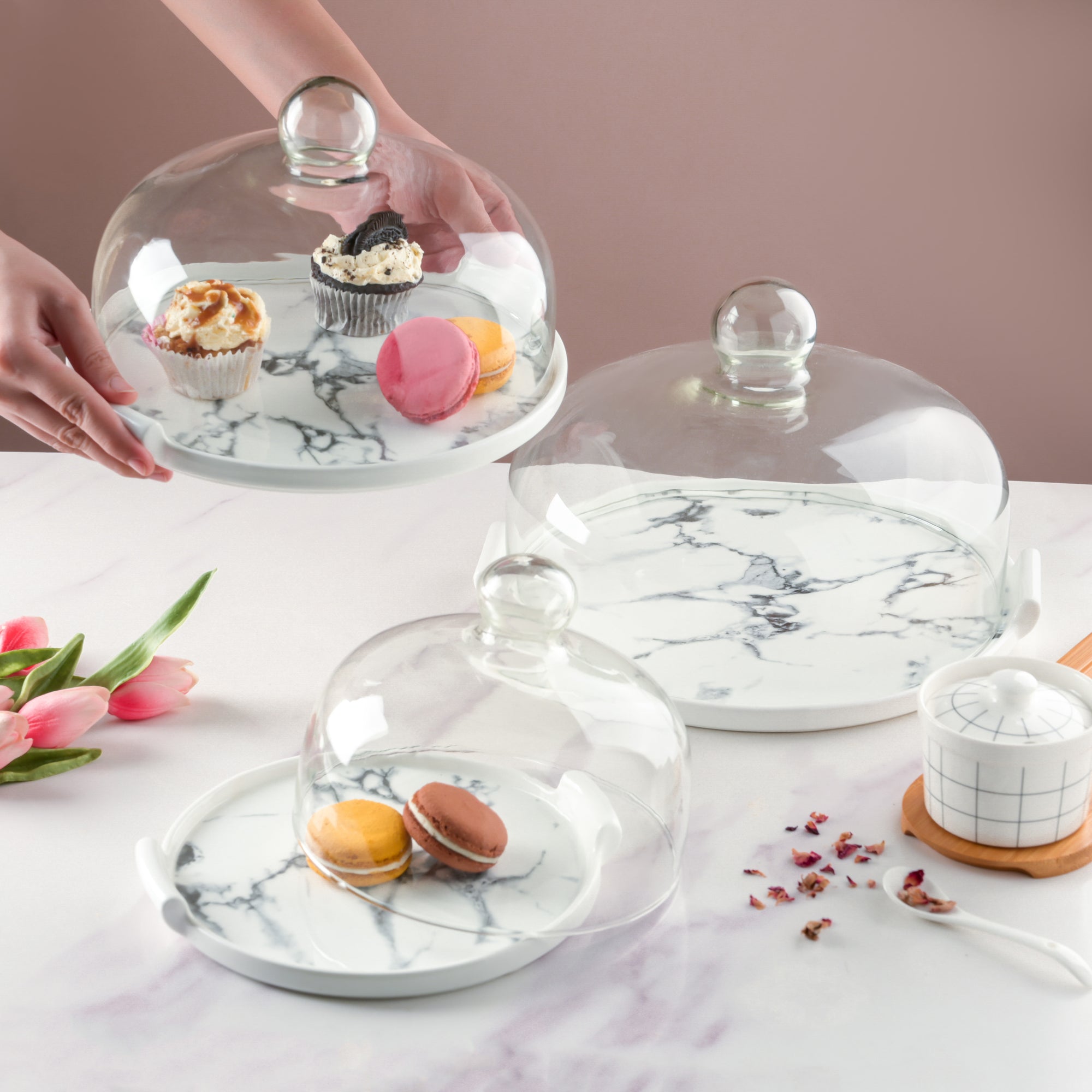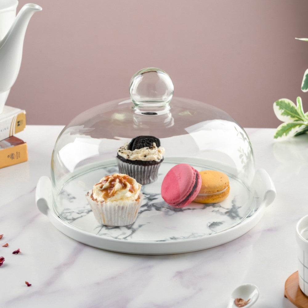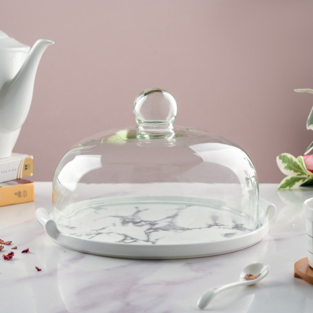 The marble pattern is climbing the ladder of trending patterns worldwide. So, why will the party essentials fall behind? The white cake plate is decked with a marble pattern to give the platter an authentic look of a marble-made serving platter. The platter comes with a transparent cover and a holder for easy handling, and the cover gives space to the pastries, cake slices, or creamy sweets that are kept inside so that they do not get smudged.