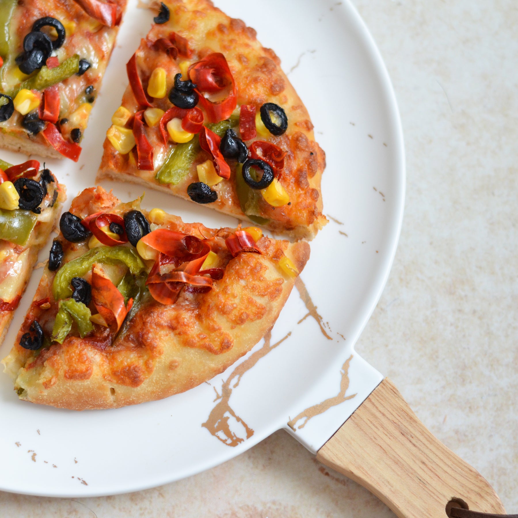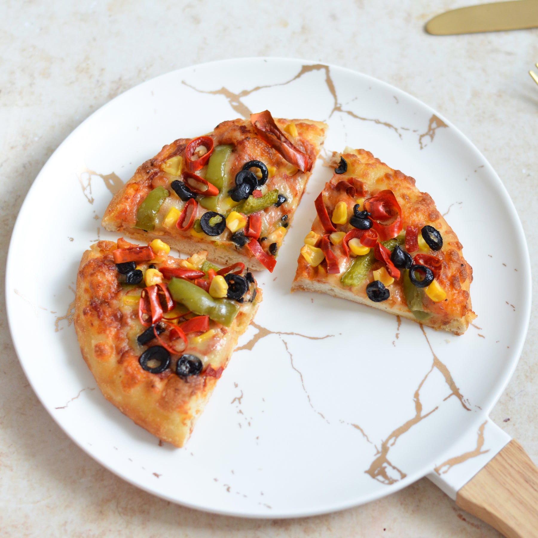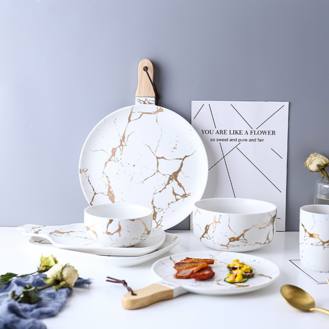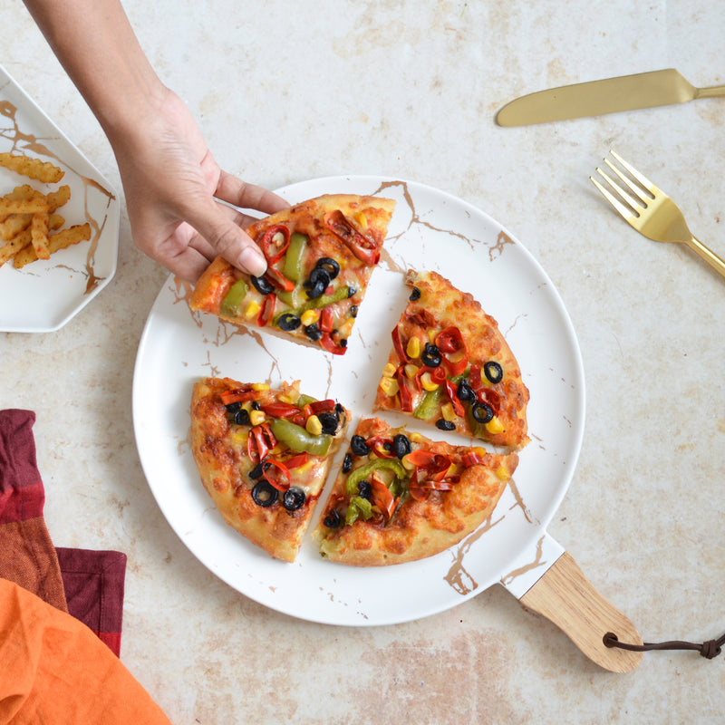 A round dinner platter with wooden handle and matte white and gold marble pattern, apt as a dinner plate or for serving up roasts, noodles, pasta and more.