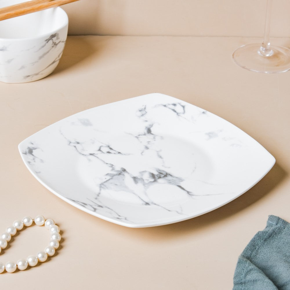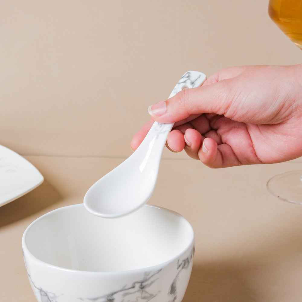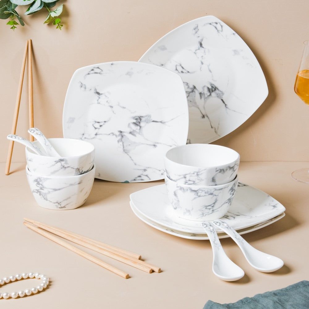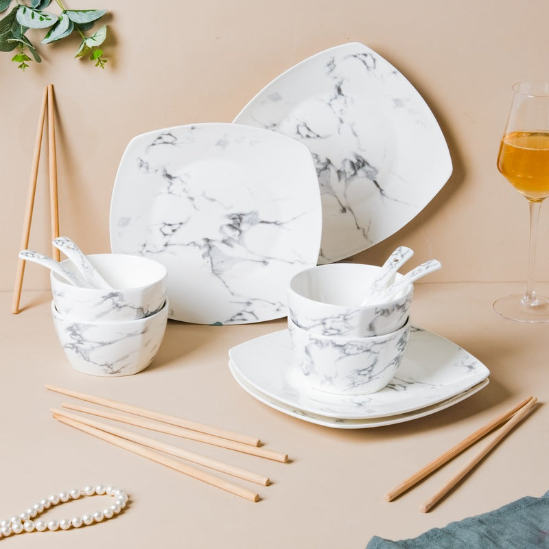 The marble dinner/snack set of 16 that is made of ceramic and comes with 4 plates, 4 soup bowls, 4 soup spoons, and 4 sets of chopsticks adds an elegant air to any dinner setting. Host guests at home or use the pasta snack set for regular use at home. Serve full meals in the ceramic dinner set at supper time. The pasta snack set is apt to use on both formal and informal occasions.