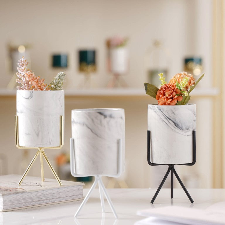 The simple yet refined ceramic planter with a marble texture surface is a must-have for all plant enthusiasts. The planter comes with a stylish metal stand of different color variant that exhibits the greens to its best.