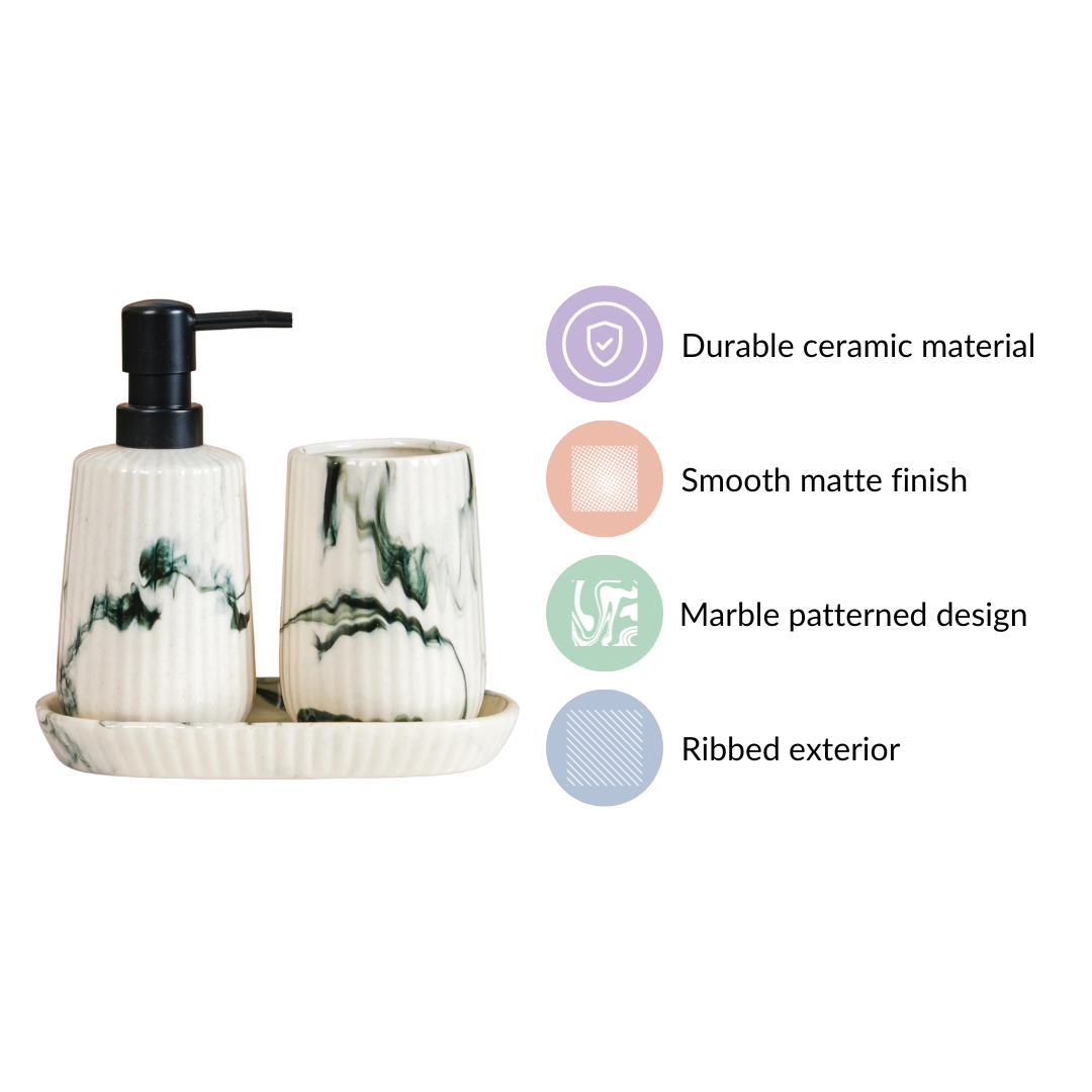 The black marble-patterned bathroom set containing a refillable dispenser, tumbler, and ceramic tray not only enhances your bathroom's organization but also adds sophistication and elegance to your space, transforming the overall ambience of your bathroom.
