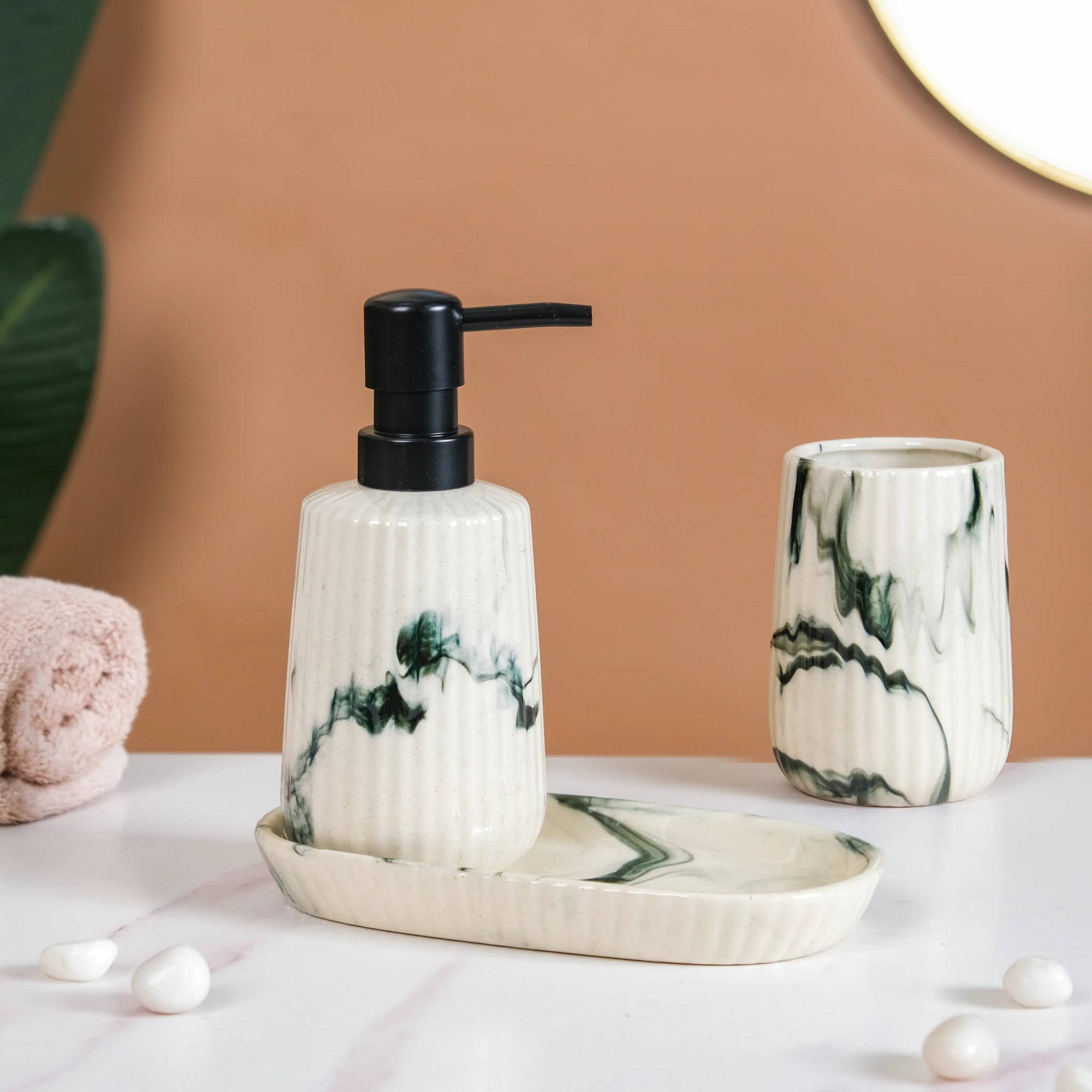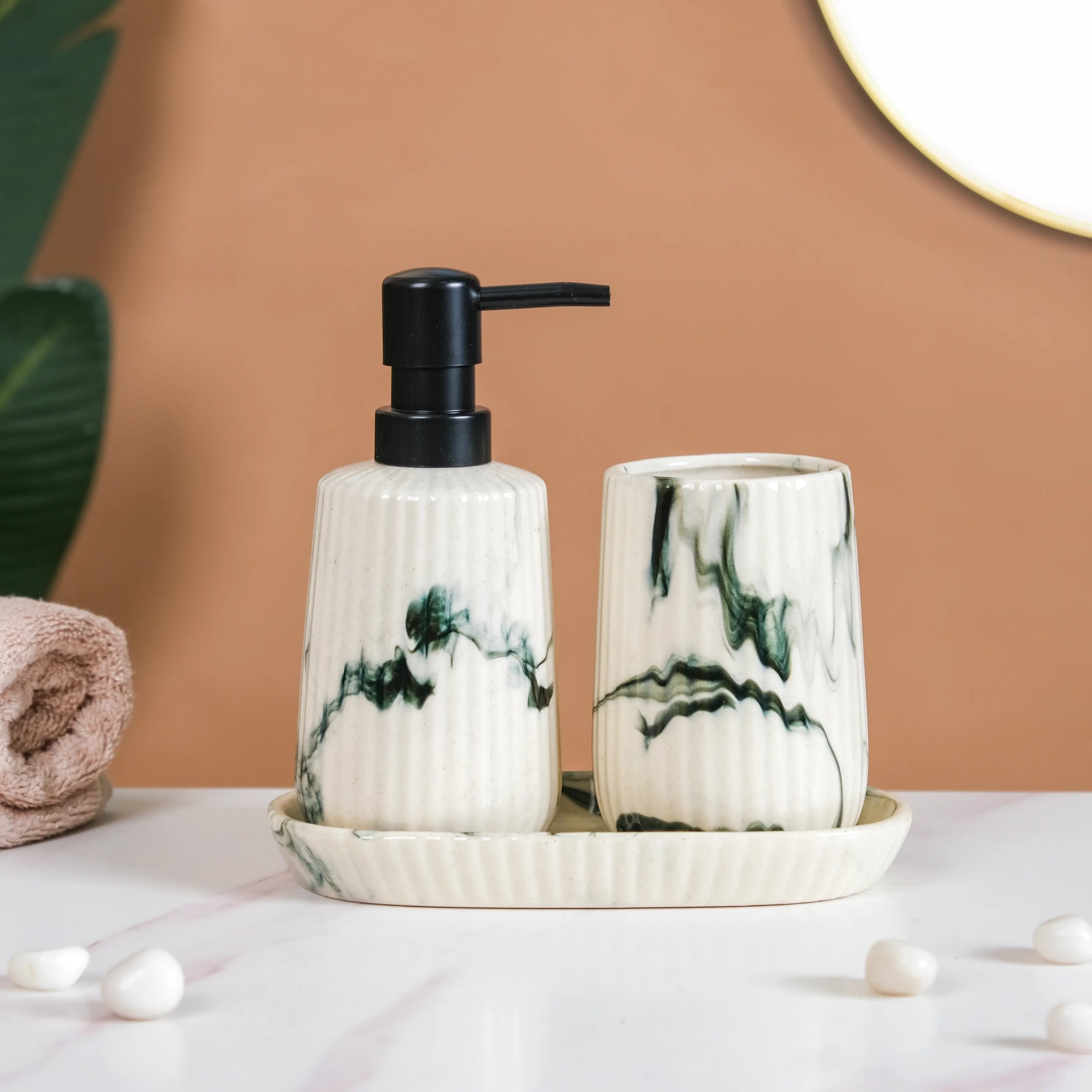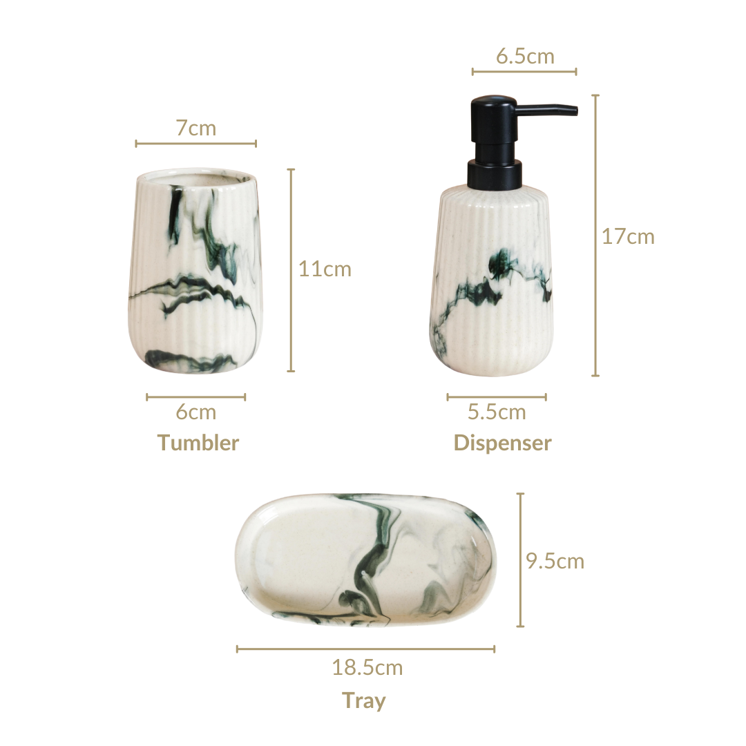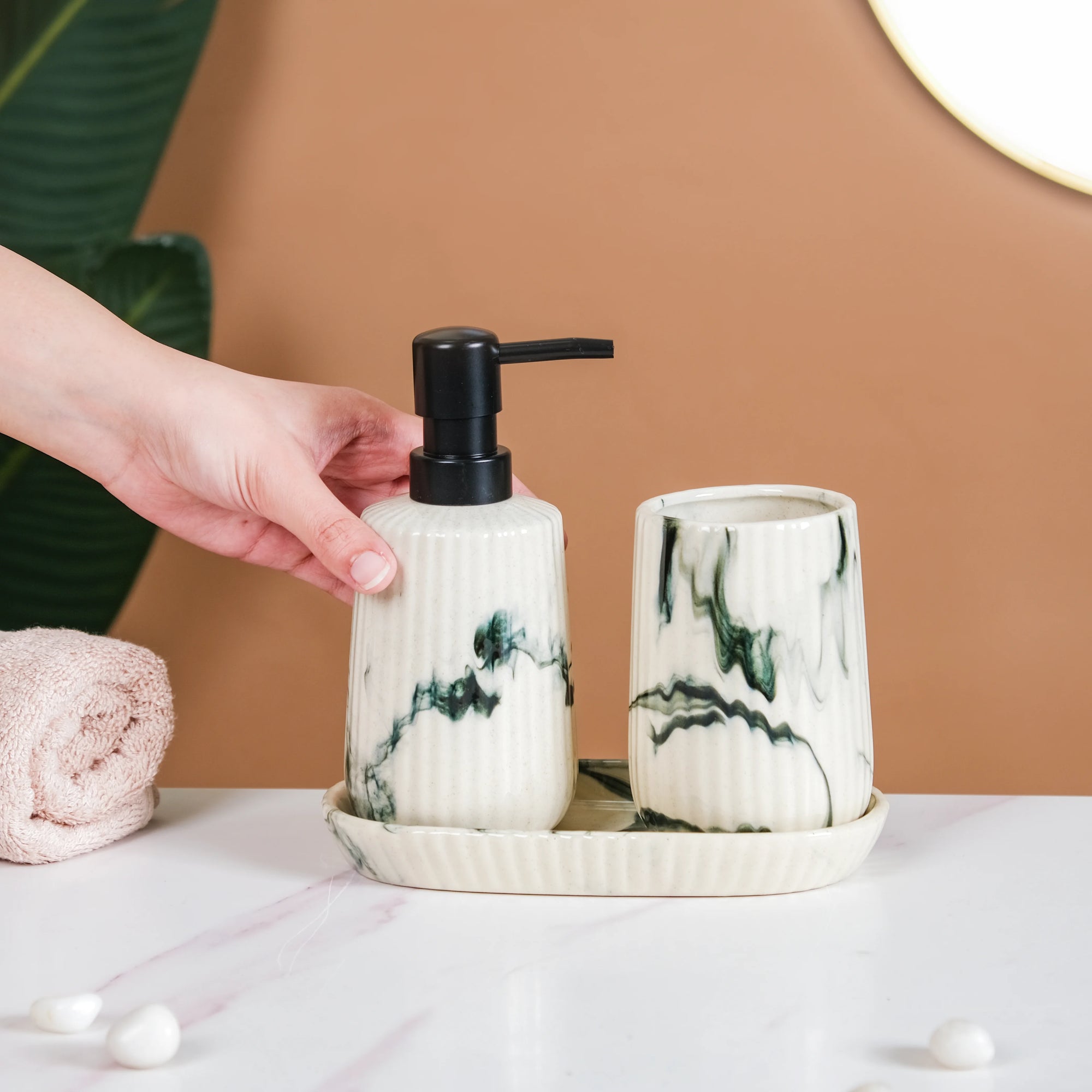 The ceramic tray included in the set helps you keep your bathroom essentials organized and within easy reach. It adds an elegant touch while simplifying your daily routine. Meanwhile, you can use the ceramic tumbler to keep your toothbrushes and other such essentials that you need in your morning routine. The ceramic dispenser with an easy pump makes hand washing more hygienic, eco-friendly and effortless.