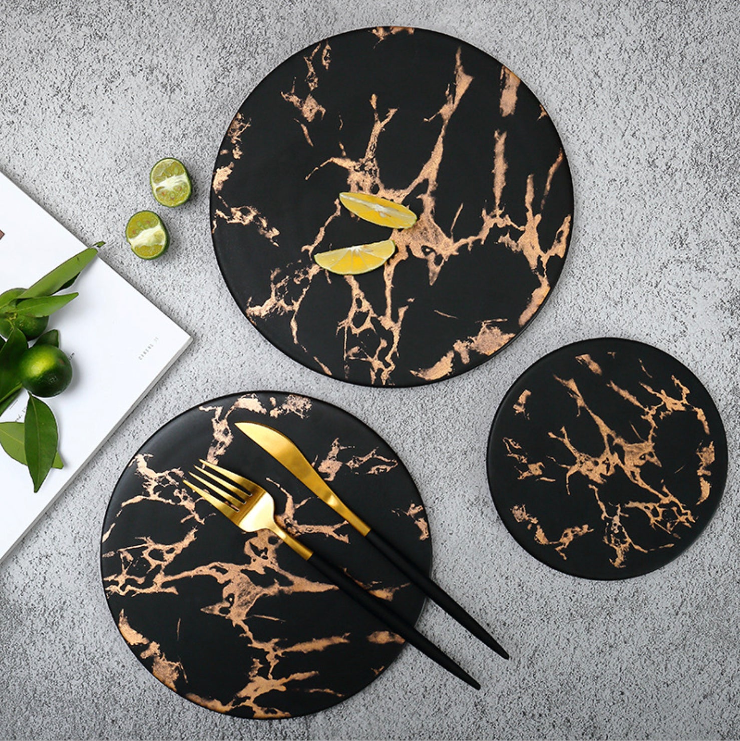 Marble Round Serving Plate in black and gold for the party table. It will add elegance to the setting. The overlay of gold on the black base speaks a luxe language.