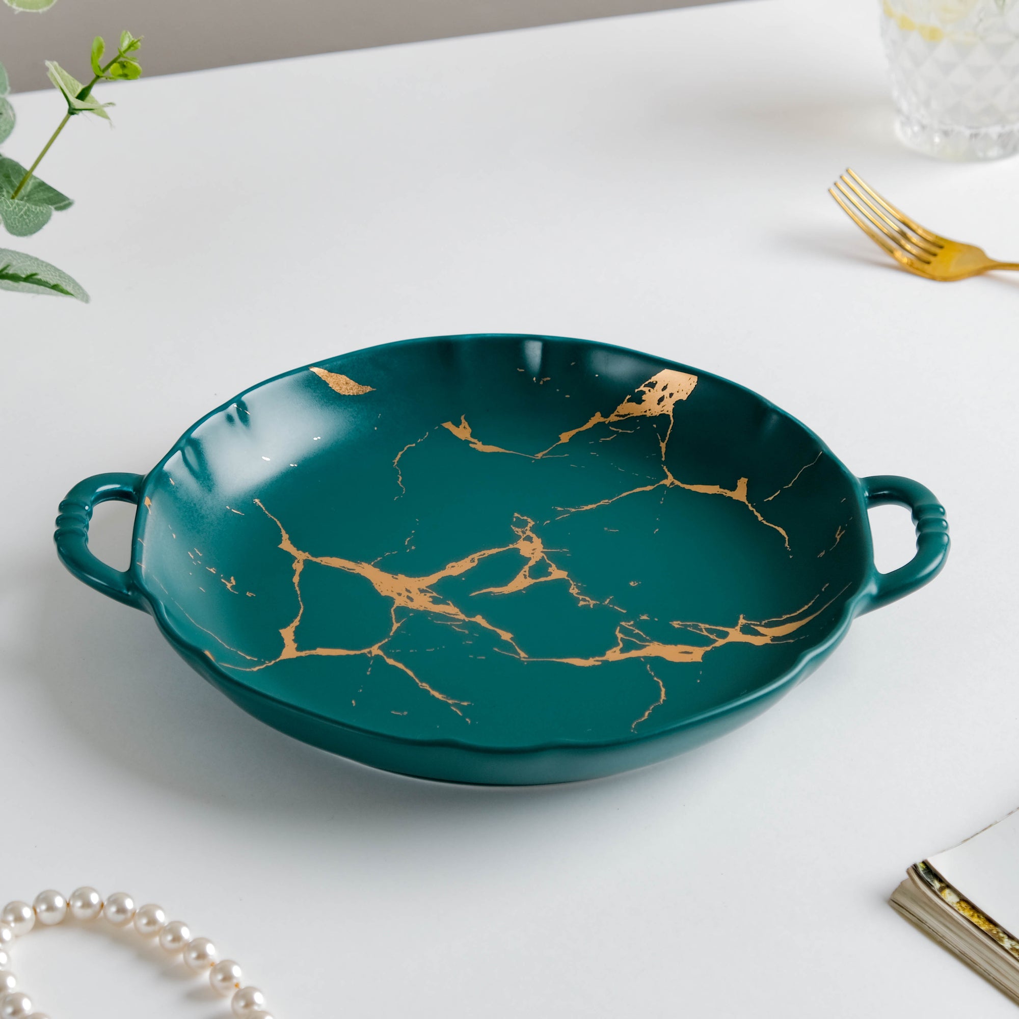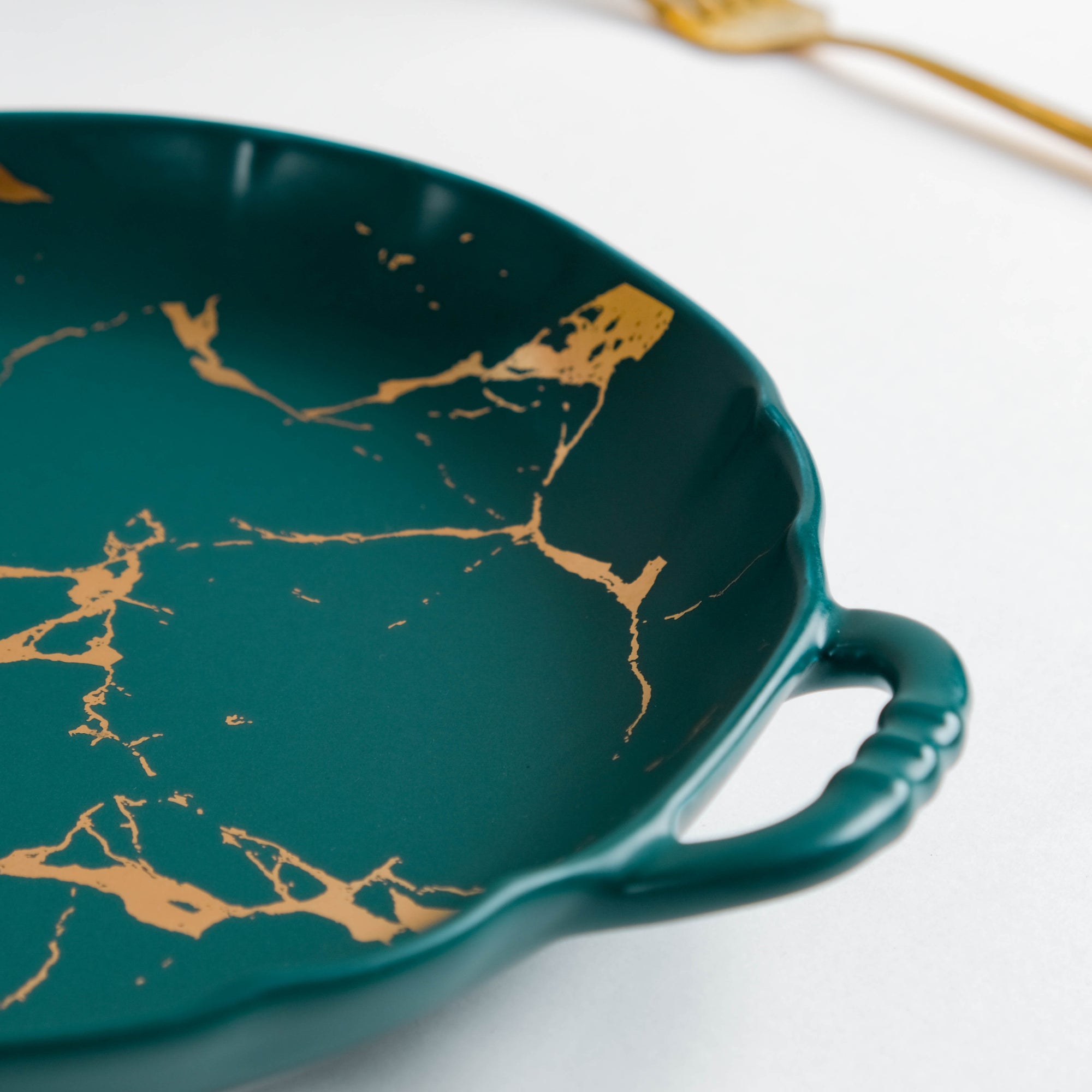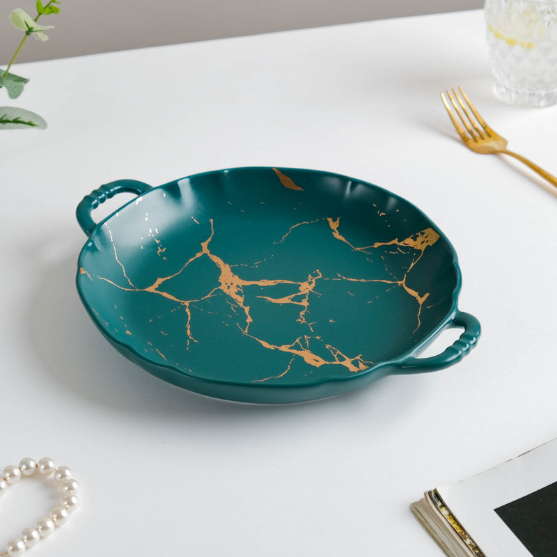 The round marble tray is a versatile complement to any collection of home décor. The gold detailed ceramic platter with handles offers a distinct look that is sure to spark discussion. Its wavy rim and the amazing color are sure to grab the attention of the guests in an instant. To create a calming touch to your layout, one can add a candle and some incense sticks. It's also suitable for serving snacks and desserts. Use it as a cake stand by turning it upside down.