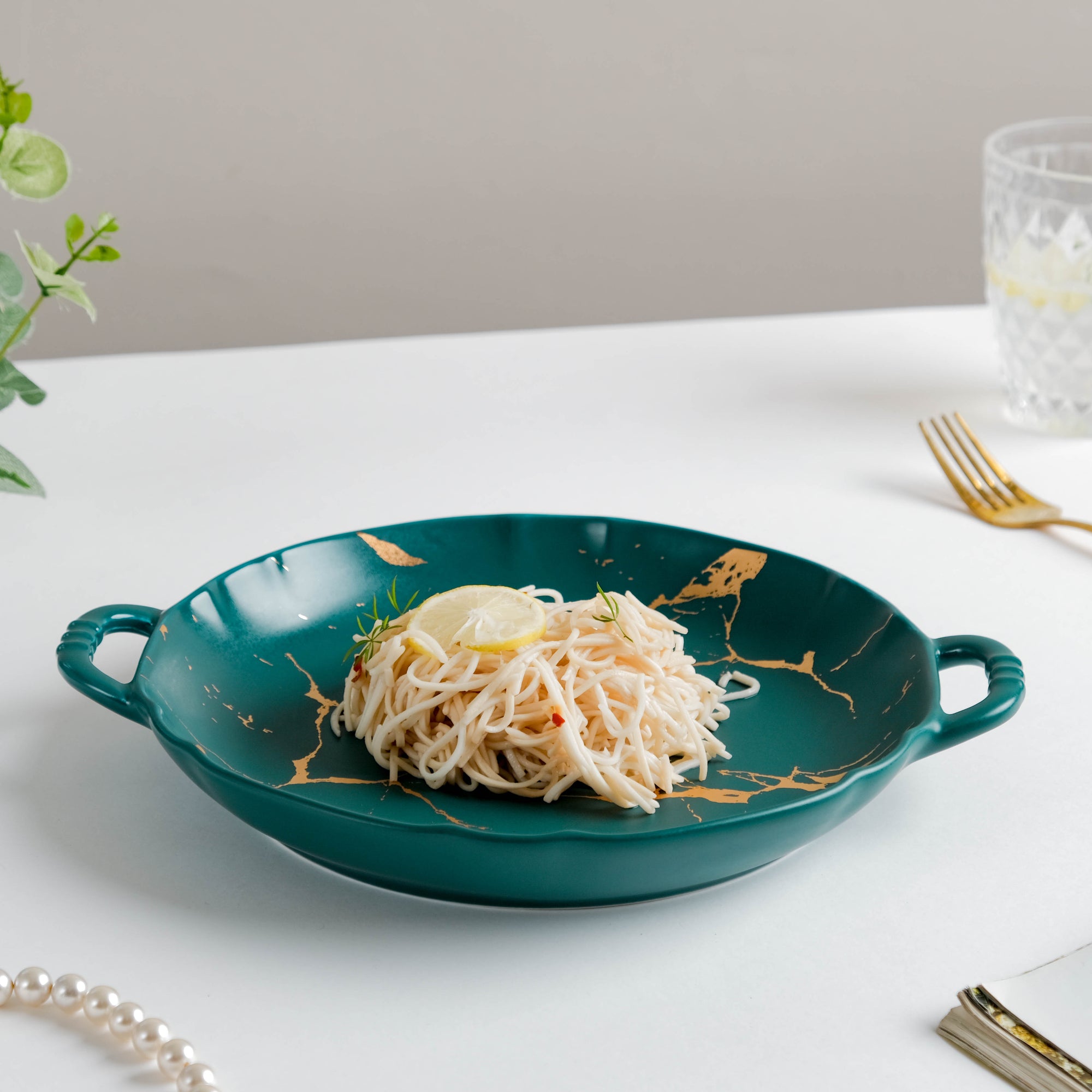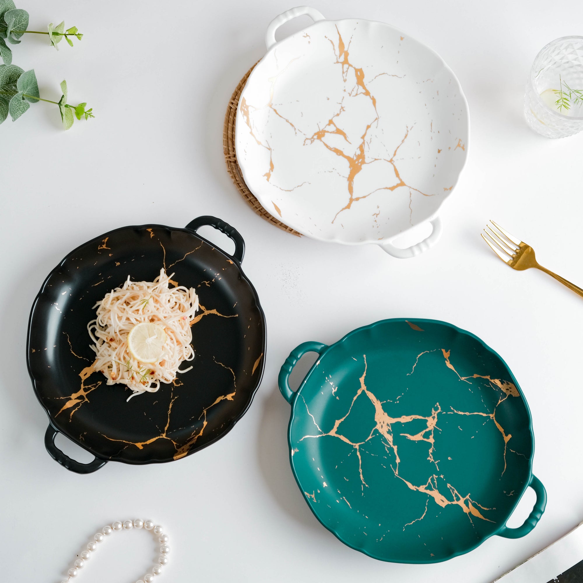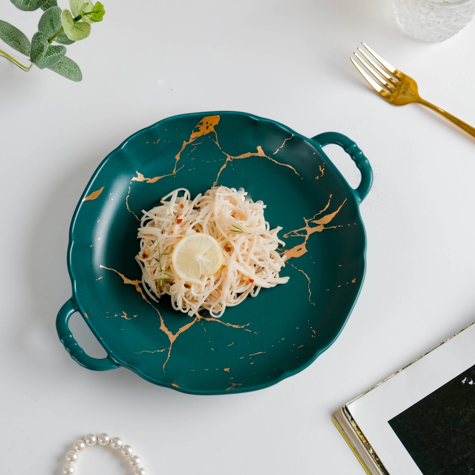 The round marble tray is a versatile complement to any collection of home décor. The gold detailed ceramic platter with handles offers a distinct look that is sure to spark discussion. Its wavy rim and the amazing color are sure to grab the attention of the guests in an instant. To create a calming touch to your layout, one can add a candle and some incense sticks. It's also suitable for serving snacks and desserts. Use it as a cake stand by turning it upside down.