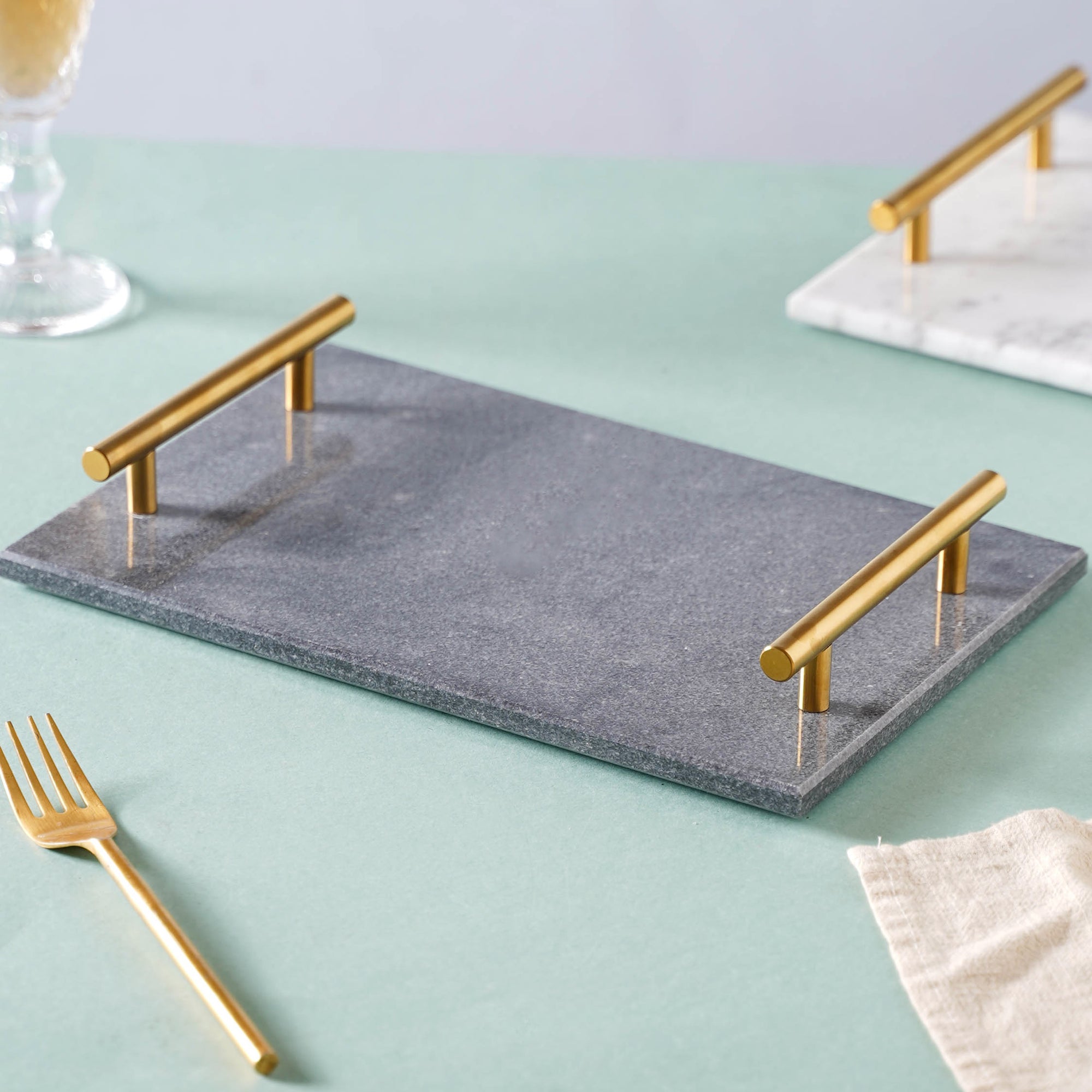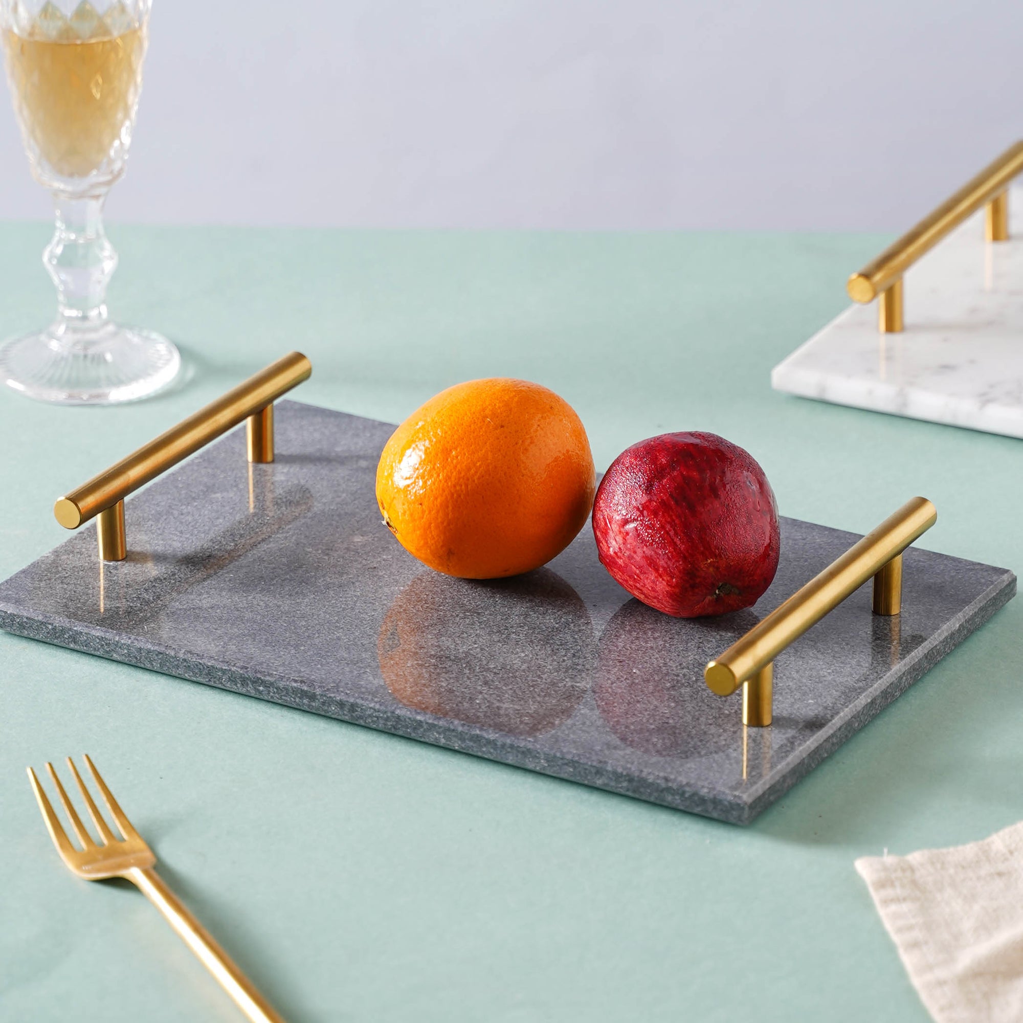The marble serving tray has a gloss finish which compliments most other crockeries. Use it to serve bright colored fruits or cupcakes. The sleek gold handles gives it a touch of modernity. Nestip: Place candles on top for a warm and elegant vibe. Size: White: With handle- 6cm H Marble tray- 30.5cm L x 20.5cm B x 2cm H Black: With handle- 6cm H Marble tray- 30.5cm L x 20.5cm B x 2cm H Color: White, black and gold Material: Marble and metal Products included: 1 marble tray with metal handle Style: White: LJSF47S33 Black: LJSF47S34