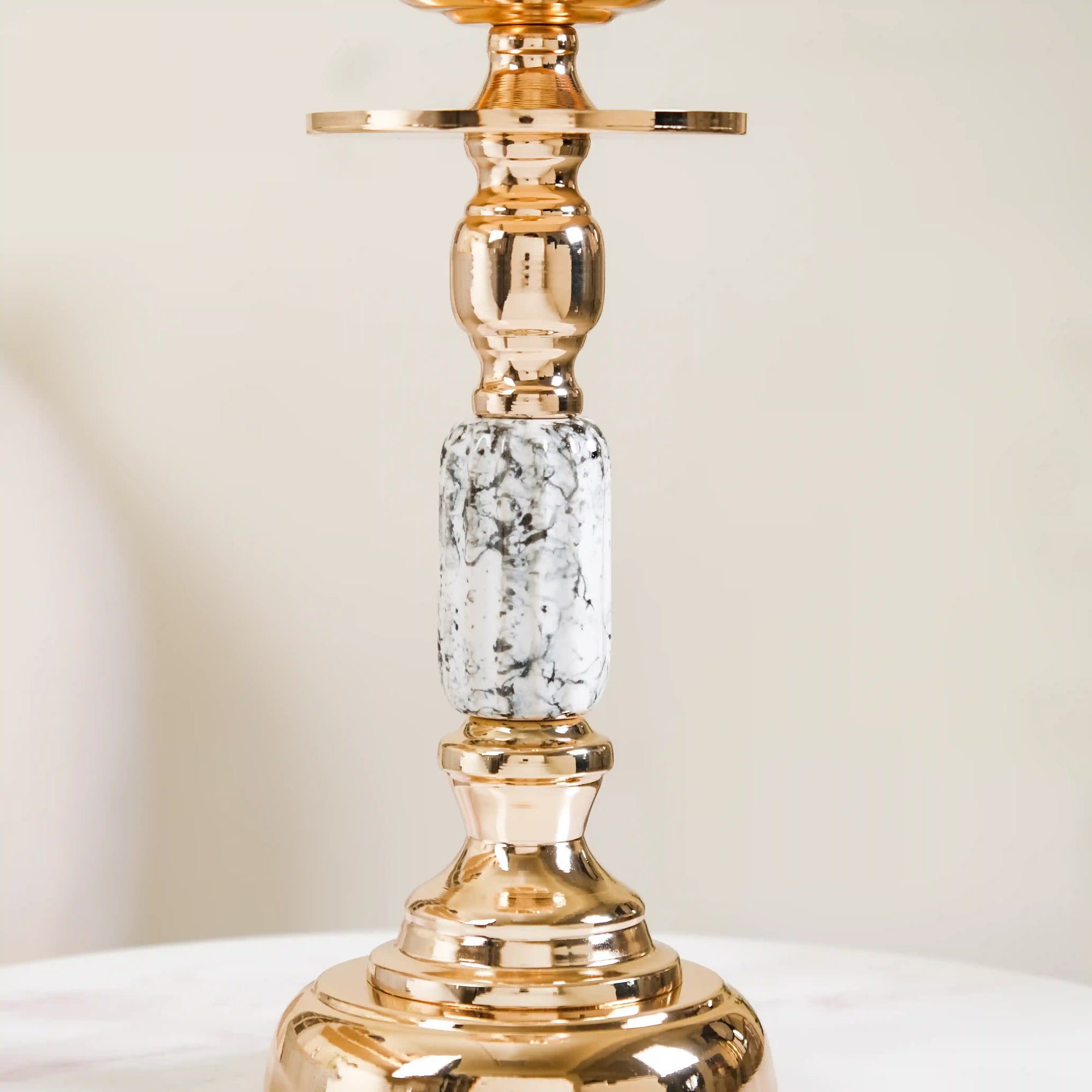 With its intricate details and delicate craftsmanship, this candle holder evokes the grandeur of a bygone era, reminiscent of opulent palace interiors and regal banquets. Its golden glass shimmers with an ethereal radiance, imbuing any setting with an air of majesty and prestige. Its glass surface, with a tinted hue, tells a story of vintage allure and authenticity. The intricate detailing of the candle holders adds character and depth, serving as a testament to its enduring beauty.