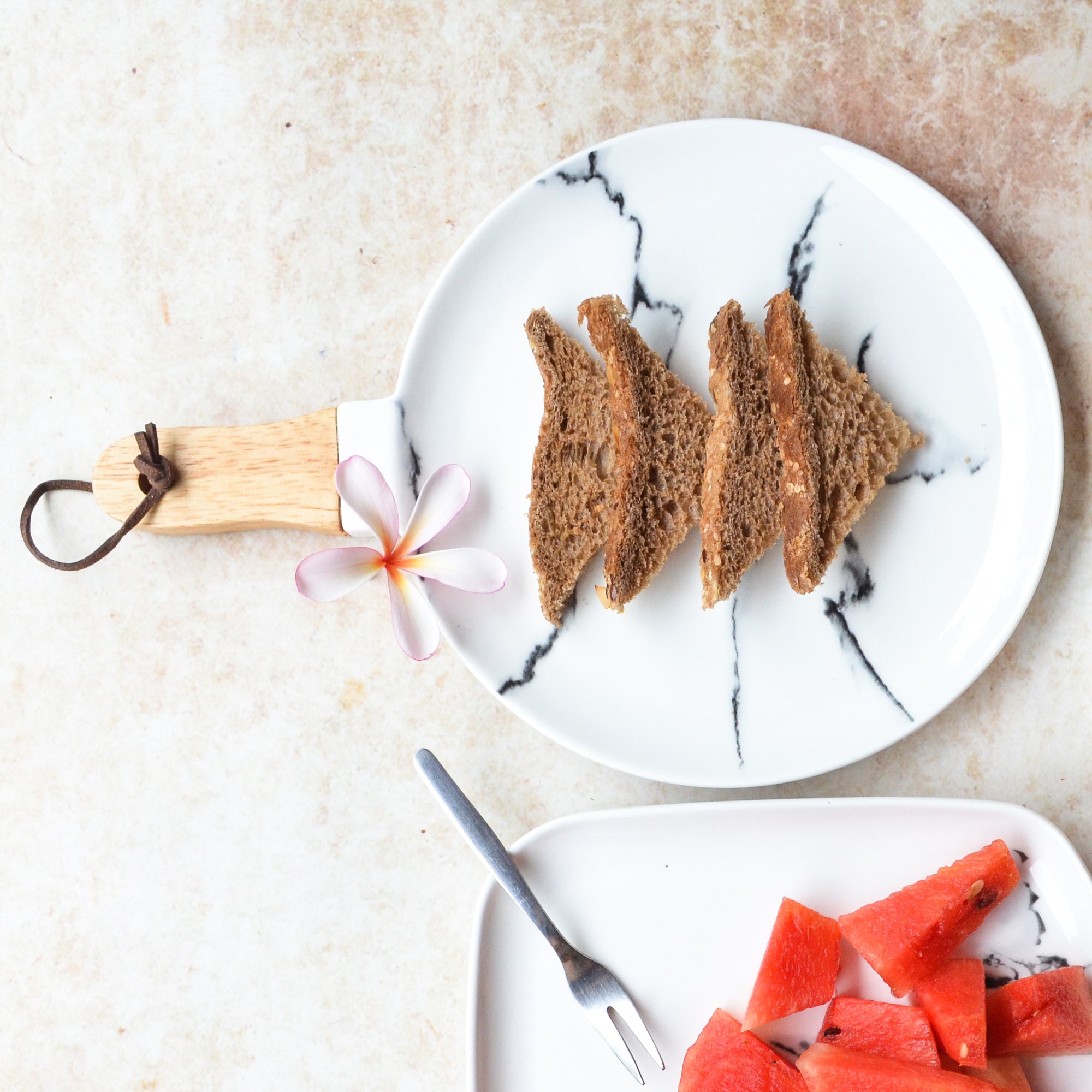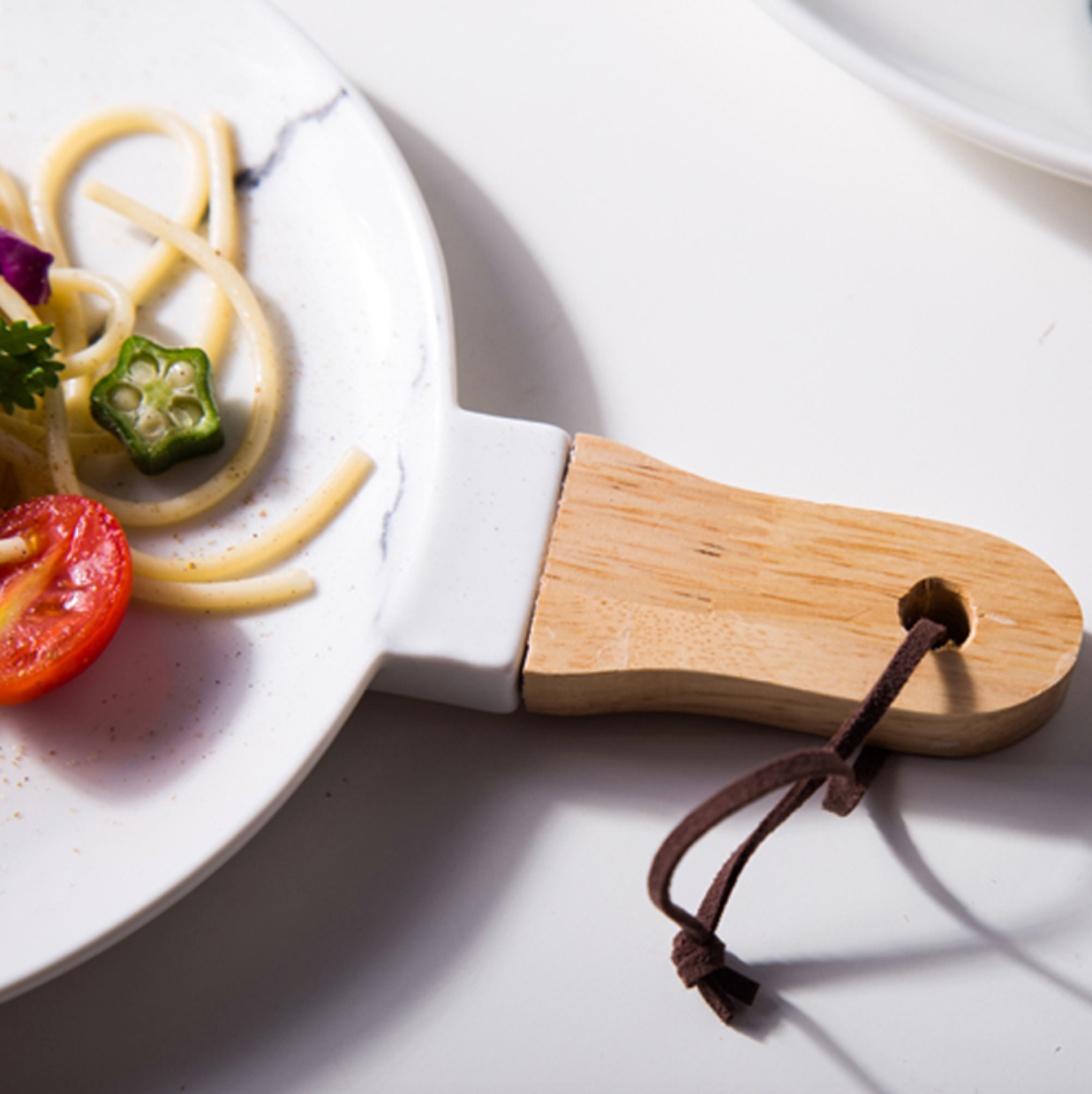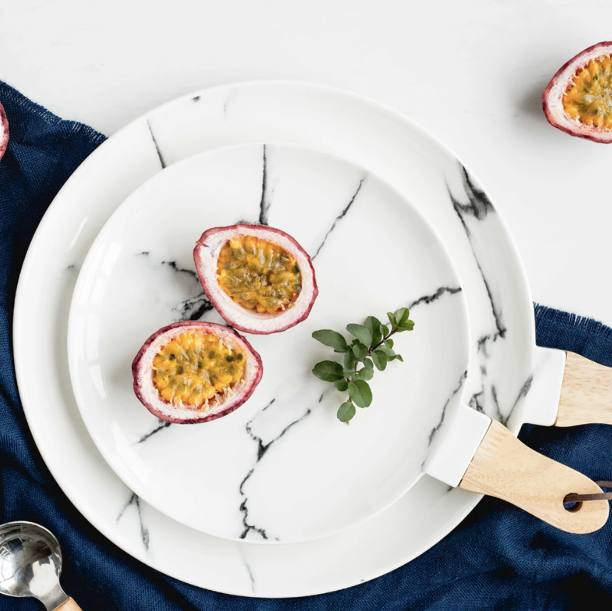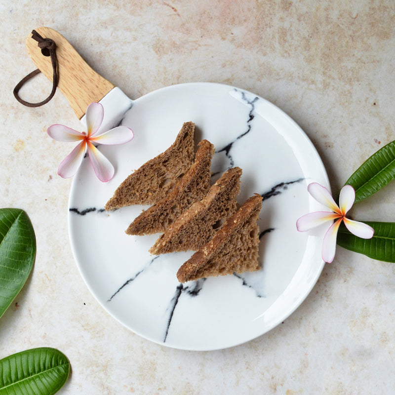 Chiceramic round platter with wooden handle, great for single serve dinner plates for guests or simply to serve up salads, roasts or snacks.