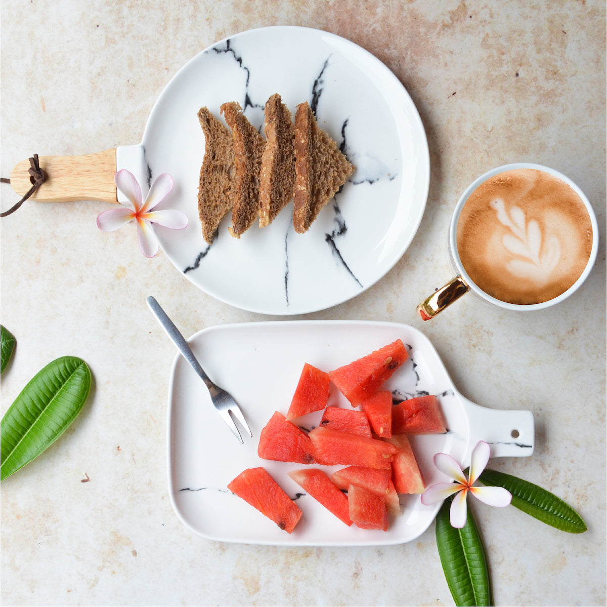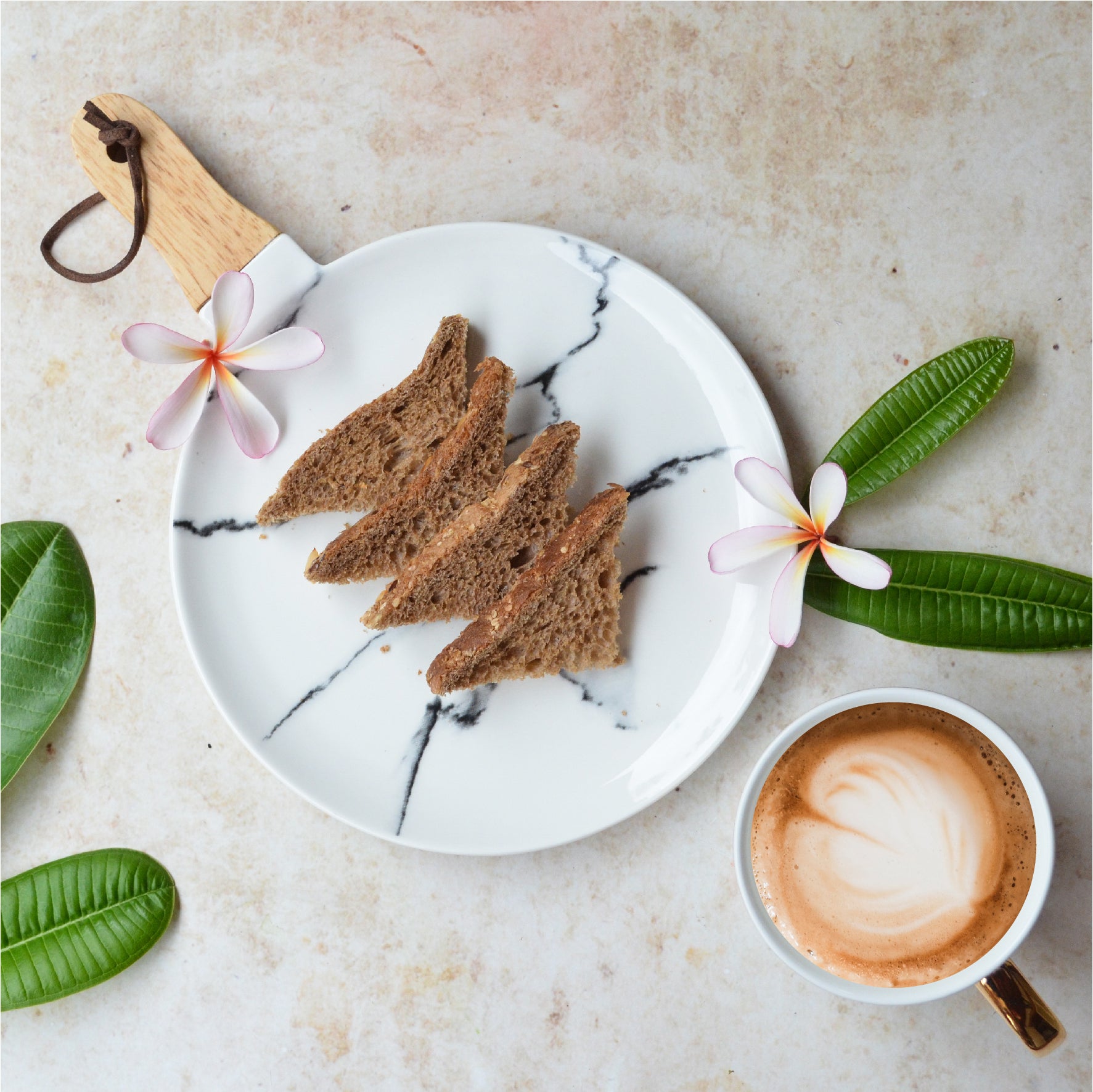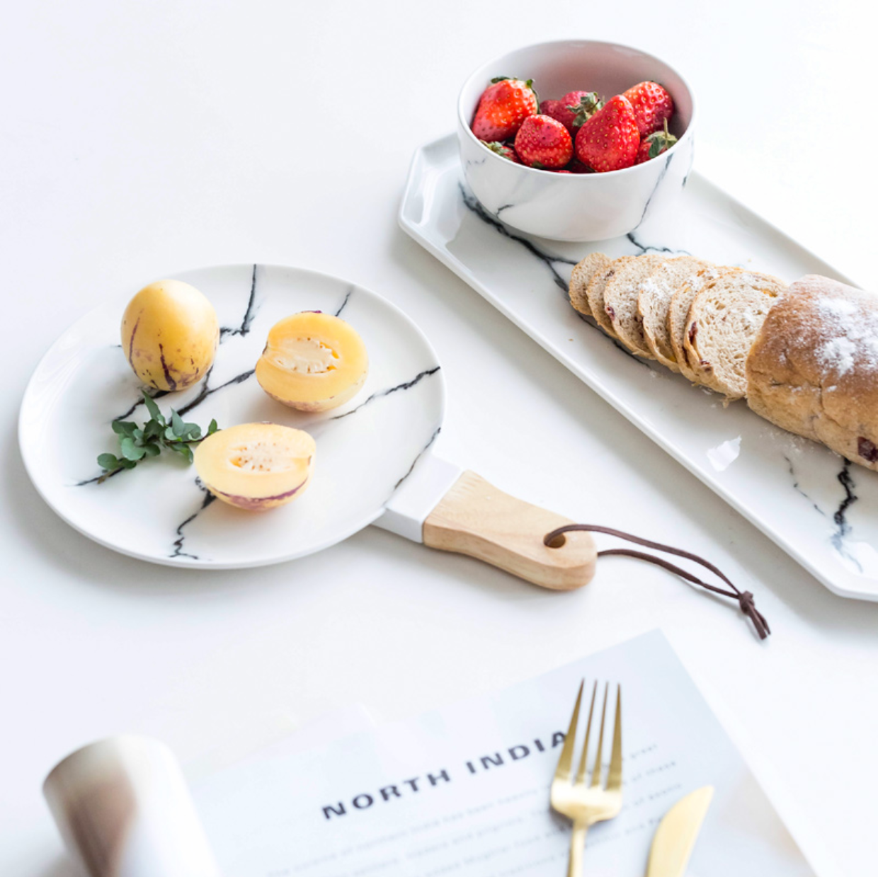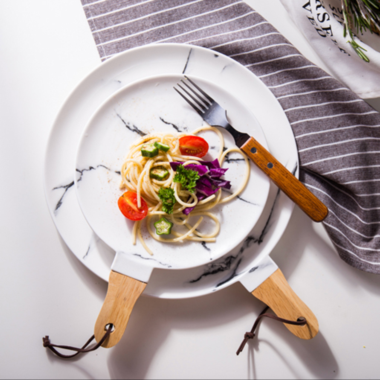 Chiceramic round platter with wooden handle, great for single serve dinner plates for guests or simply to serve up salads, roasts or snacks.