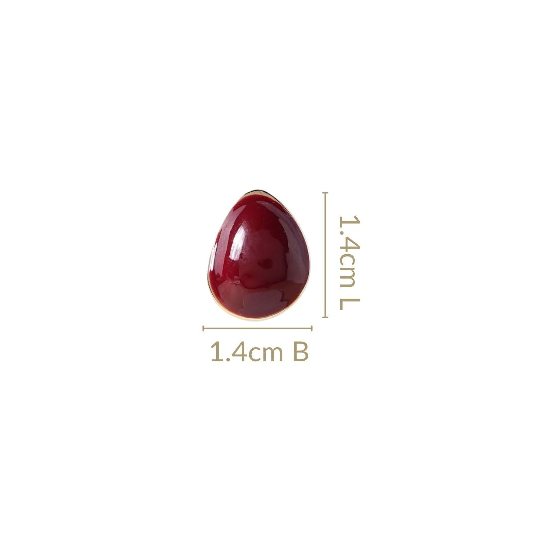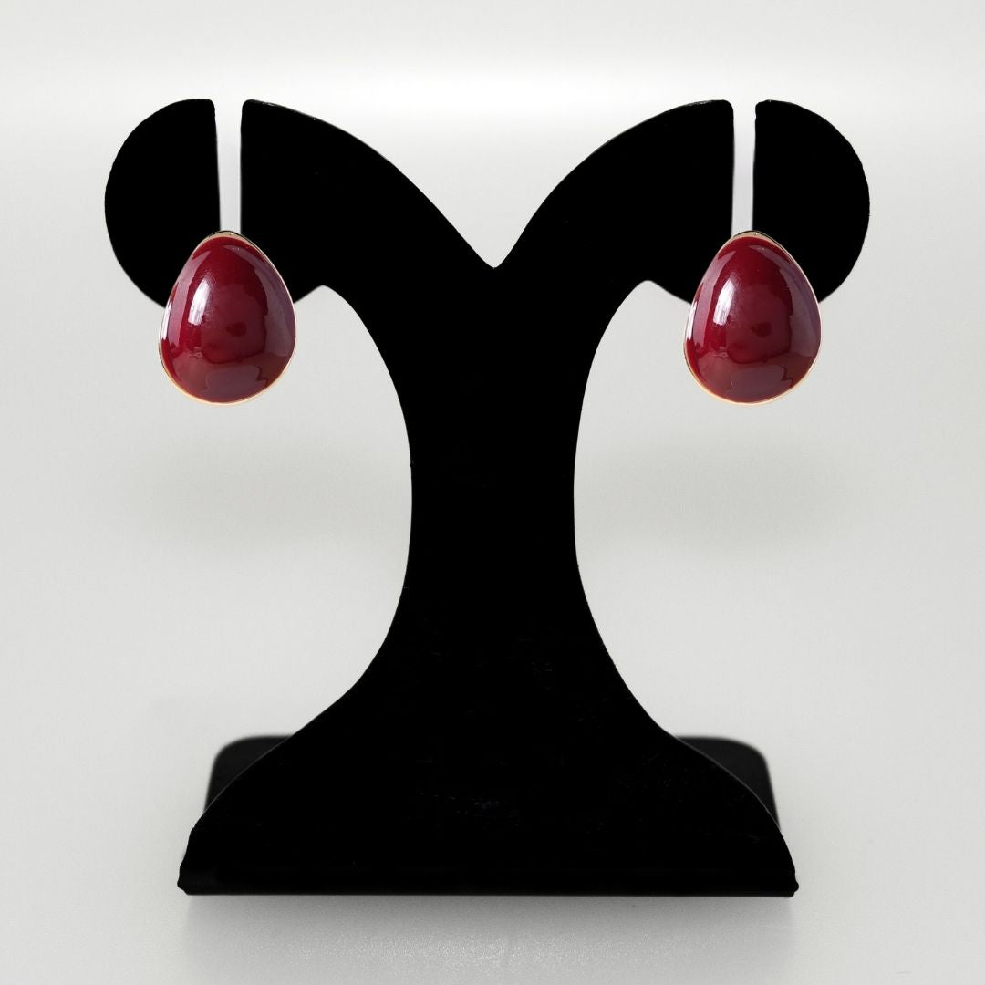 Bring a touch of elegance to your style with these beautifully crafted stud earrings. Featuring a maroon resin base shaped like an egg or drop, they are elegantly bordered with gold metal, creating a stunning contrast that exudes both charm and sophistication.