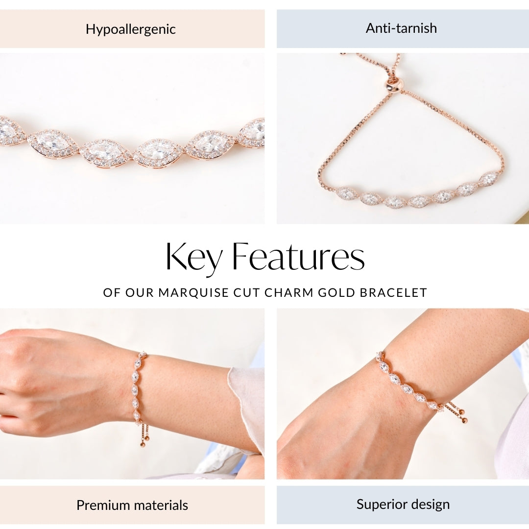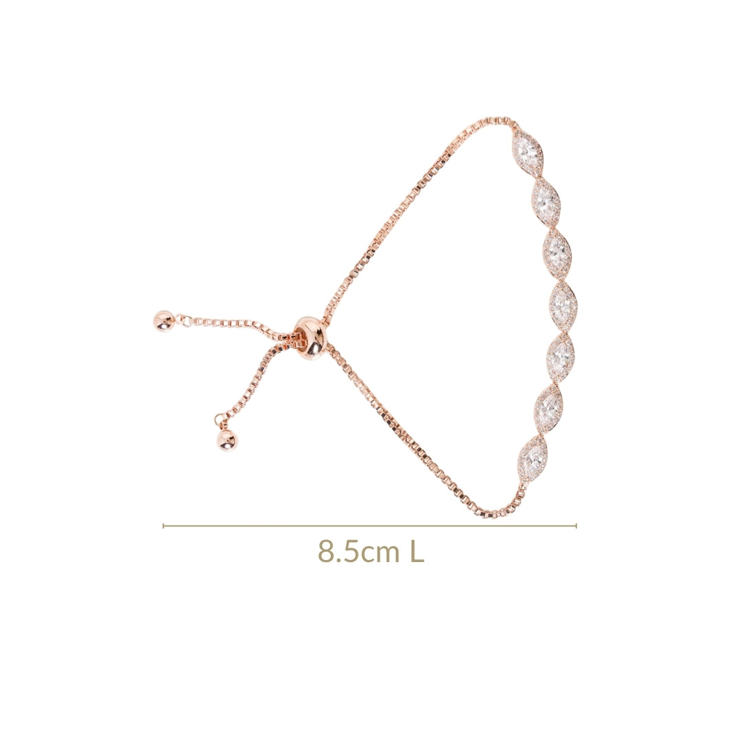 Boasting a seamless blend of elegance and sparkle, the rose gold bracelet brings sophistication to any look. The delicate chain is adorned with stone-studded charms in a stunning marquise cut, each gleaming with a refined radiance. With its adjustable metal chain, this charm bracelet offers a customisable fit for ultimate comfort. Whether for daily wear or special occasions, its versatile design makes it an ideal accessory. Perfect for gifting or treating yourself to a timeless piece that complements any style.
