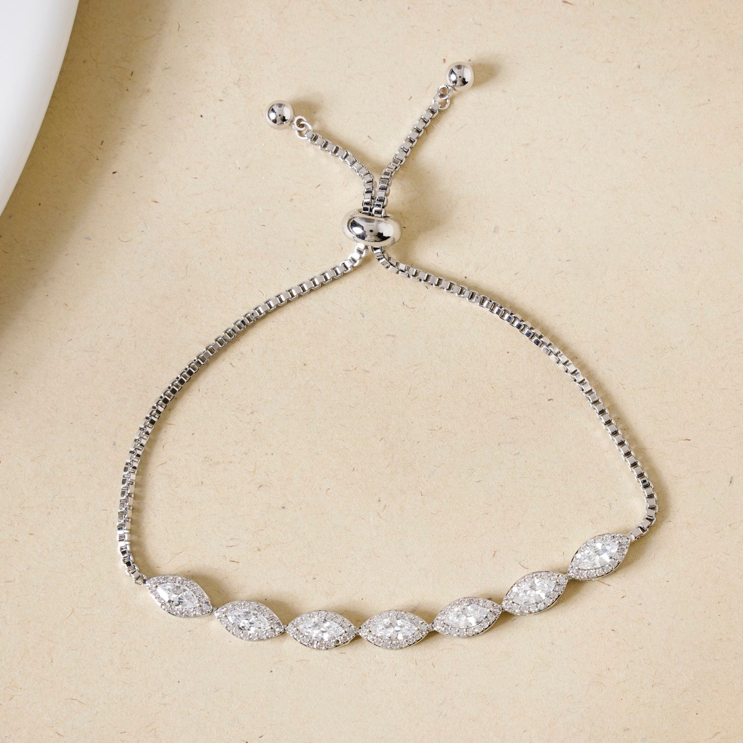 Dazzling with glamour, the dark silver bracelet showcases stone-studded charms in a beautiful marquise cut. The carefully arranged stones catch the light, creating a refined and captivating look. Designed with an adjustable metal chain, it offers a comfortable fit for most wrist sizes. Perfect for adding a touch of sophistication to both casual and formal outfits, this charm bracelet is a versatile and timeless accessory that complements any style with ease.