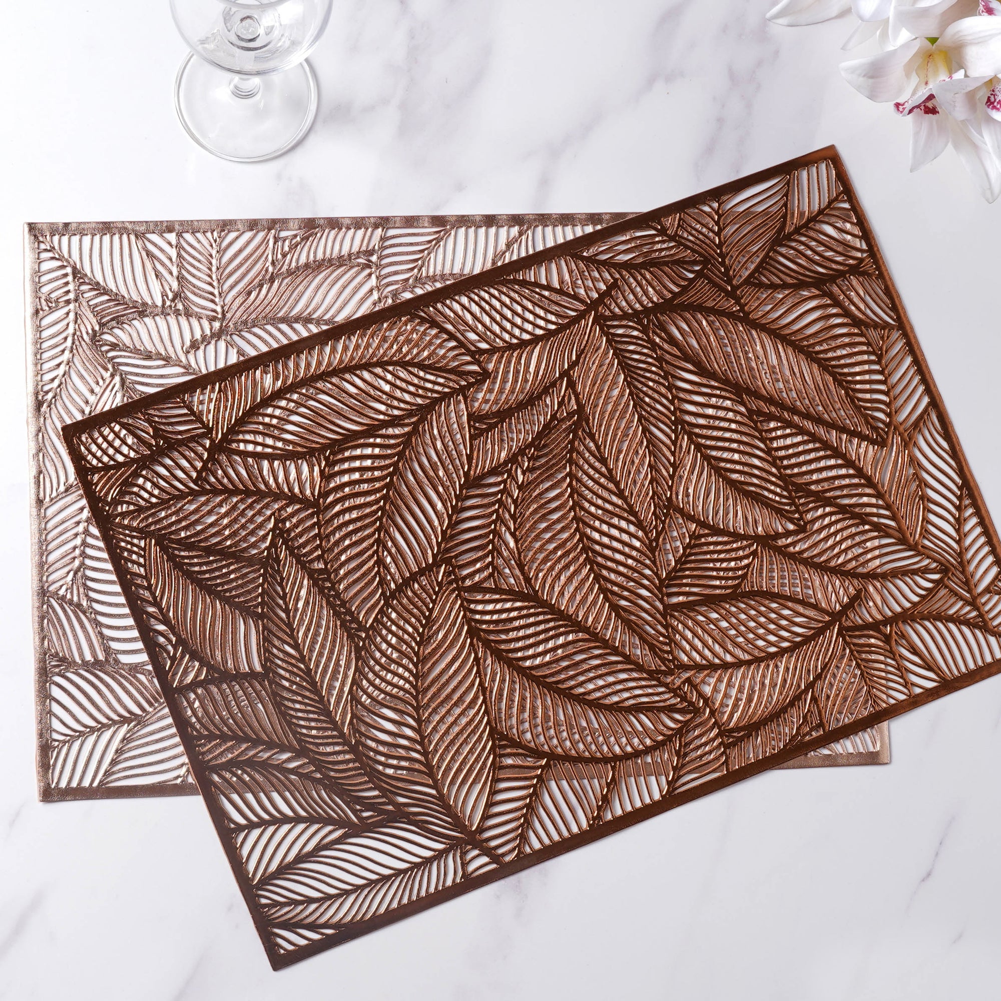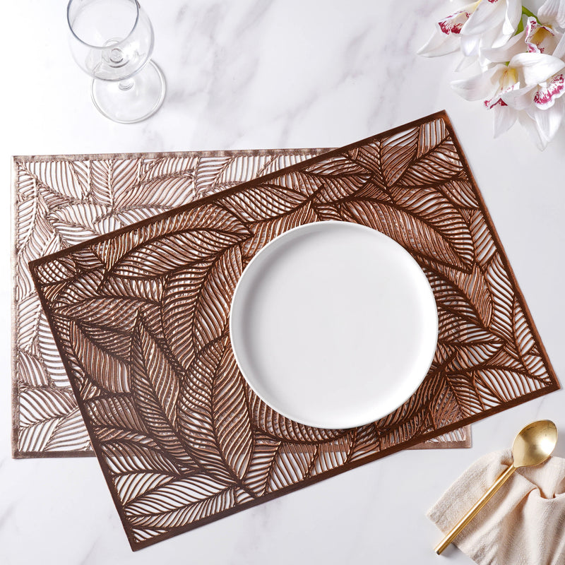 Rectangular table mat or placemat that is available in two unique and sophisticated colours. The mats are easy to place, clean and store and protect the table against heat damage, scratches, food spills and water marks. The distinctive leaf-like pattern exudes exclusivity and refinement that makes the mat a perfect choice for both formal and informal occasions.