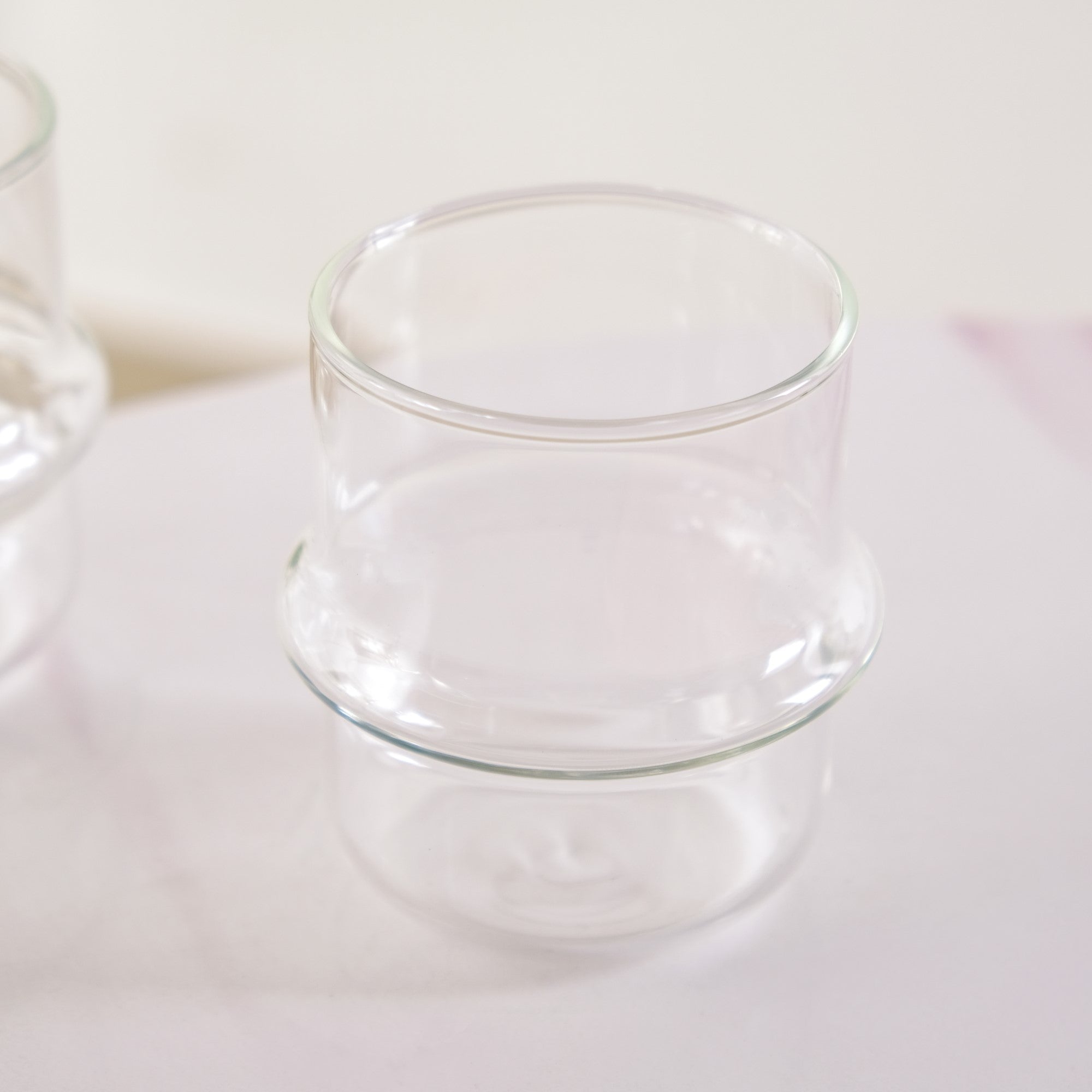 Design: These borosilicate glass tumblers feature a distinctive, softly contoured silhouette defined by a subtle central bulge that creates a ridge around the midsection. The form transitions smoothly from a slightly narrower base to a wider middle before gently tapering again toward the rim. With rounded edges, the seamless shape gives the tumblers a polished, cohesive look. Their smooth, clear surface keeps the focus on the clean lines and organic curvature, while the delicately rounded rim maintains visual softness and structural continuity throughout the design.