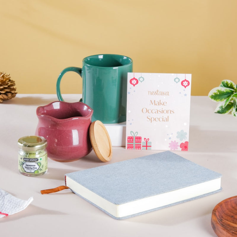 If you know a friend who's just about to start the journey of their working life, this hamper is the perfect gifting choice for him/her this Christmas. The hamper consists of all that one needs to set up the desk- a beautiful planter to add freshness to the ambiance, a notebook with 128 pages to keep a track of your daily updates and a ceramic mug since coffee saves the day!