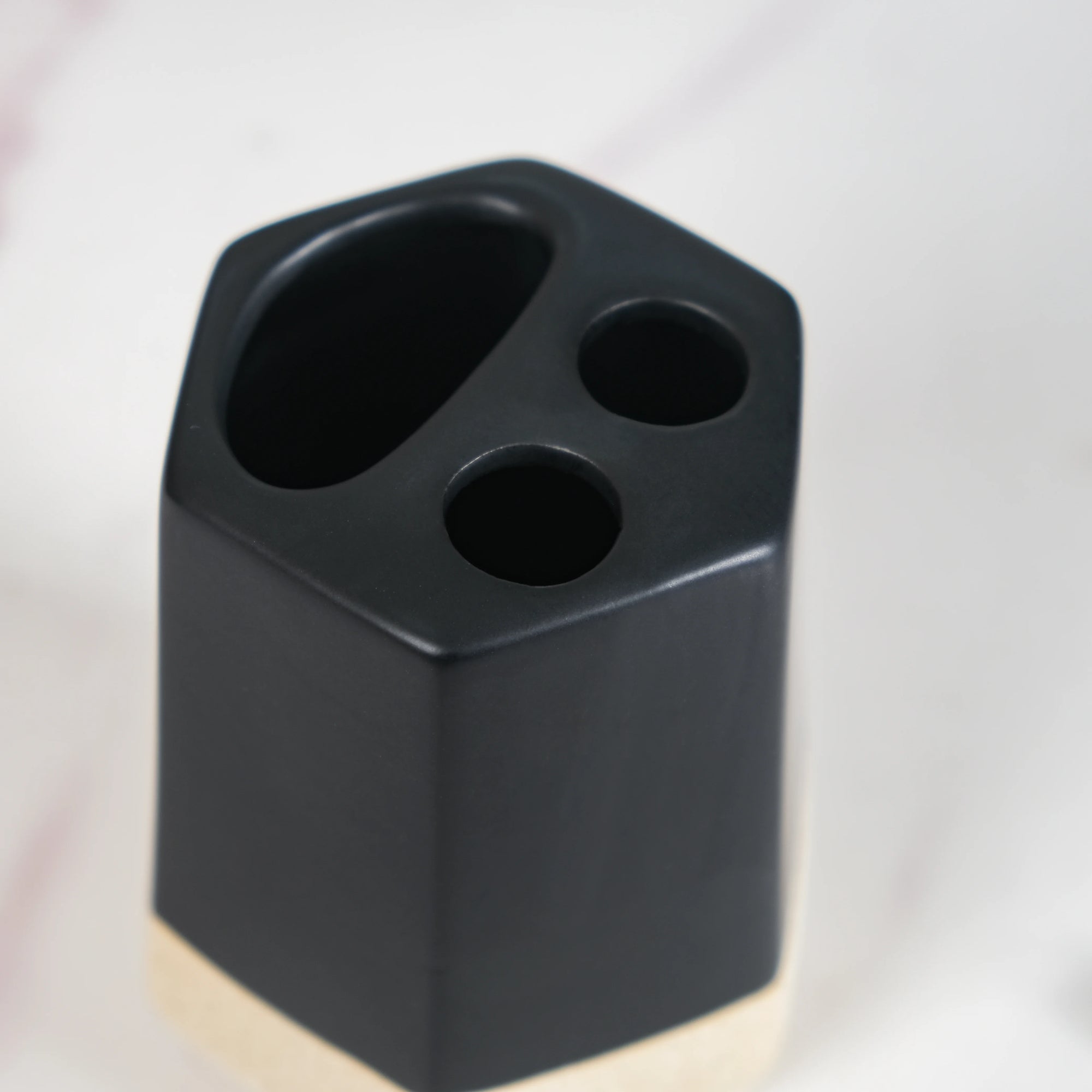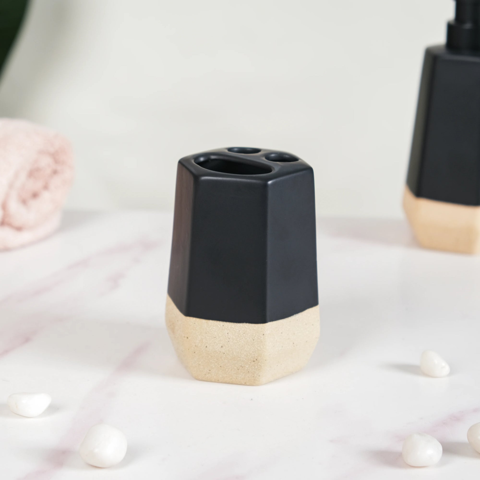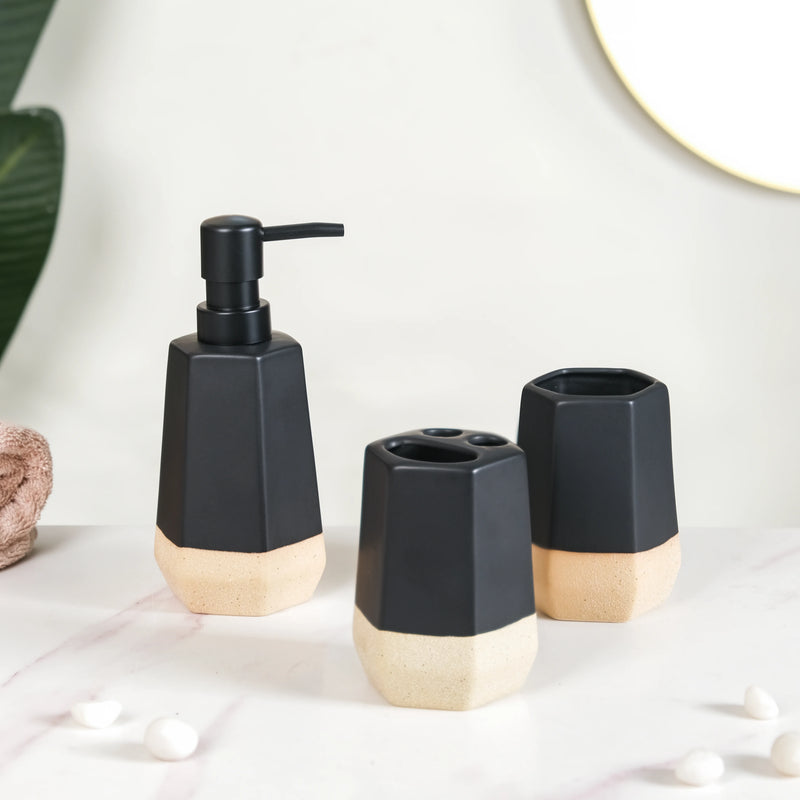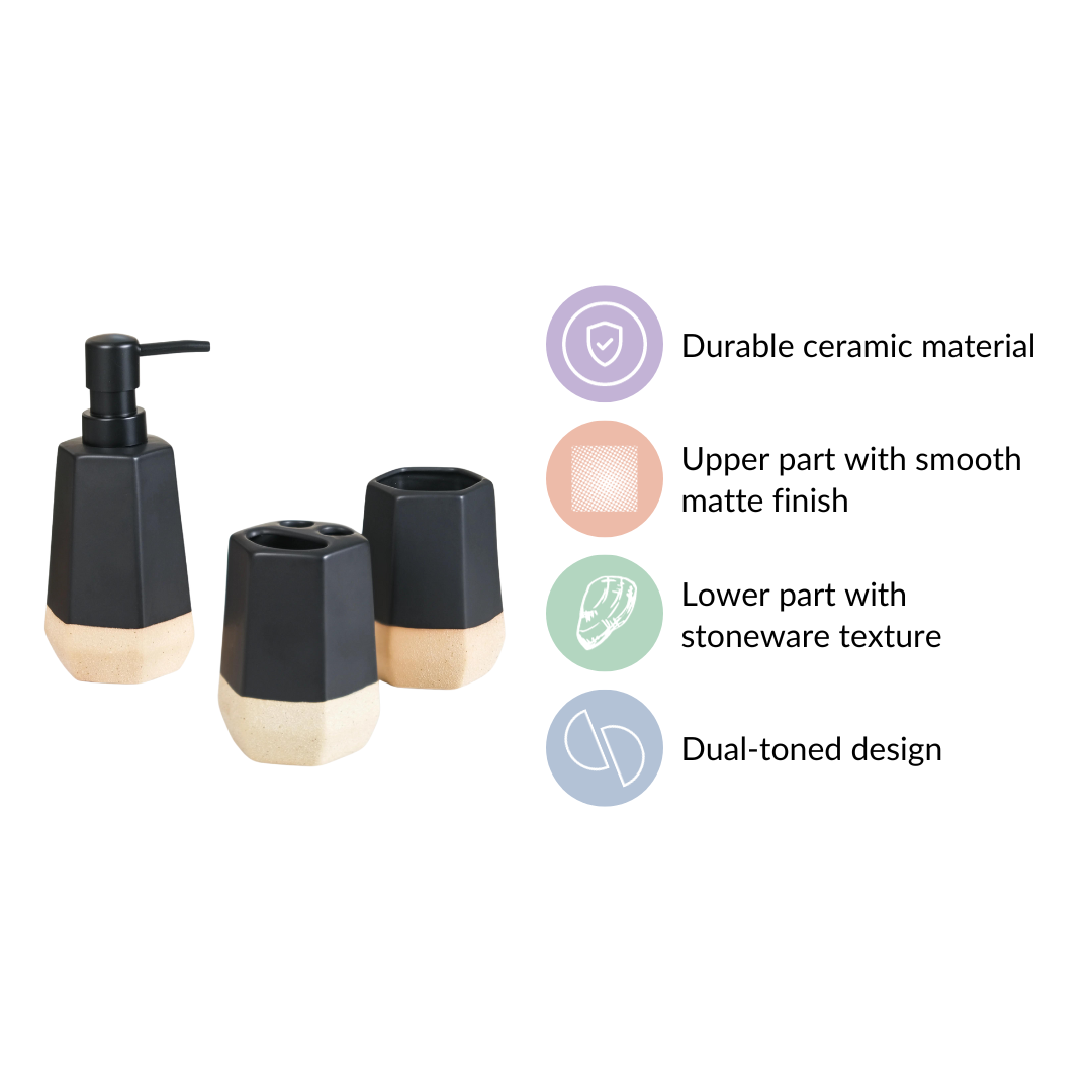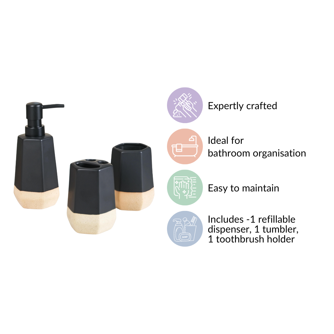 Our bathroom accessories set not only offers functionality but also elevates your bathroom's aesthetic appeal. The premium ceramic construction, along with the black and beige colour scheme, exudes sophistication and timeless style. The smooth matte finish adds a touch of luxury, making your bathroom feel like a stylish oasis.