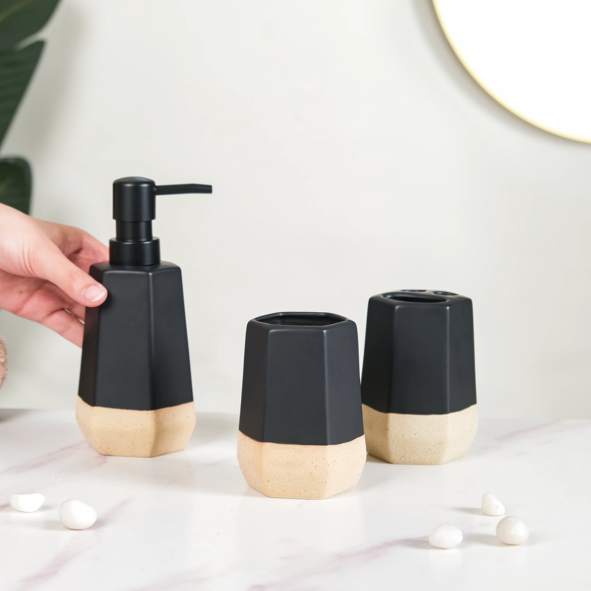 This bath set includes three essential items: a soap dispenser with a convenient pump, a chic ceramic tumbler, and a toothbrush holder. Each item is thoughtfully designed to enhance bathroom organization. The soap dispenser ensures easy access to soap, while the tumbler can hold toothbrushes or other essentials. The toothbrush holder features intelligently partitioned sections, allowing you to neatly separate and store toothbrushes, toothpaste, and other items.