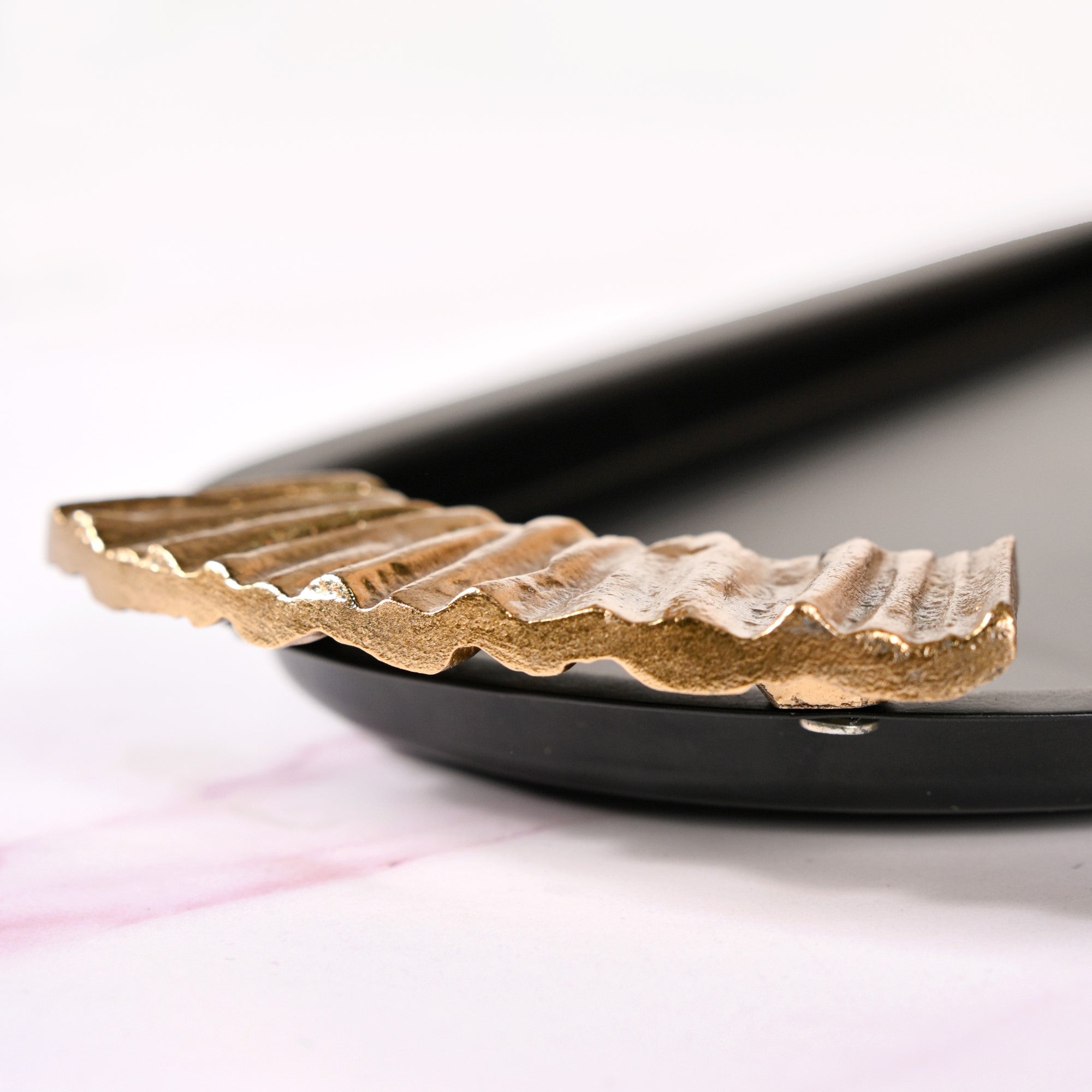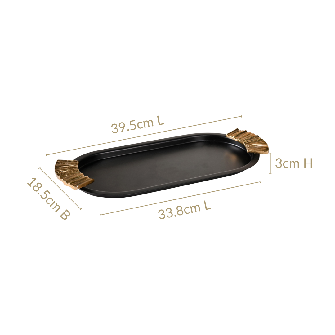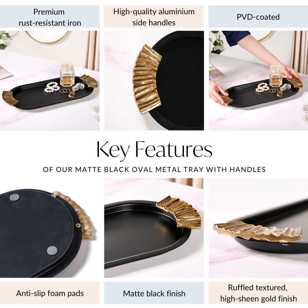 Design: Meticulously crafted with attention to detail, this serving tray features a matte black iron base, creating a bold and timeless aesthetic. The side handles, made from durable aluminium, bring a touch of opulence with its gold finish and ruffle texture while ensuring a secure grip, making it easier to serve. The anti-slip foam pads at the bottom protect your surfaces while offering stability and preventing the tray from sliding around, making it the perfect metal tray for everyday use.