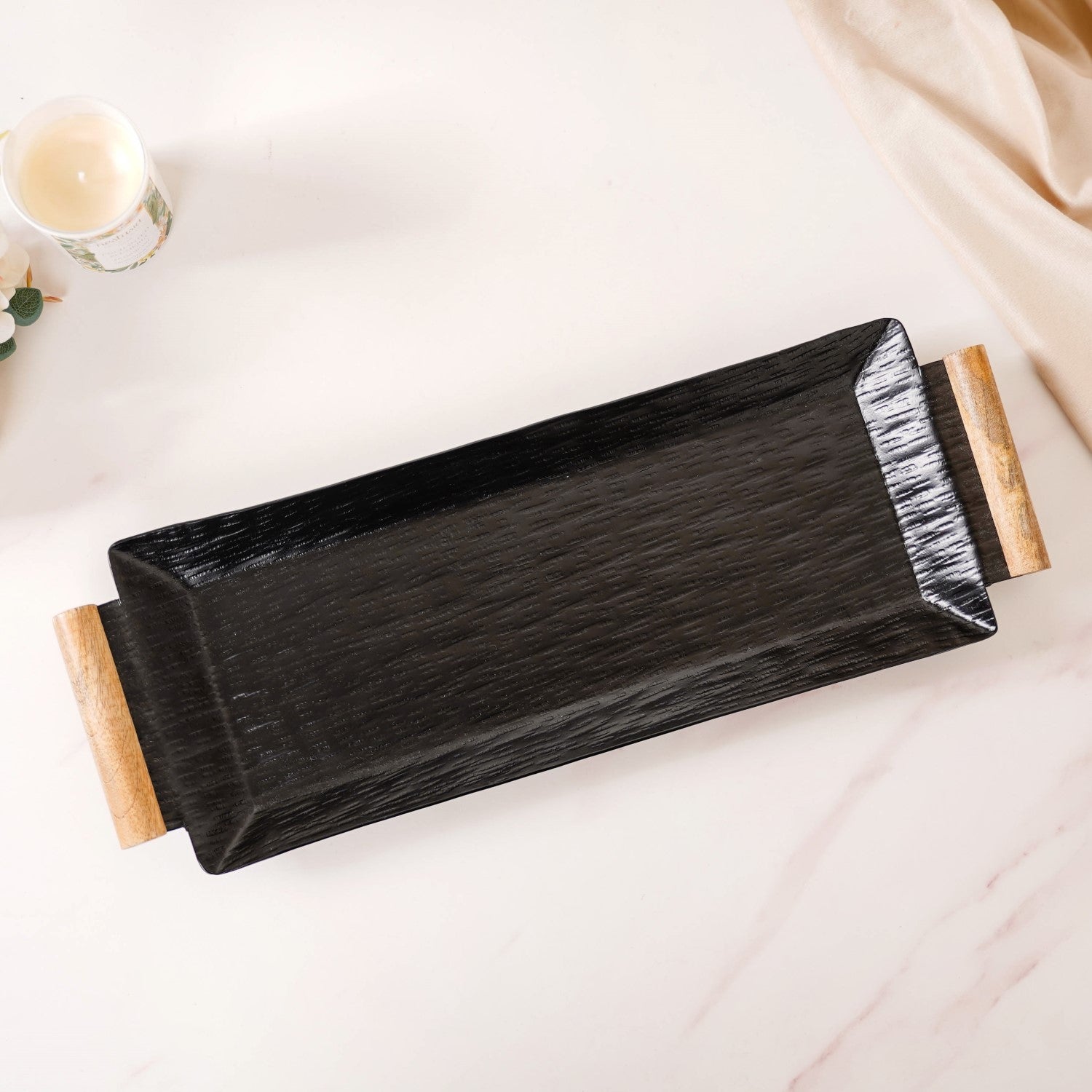The unique meltdown glass texture design and matte black finish make the tray an elegant addition to any tabletop or serving area, perfect for both functional and decorative purposes.