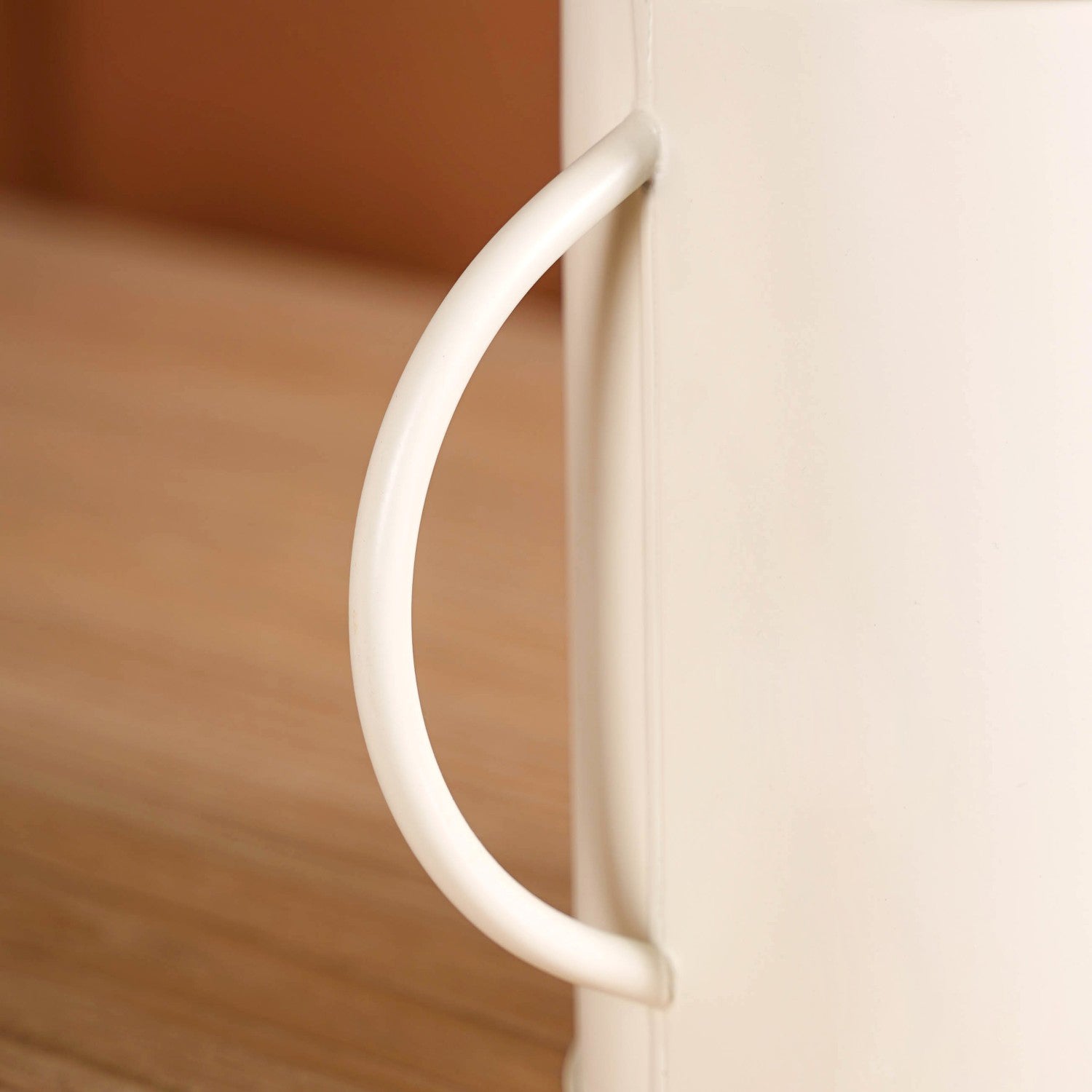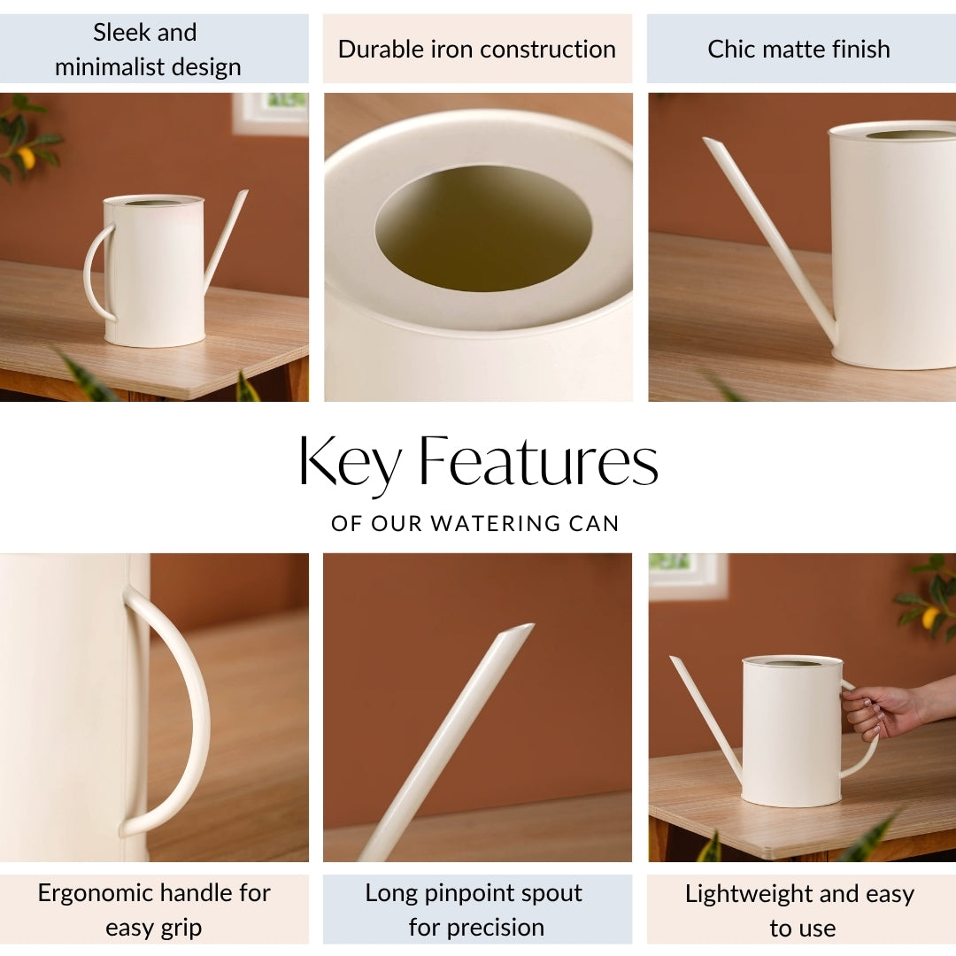Design: This watering can features a clean, cylindrical form in a soft off-white tone with a smooth, glossy powder finish. Its minimal silhouette is defined by a wide-open top, a slender spout, and a curved rear handle, which together create a modern, balanced profile. Made from durable iron, it combines structural simplicity with refined craftsmanship.