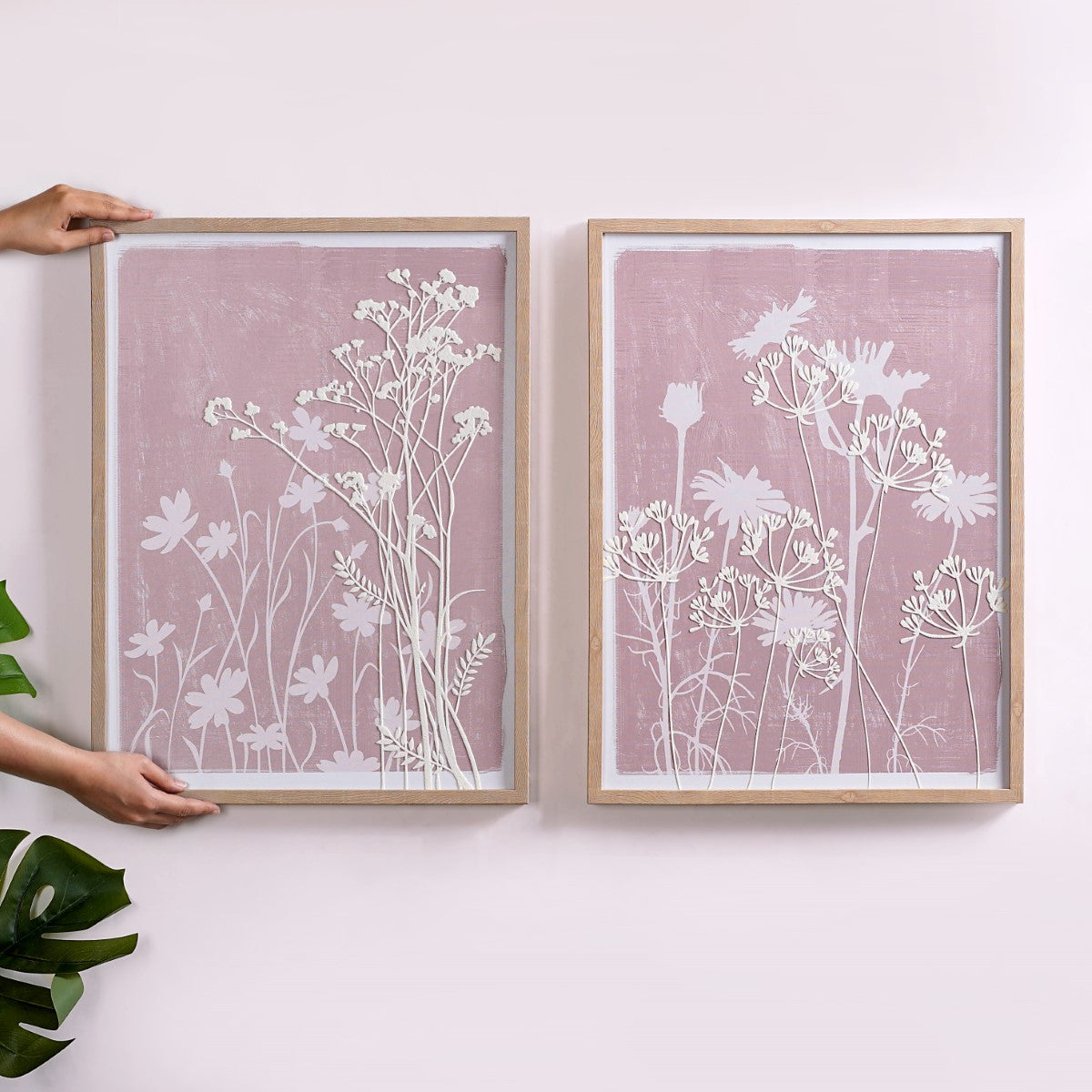 Crafted with artistic finesse, the art pieces feature botanical herbarium designs that are meant to capture nature's beauty in its purest and rawest form. The flailing flowers in the background have been handpainted on a canvas board, whereas the eye-catching styrofoam designs in the foreground add an element of intrigue.