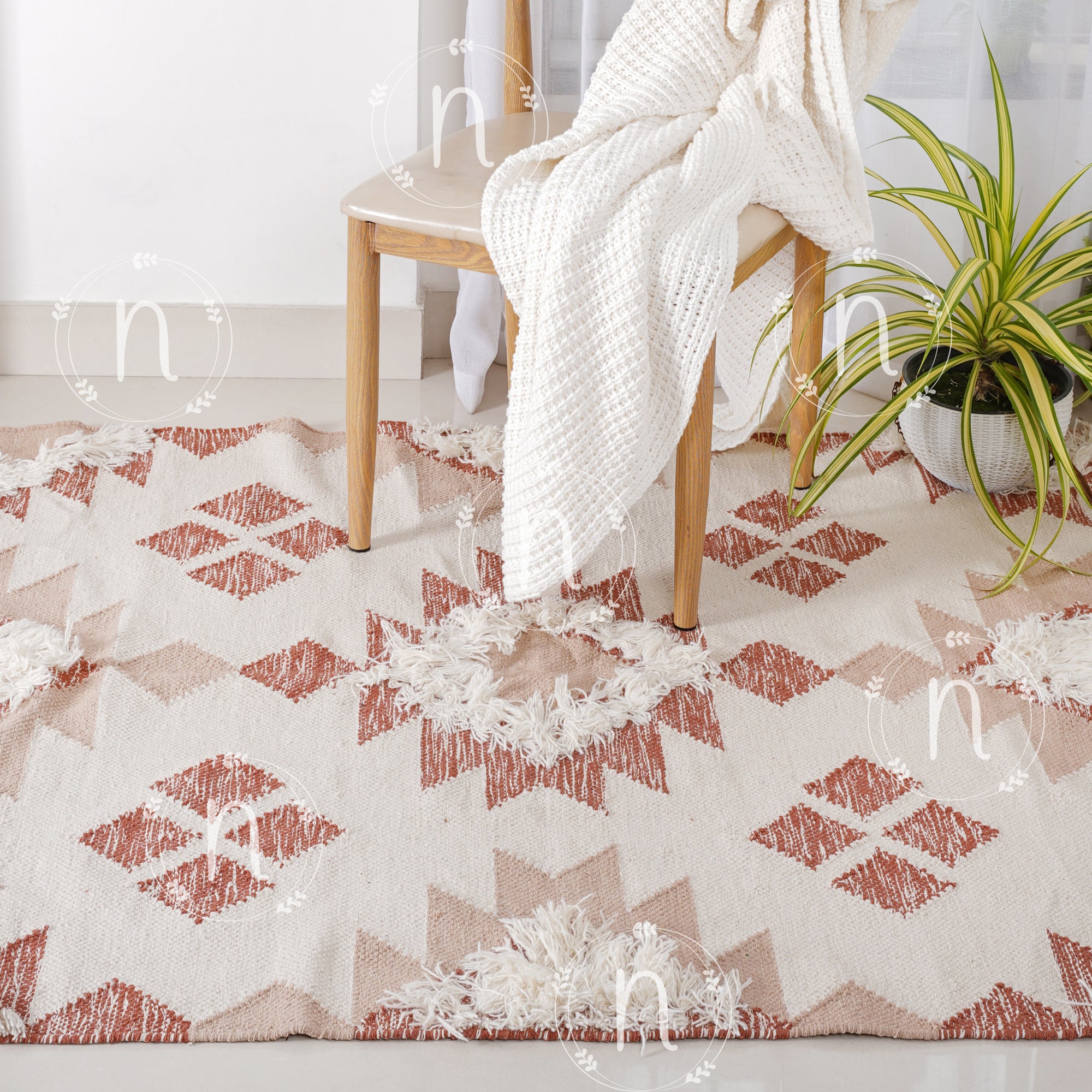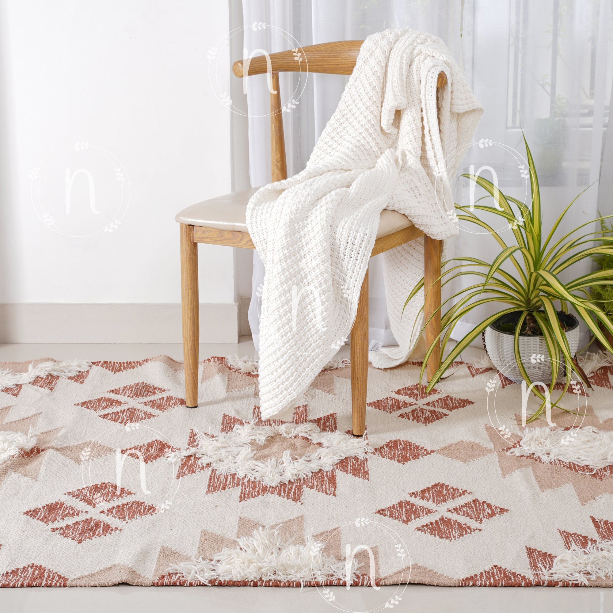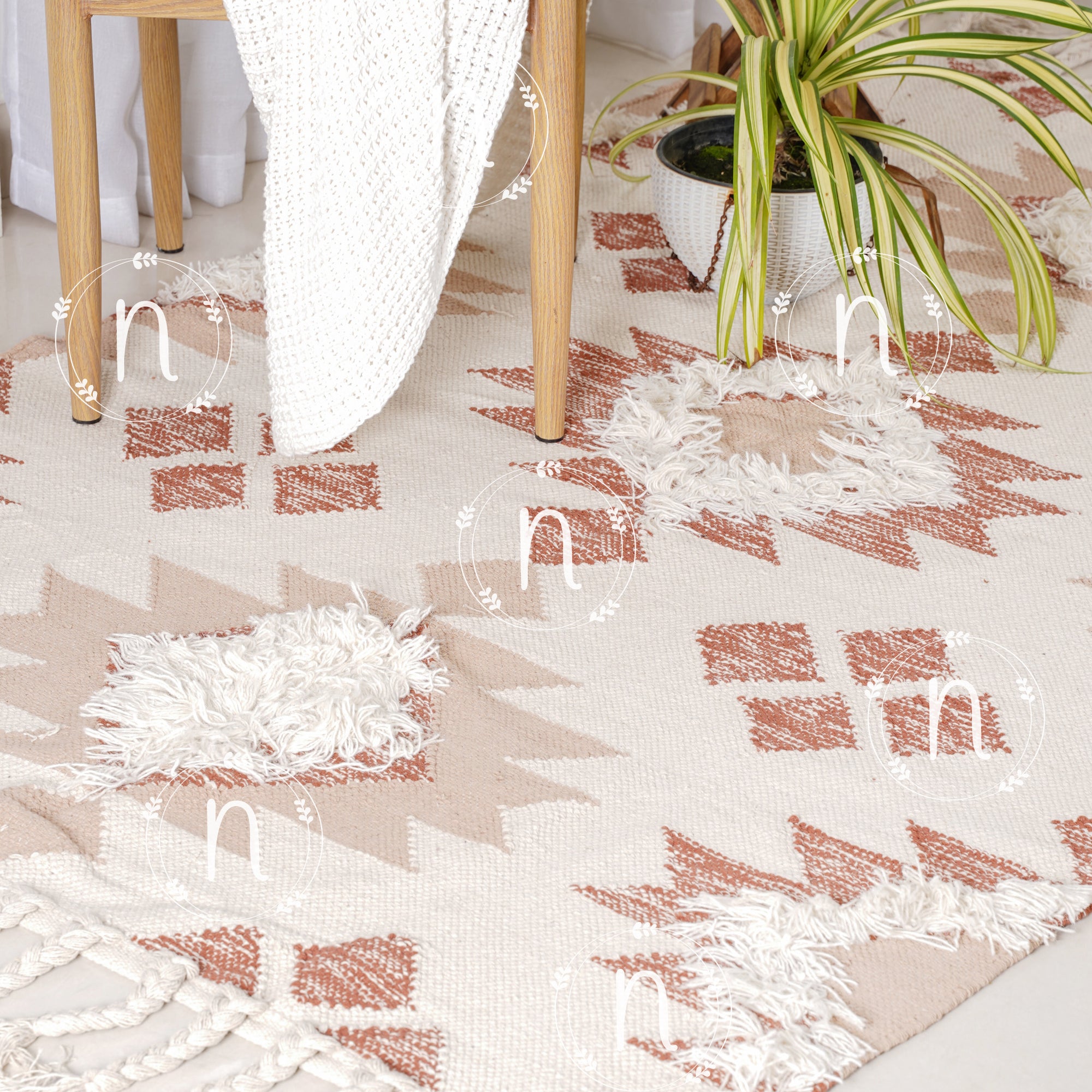 Bringing boho vibes to the setting, the Mayan rug is a great addition to a living room or bedroom area. It has an Aztec bohemian aesthetic to it. The dhurrie carpet is a classy addition to any decor setting and is ideal to be used as an area rug.