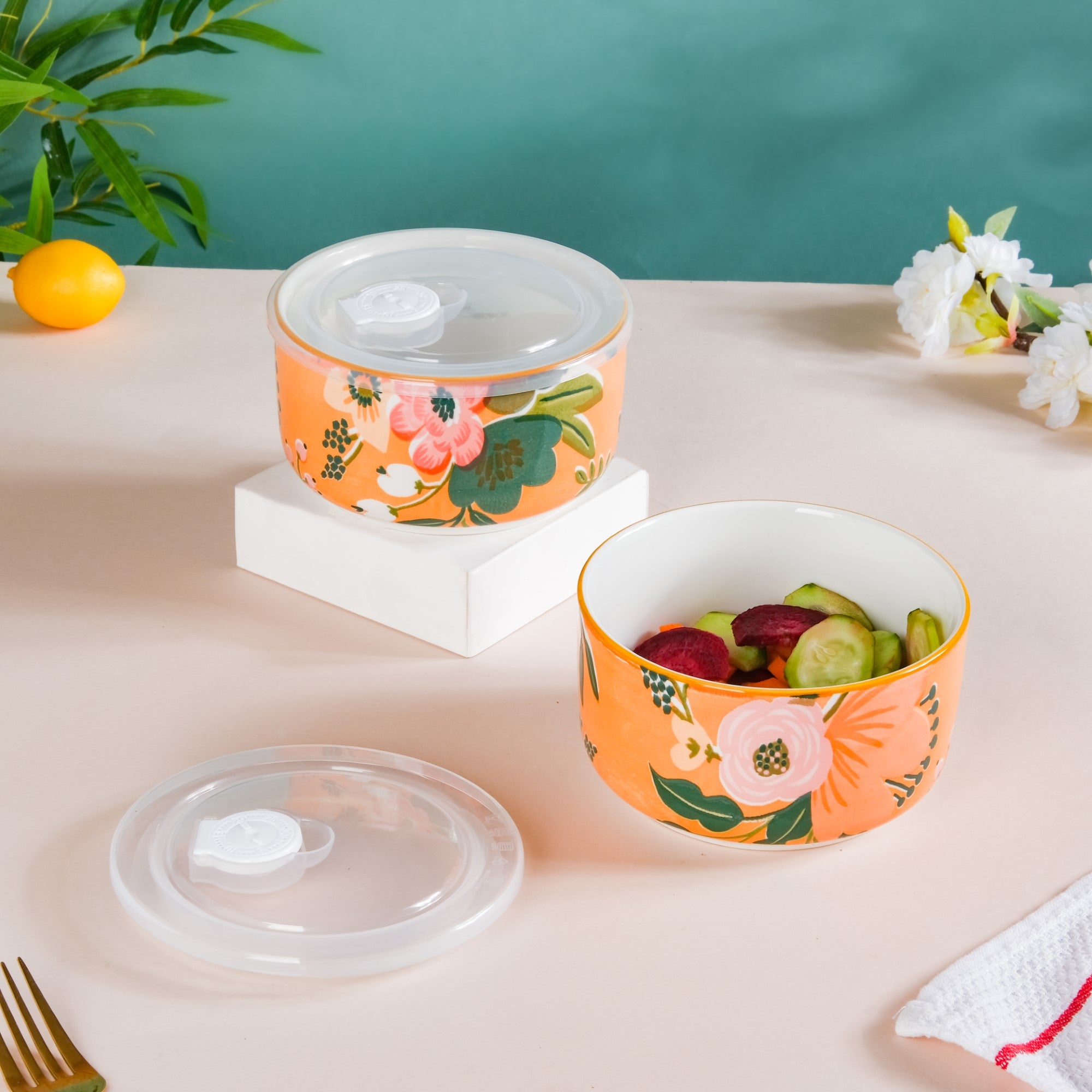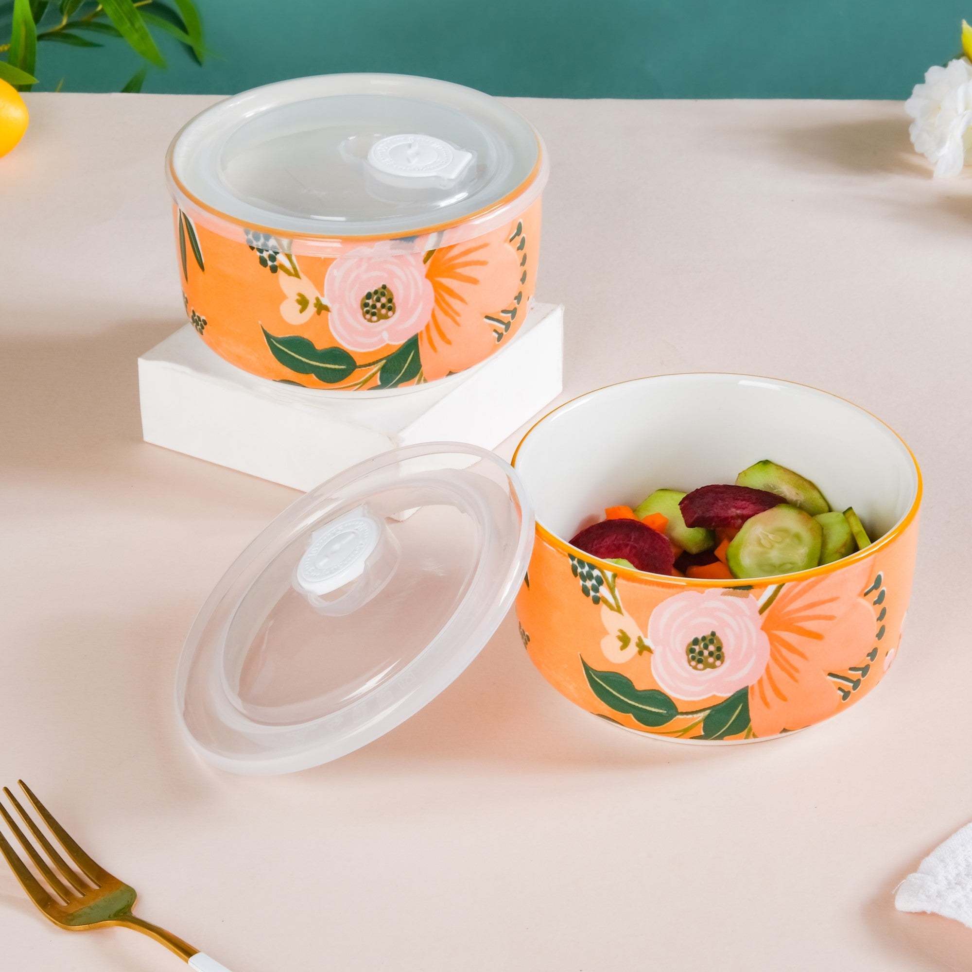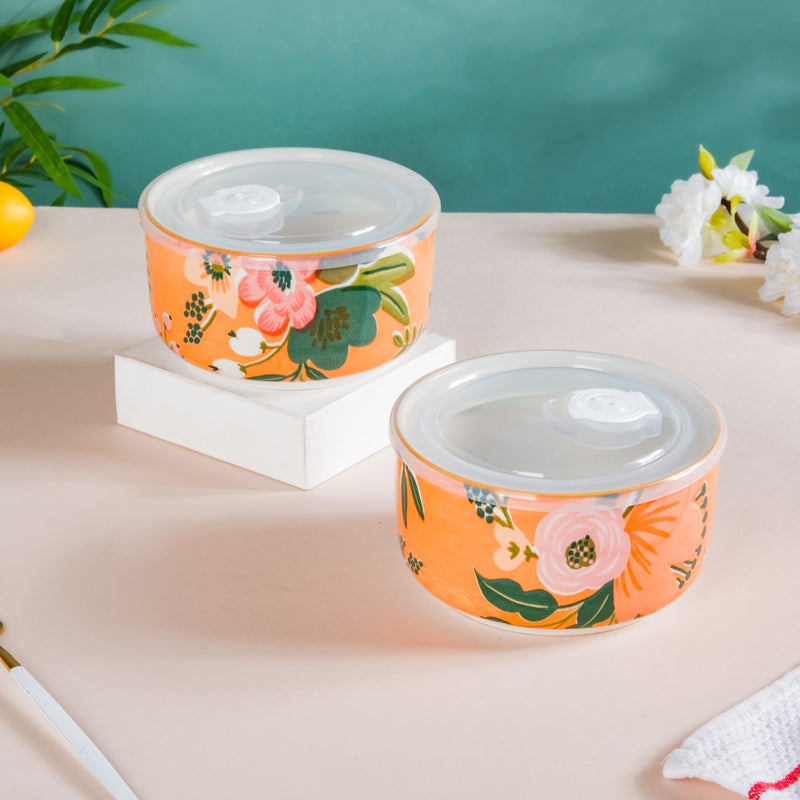 A bowl with lid is all you need to keep your favourite snacks fresh and tasty without going stale. Our lunch box set includes two stunning small bowls featuring vibrant floral designs, adding to the aesthetic appeal of any table decor or dinnerware collection. The high-quality PVC lid also offers superb functionality to the lunch box set in terms of carrying and storing food safely. The lid of the lunch box has a steam release opening with a date stamp to keep a track of the food's freshness. Use the ceramic lunch box set with lids to pack fresh fruits, salad, munchies, and more when on the go.