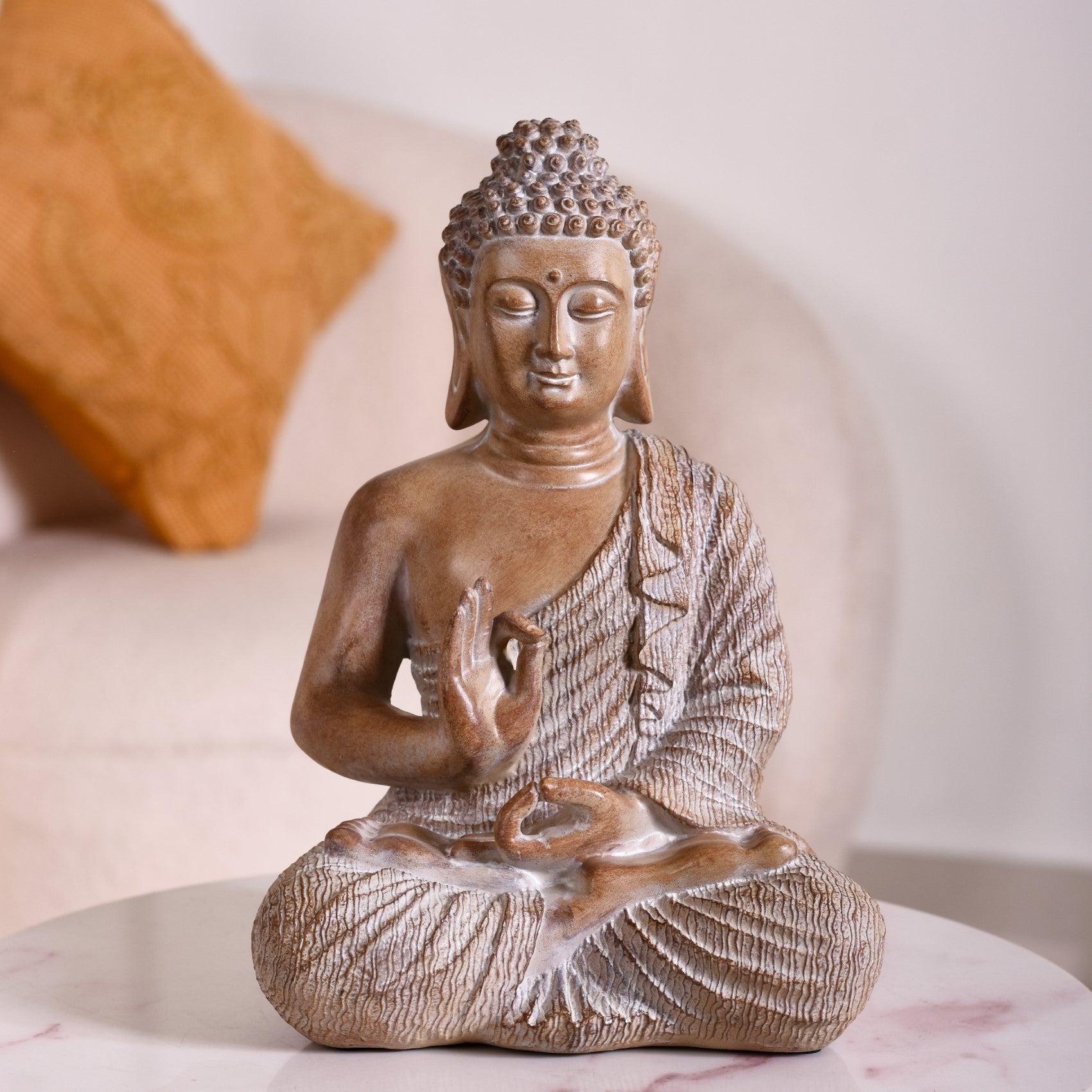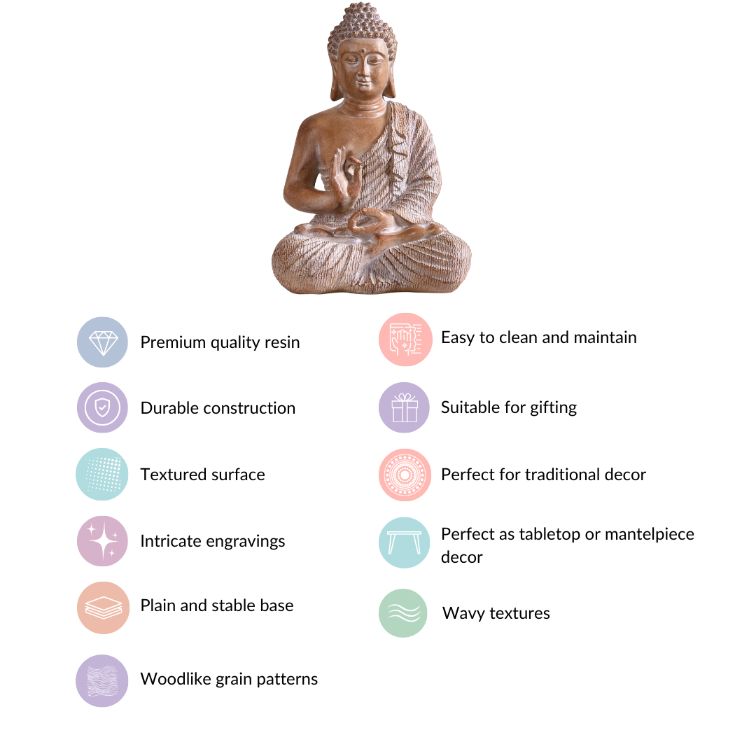 The Abhaya Mudra, depicted in the Buddha showpiece, is a symbolic gesture of fearlessness, reassurance, and protection. It represents the absence of fear and the granting of divine protection and blessings to those who seek refuge in the teachings of Lord Buddha.