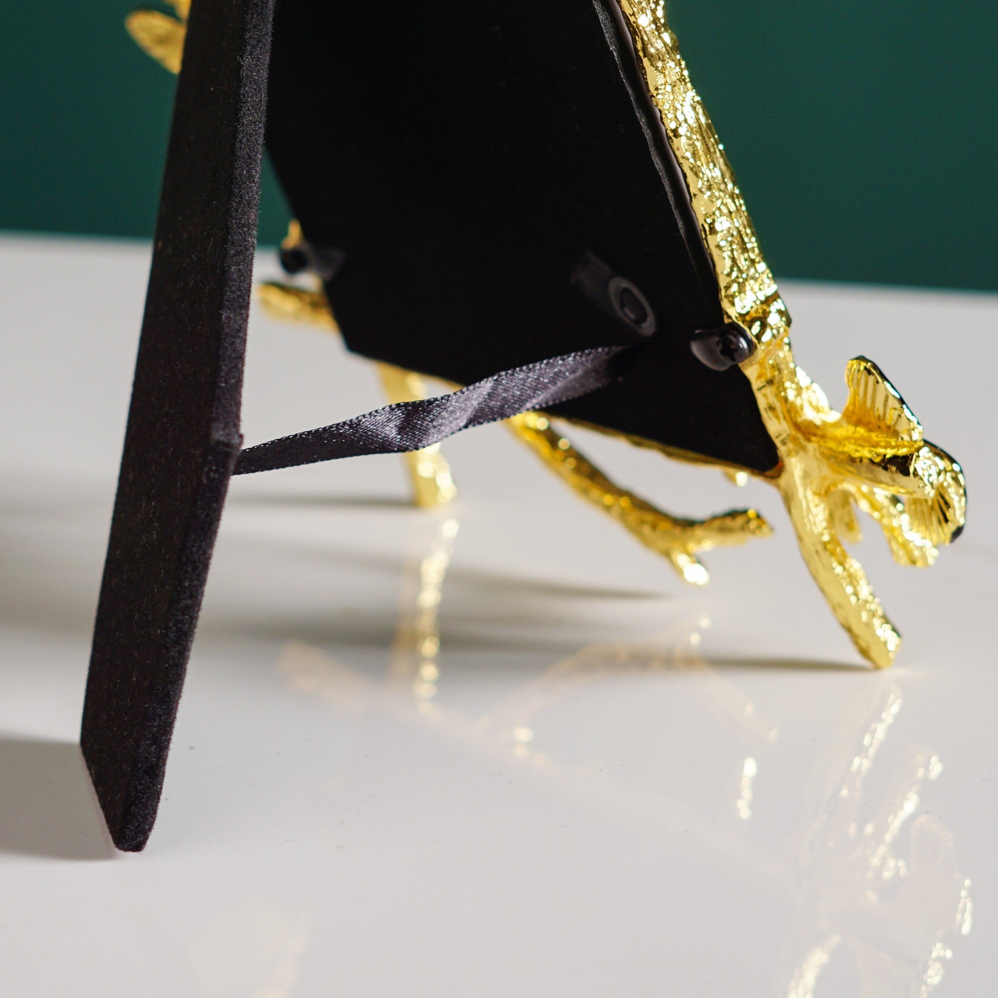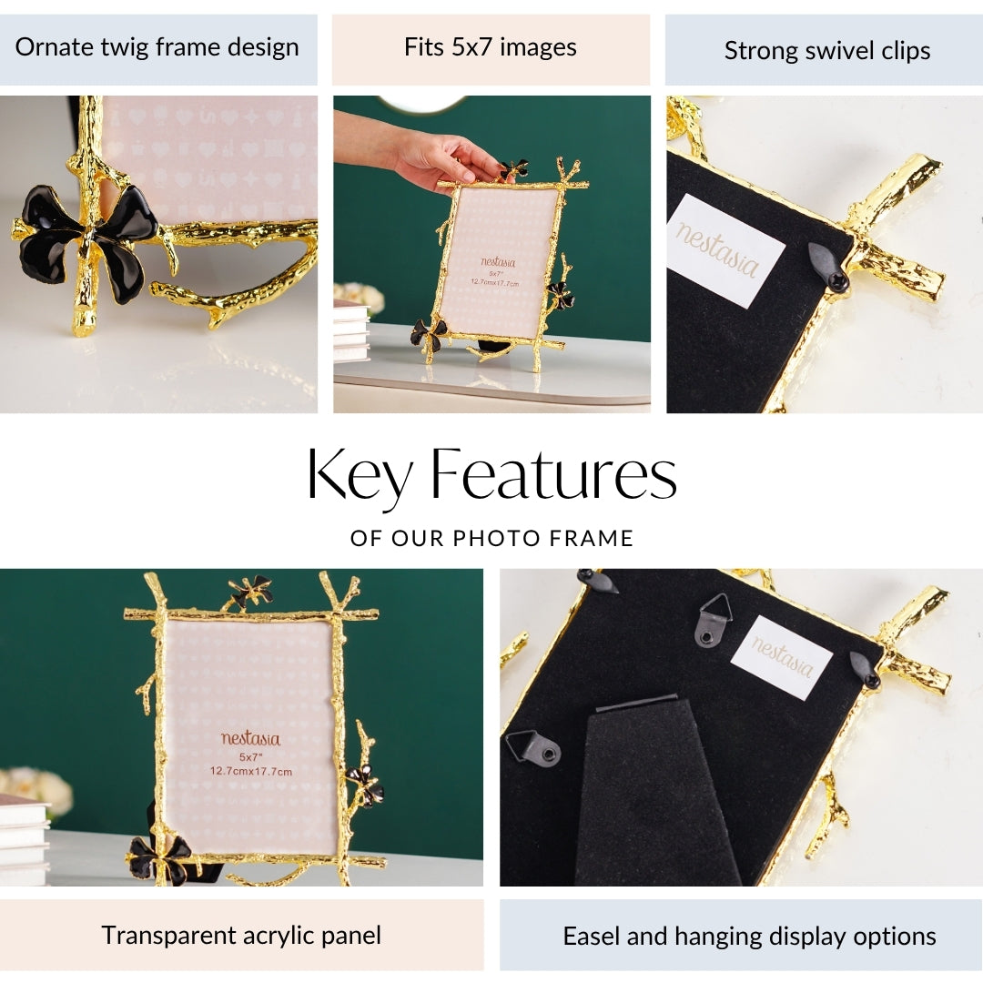 Design: This ornate 5×7 inch frame features a gilded, textured branch-like finish in gold. Black enamel bow accents add intricate, rustic charm. Constructed from durable material, it includes protective glass to keep photos clear and safe, while a solid easel stand allows vertical tabletop display. The clear backing makes photo changes quick and easy, combining elegance with practicality.