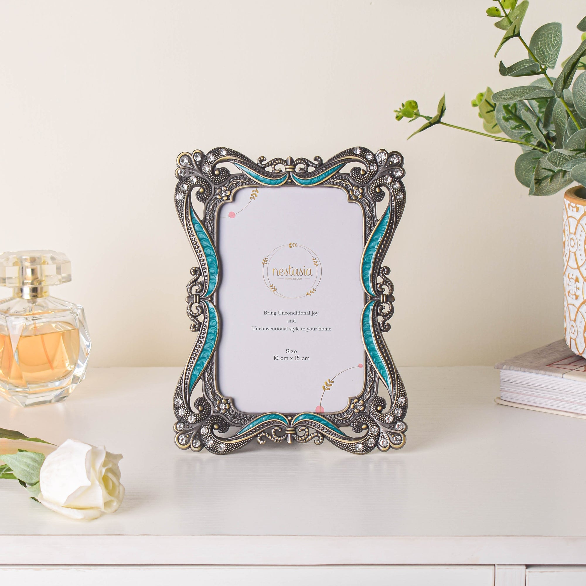 Embracing the age-old art nouveau design, the elegant photo frame comes with floral inlays at each corner. Aesthetically fashioned, the ribbons occur in a flowing manner at the hem of all sides. What to gift a friend on a wedding anniversary? The gift-ready photo frame can be a great idea. Procure an adorable shot of the couple and bracket the same using the green-colored picture frame.