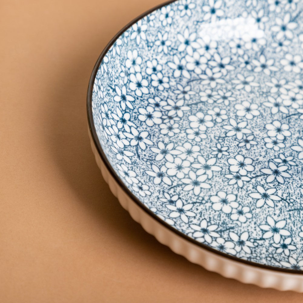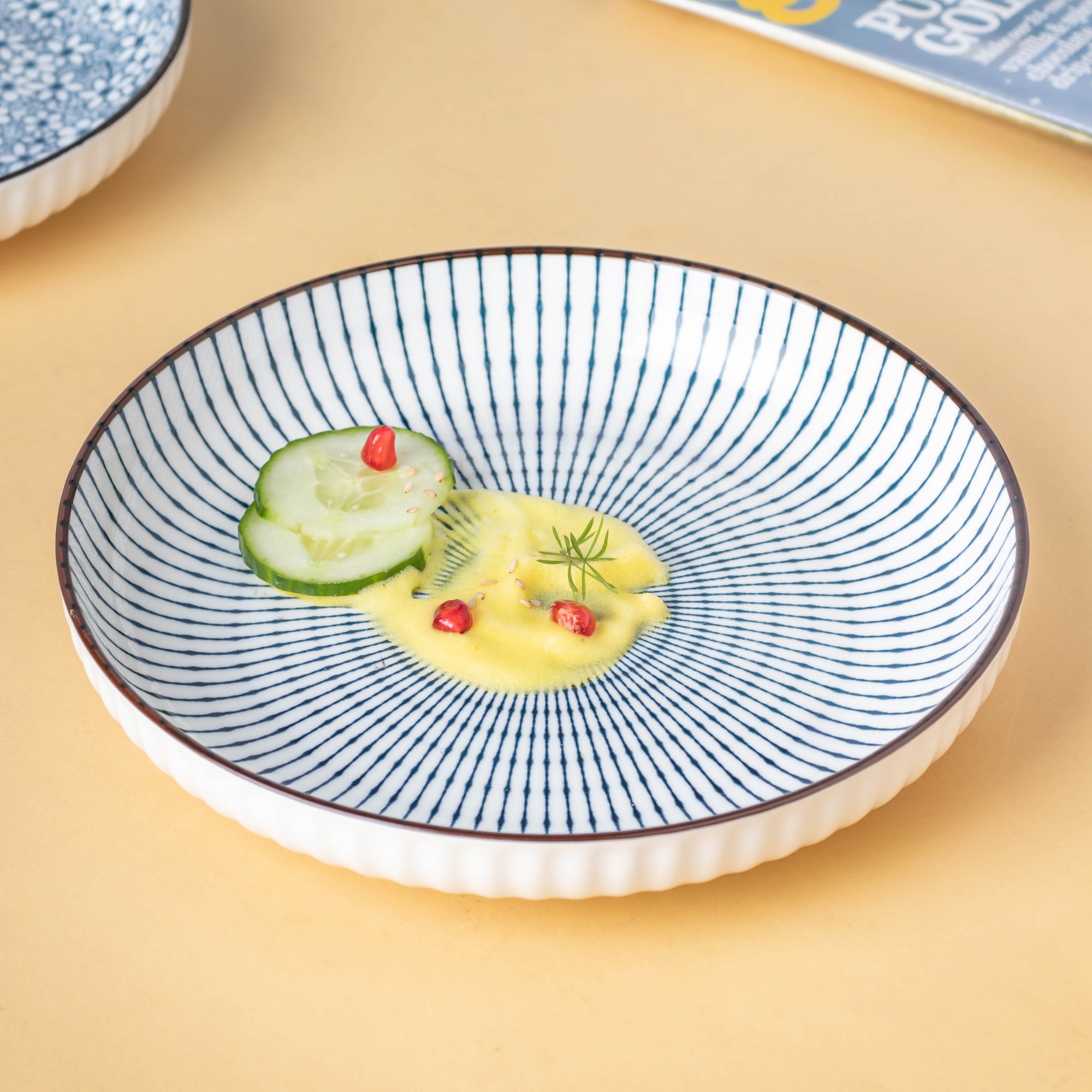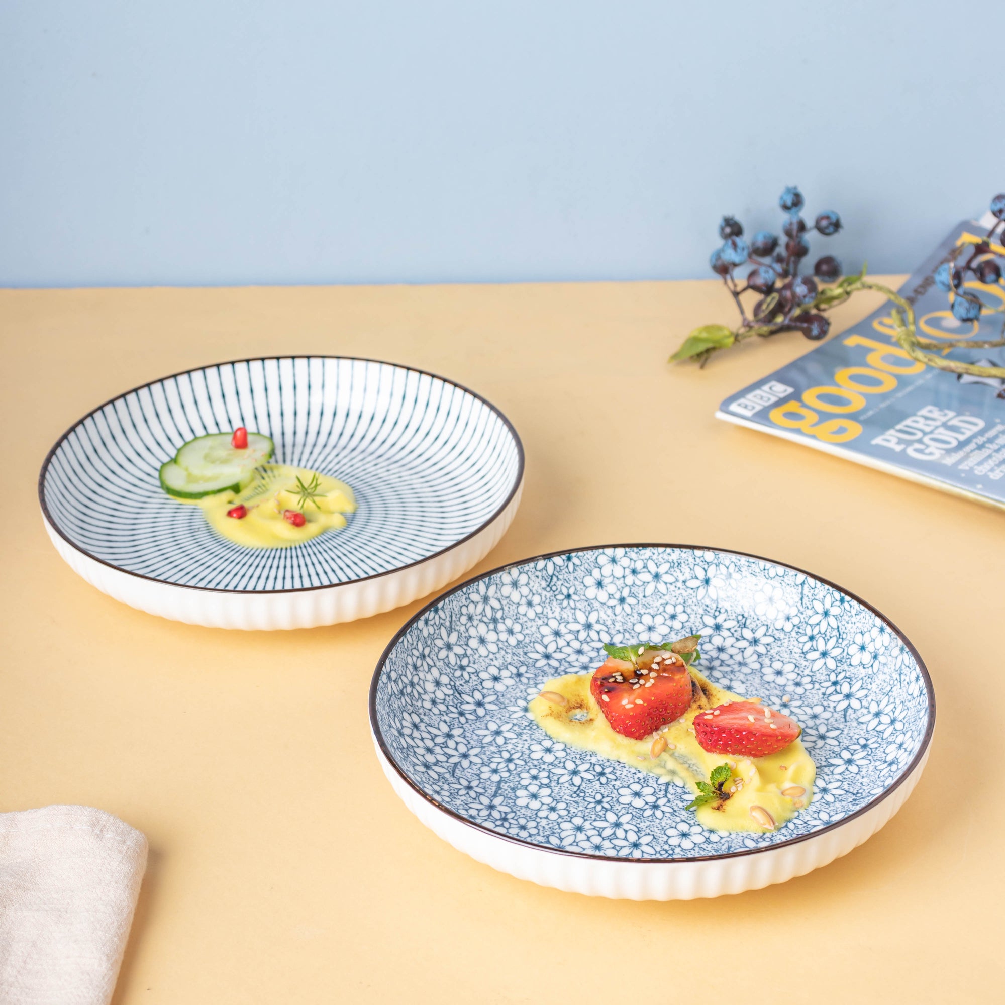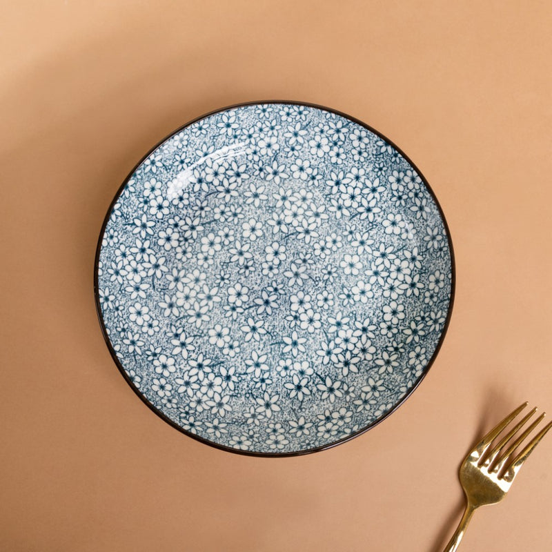 The ceramic plate with an elevated brownish-black rim is ideal for serving appetizers to add opulence to any table setting. With two attractive variant patterns of ditsy flowers and stripes on the inside, the white plate is great for bringing convenience to the dinner table. The chic plate has a long-lasting design and can be used as a noodle plate as well.