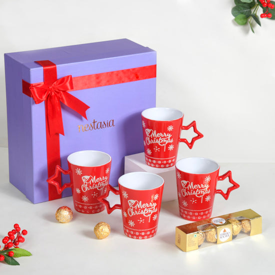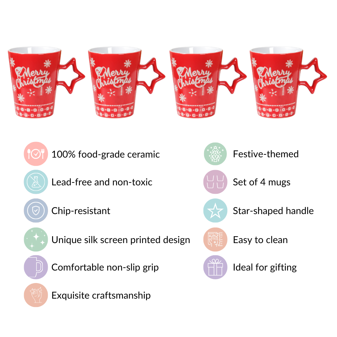 Elevate your holiday celebrations with our Merry Christmas set of cups with star handle in radiant red! These cups are more than just drinkware; they're an embodiment of festive joy. Crafted from premium food-grade ceramic, their impeccable quality is matched only by their festive designs. "Merry Christmas" gracefully adorns each cup, while the star-shaped handle imparts a touch of magic to your every sip, ensuring a secure grip. These cups, born of meticulous craftsmanship, resist chips and leaks, promising durability. And when the festivities are over, their microwave and dishwasher-safe design make cleanup a breeze.