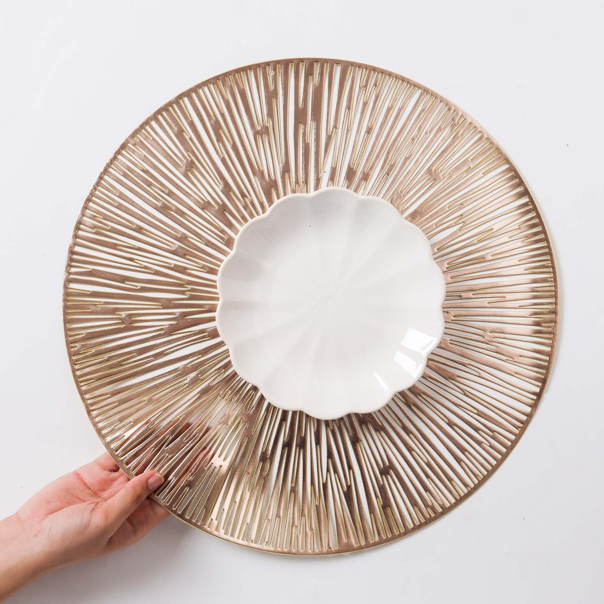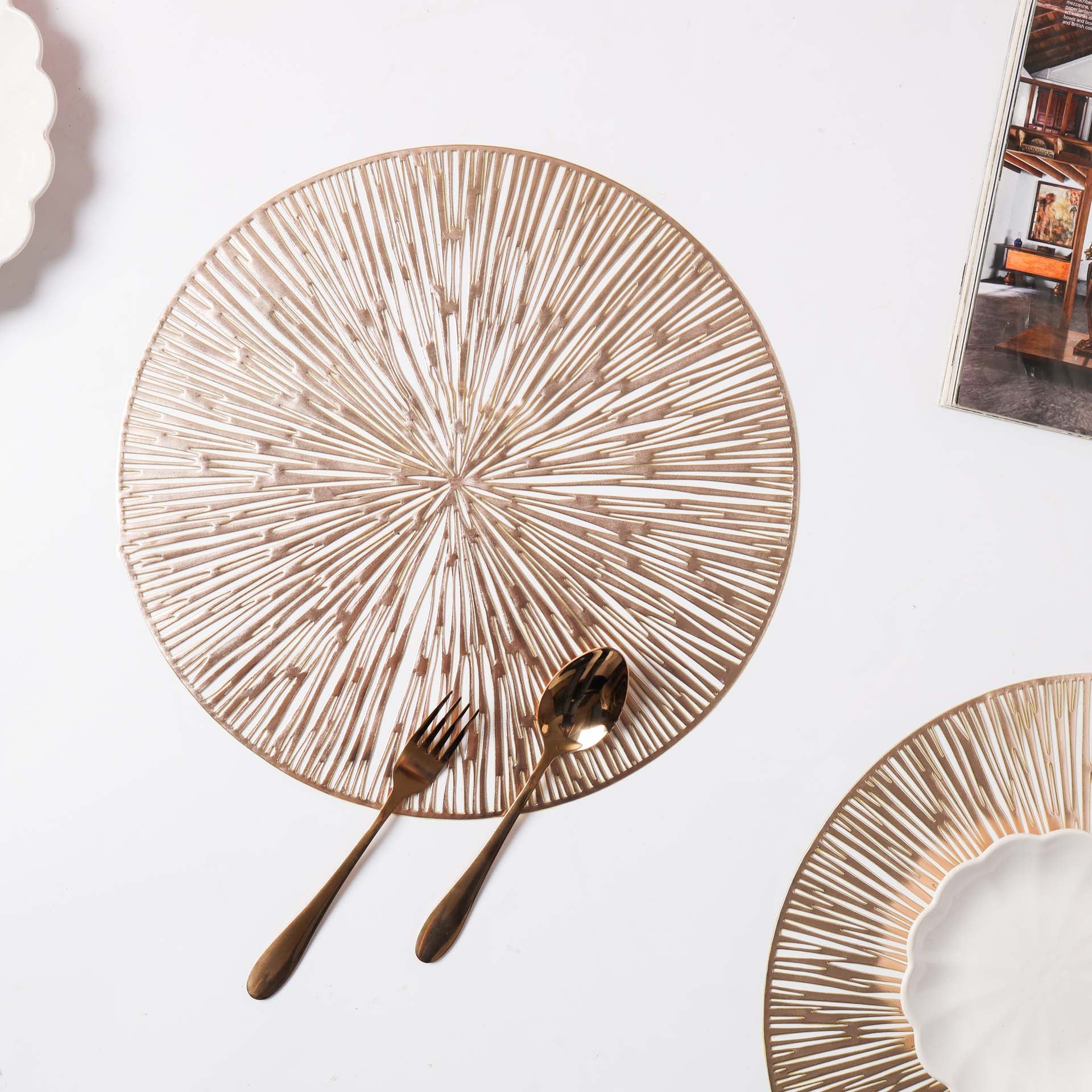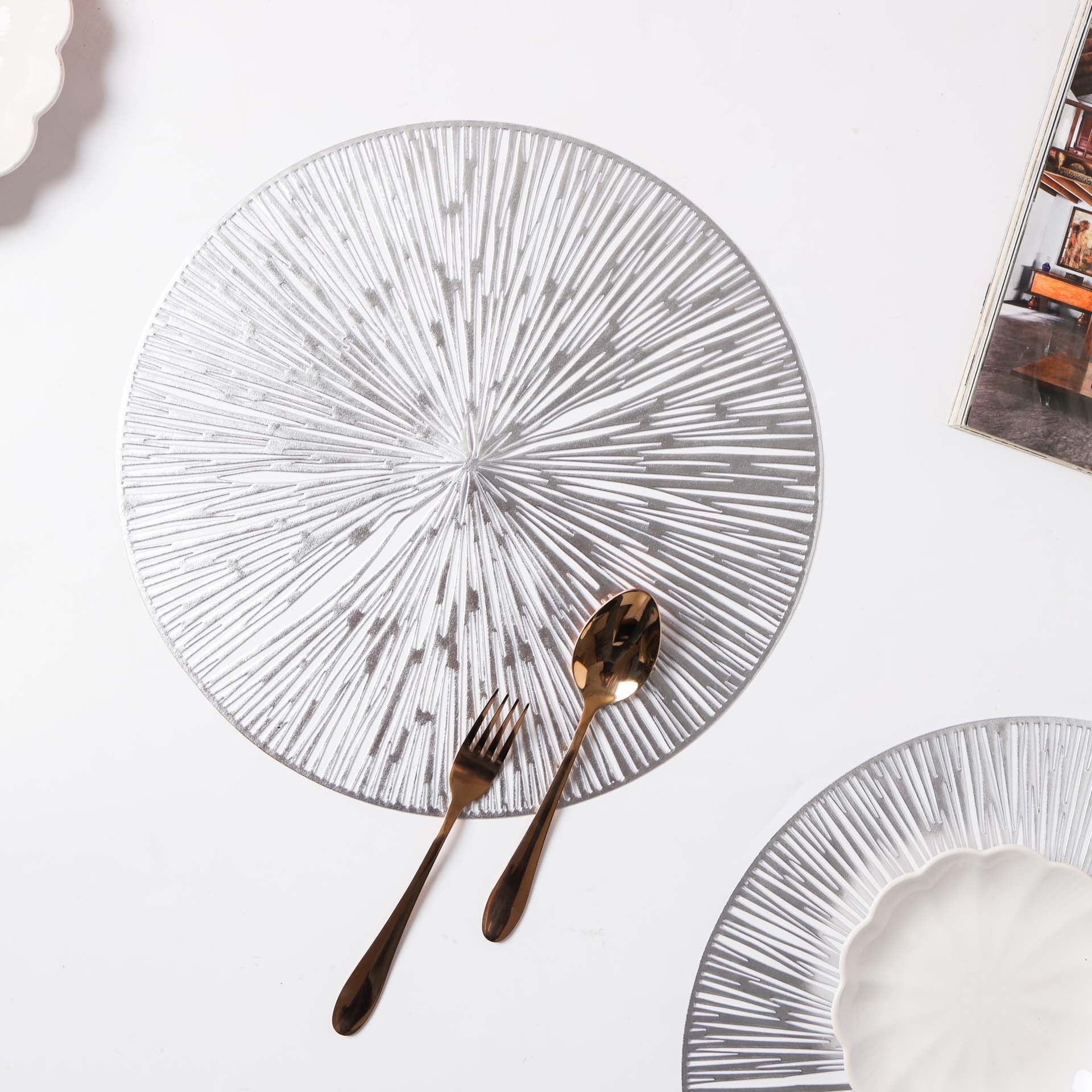 The PVC table mat features an elegant woven design that exudes elegance and sophistication. Manufactured using the highest quality raw materials, the mats guarantee durability and unmatched aesthetics. The mat can protect the table against high temperatures and will continue to look new and great even after years of use. Non-slip, the mats help create an exotic look on the table. Waterproof by nature, the mats can be cleaned using a slightly damp cloth. Nestip: To enhance the beauty of the dinner table, add colorful napkins to the setup. Size: 38cm diameter Color: Silver, gold Material: PVC Products included: 1 set of 2 placemats of the same color and design Style: Silver- GSM94A45Gold- GSM94A46