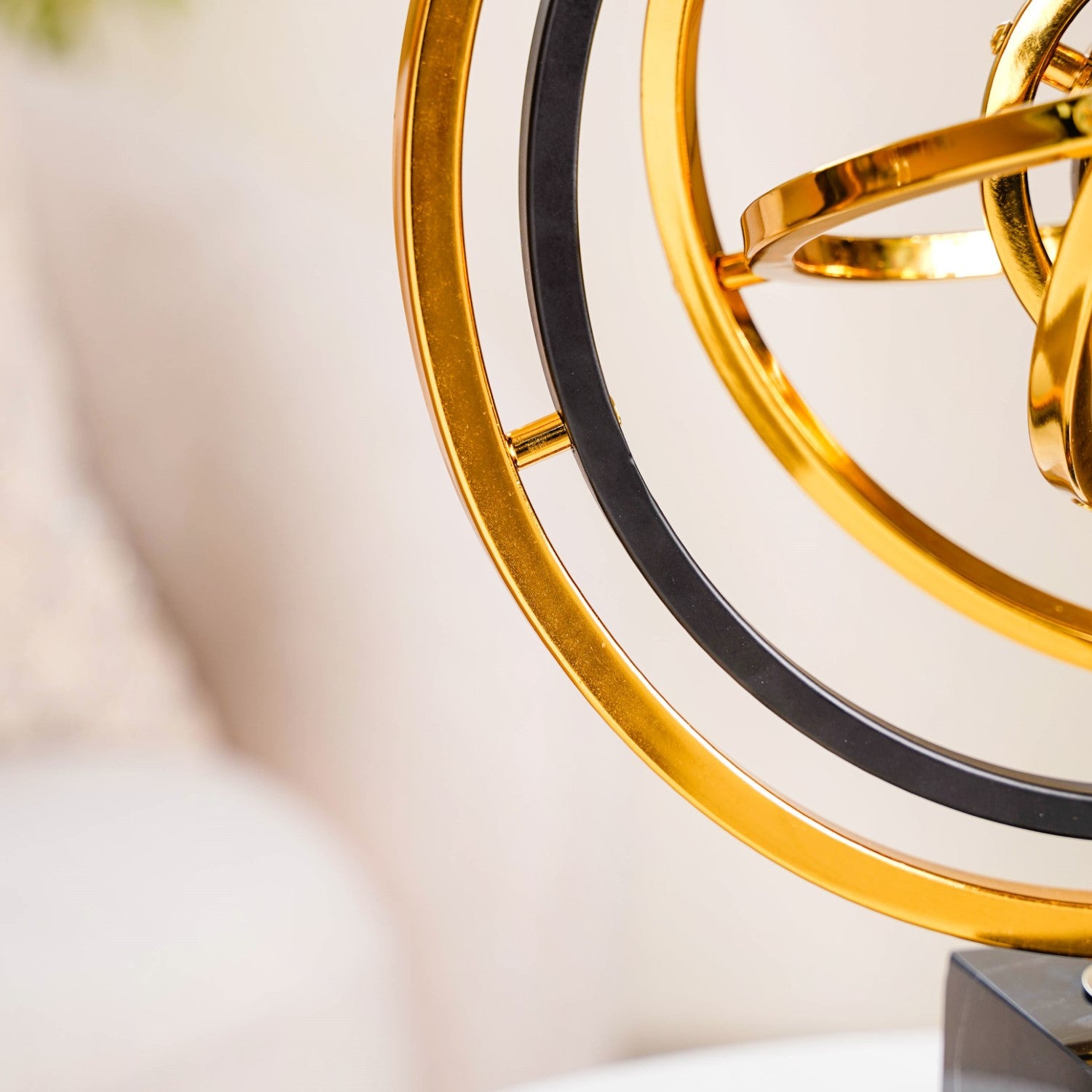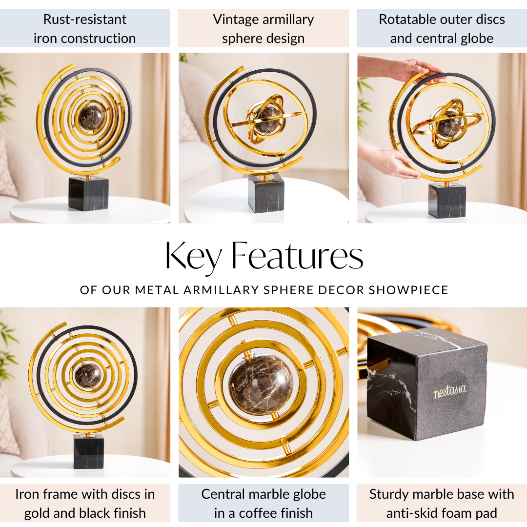 Design: An armillary sphere is a celestial model representing the heavens and the movement of celestial bodies, traditionally used in astronomy. Our metal showpiece features a vintage armillary sphere design with rotatable outer discs and a central marble globe, adding a touch of sophistication to any room. The iron frame is finished in a stylish blend of gold and black, complementing the central marble globe in a rich coffee hue.