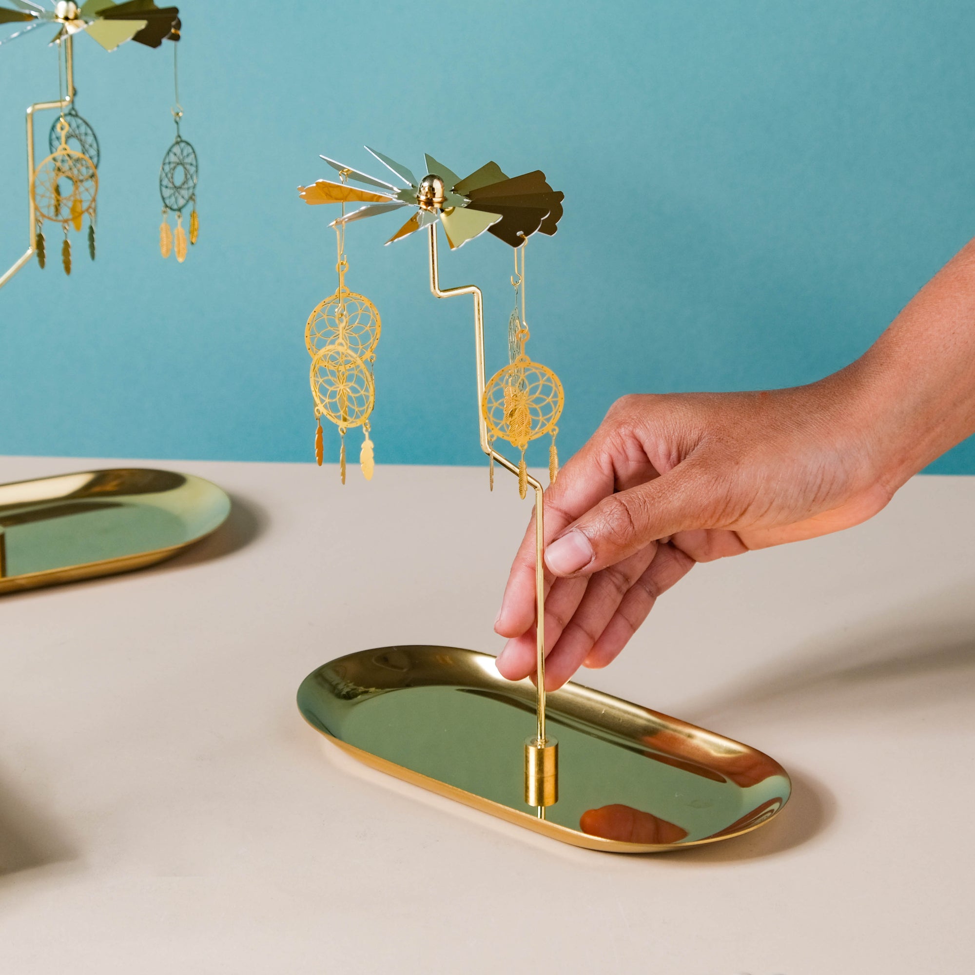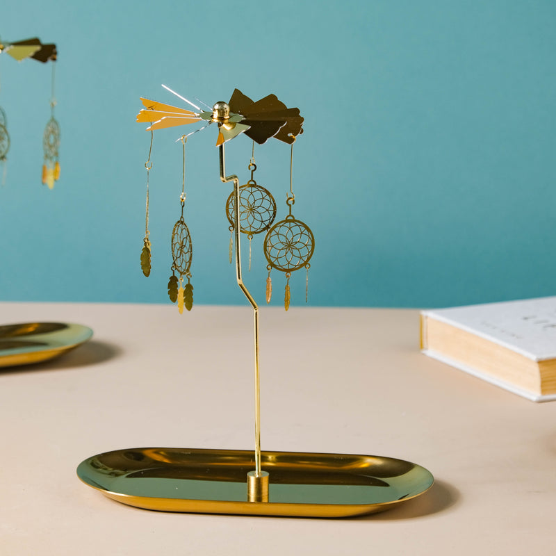 The carousel stand features a selection of beautifully crafted metal carousel decorations that are perfect for adding a touch of whimsy and nostalgia to any room. The carousel is finished with vibrant gold color and intricate details. It features a spinning carousel with dreamcatchers that add a touch of elegance and nostalgia to any space. Our metal carousel decor stand is sure to become a treasured addition to your home or event.