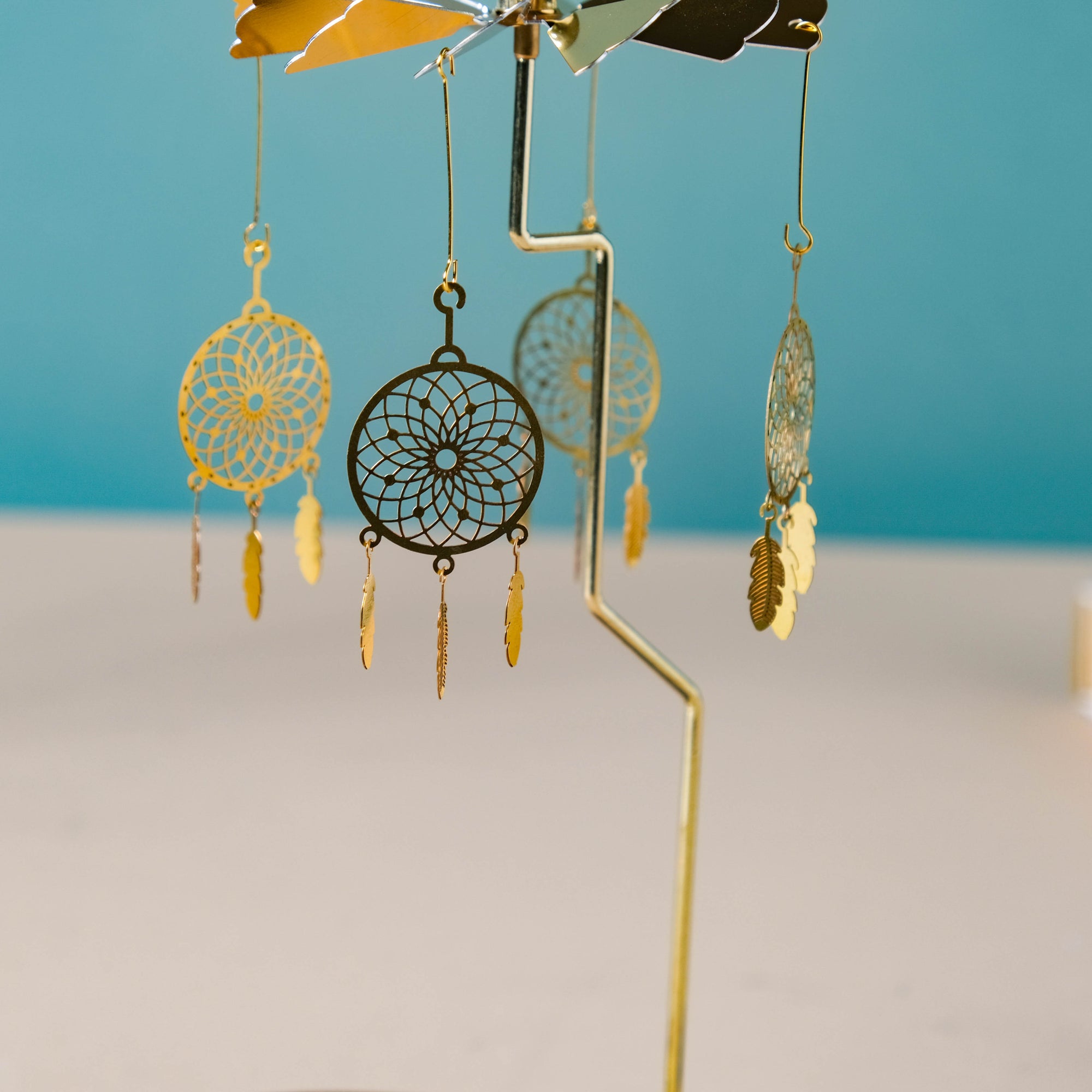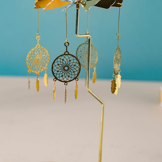 The carousel stand features a selection of beautifully crafted metal carousel decorations that are perfect for adding a touch of whimsy and nostalgia to any room. The carousel is finished with vibrant gold color and intricate details. It features a spinning carousel with dreamcatchers that add a touch of elegance and nostalgia to any space. Our metal carousel decor stand is sure to become a treasured addition to your home or event.