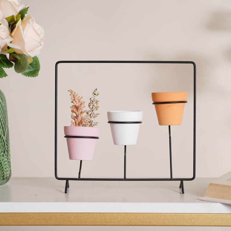 A set of three planters of different colors that comes along with a rectangular metal stand is a trendy pick for plant lovers. Decorate your living room by keeping it on the console beside your TV or at the window.