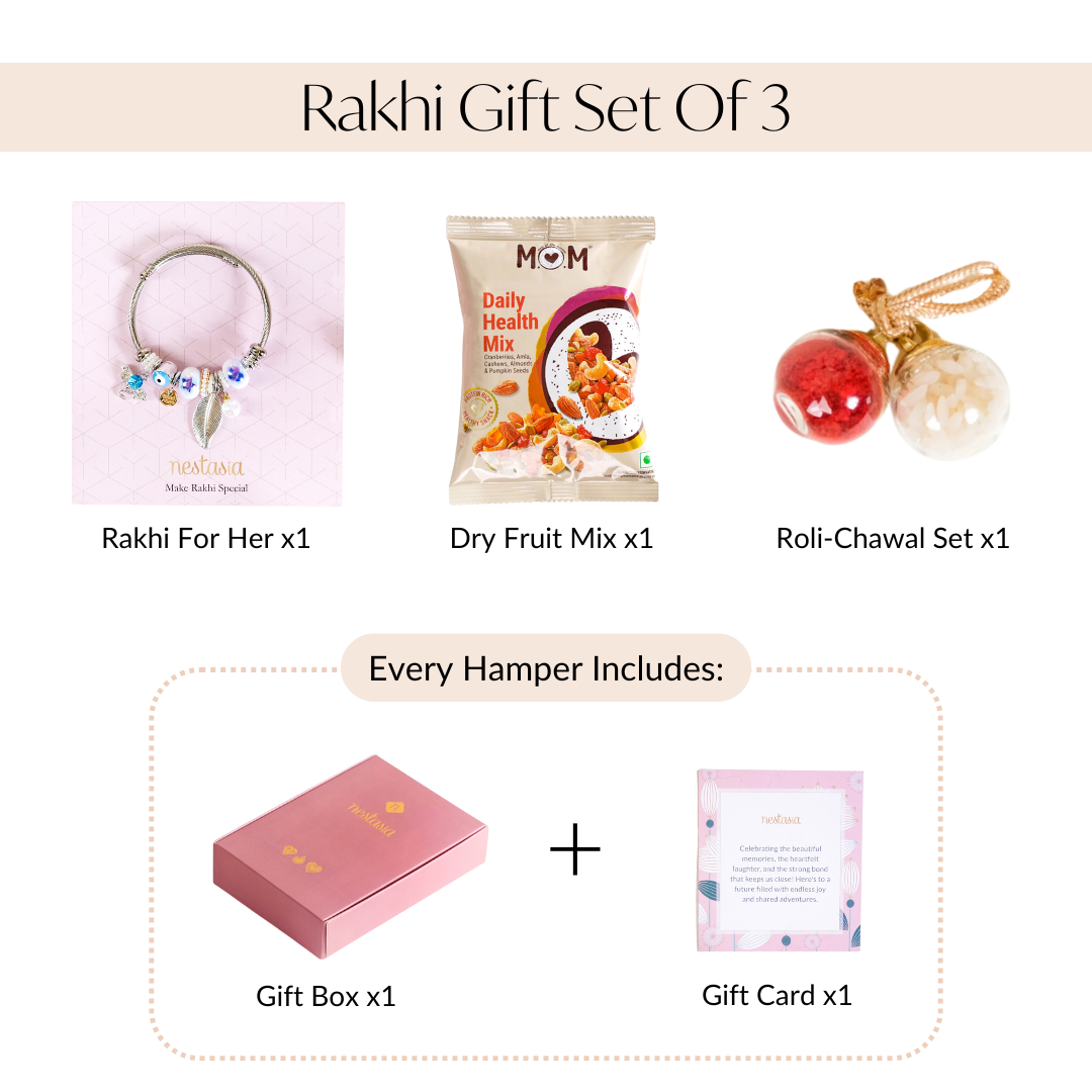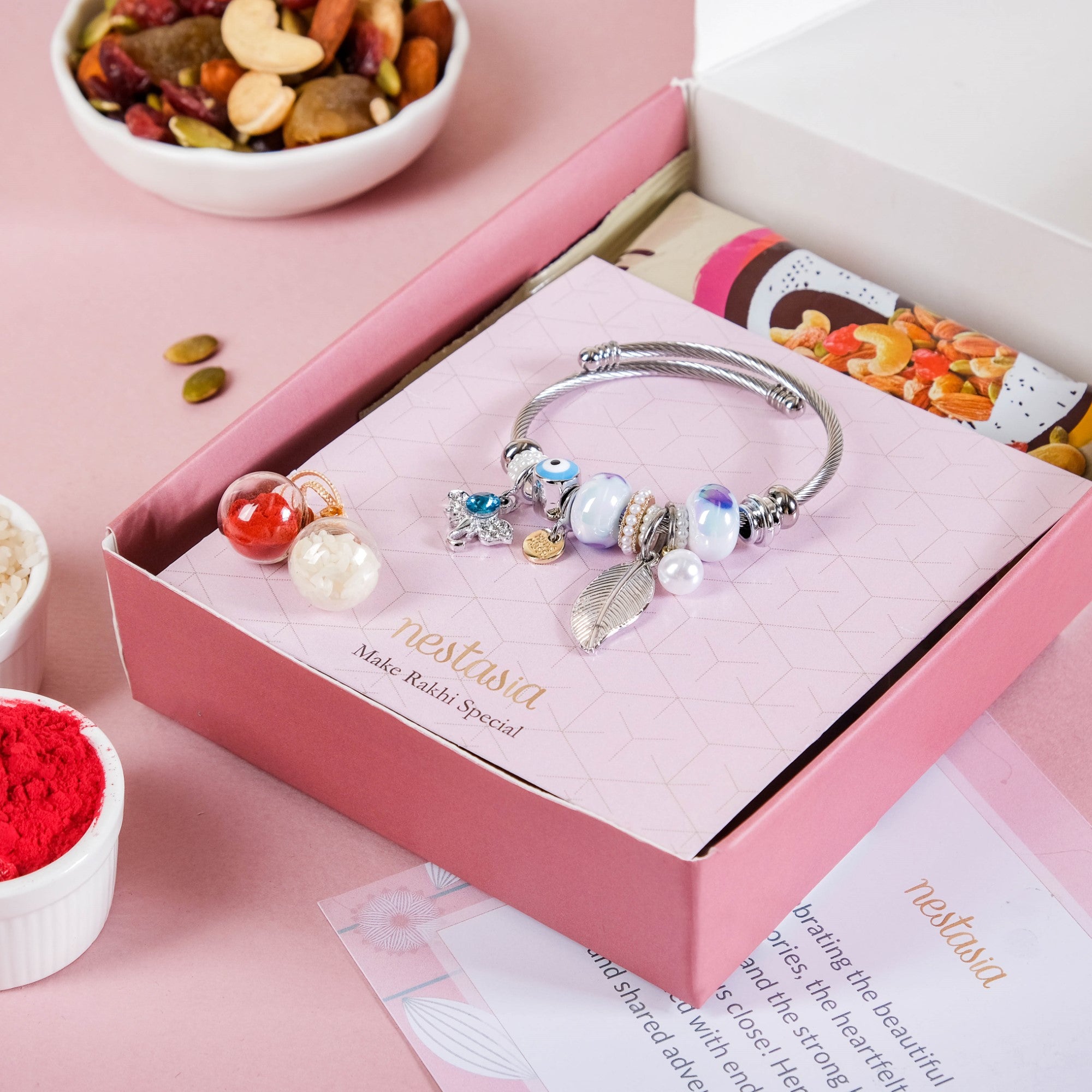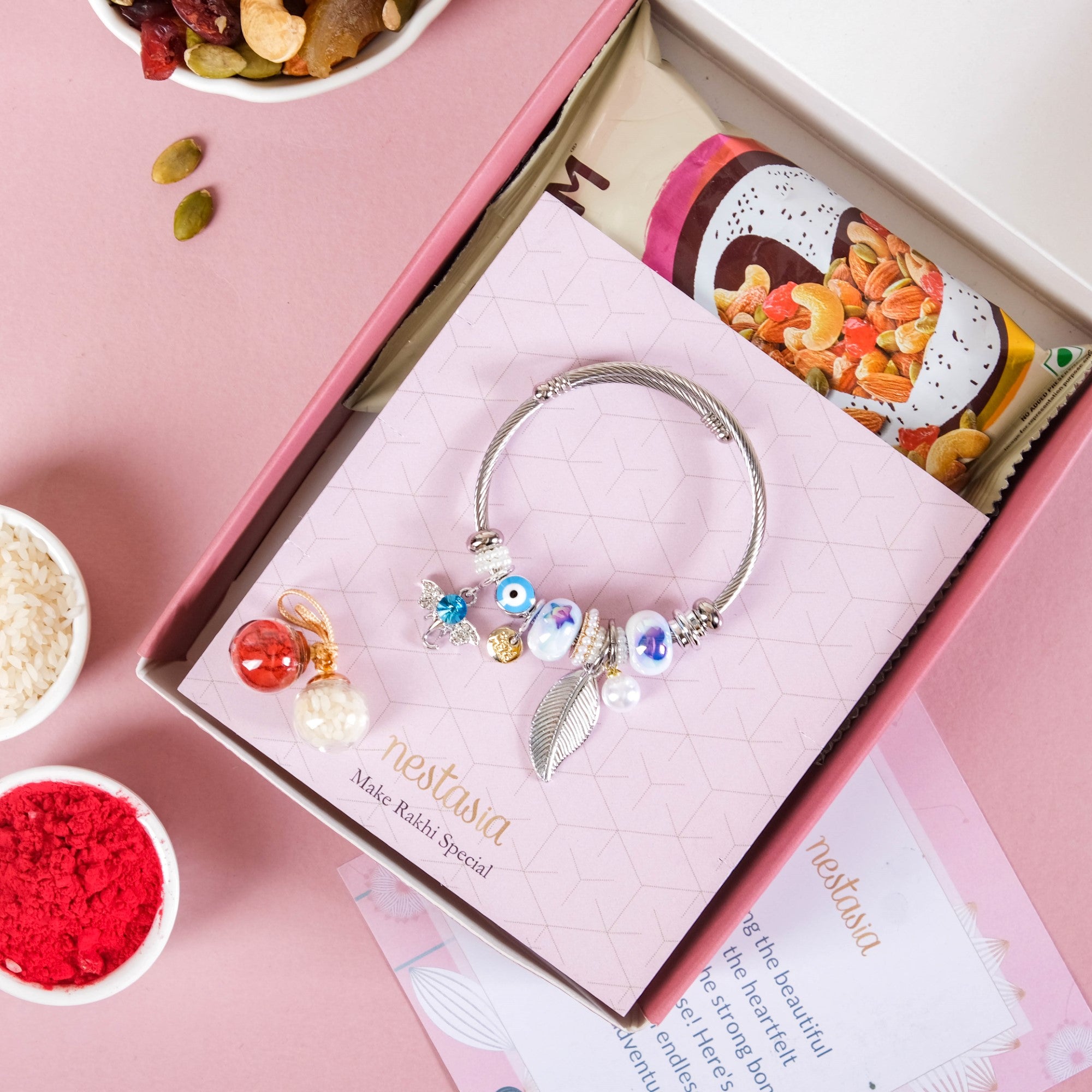 Embark on a journey of sibling love and tradition with our captivating Rakhi gift hamper, designed to sprinkle joy and warmth this Raksha Bandhan! This thoughtfully curated Rakhi hamper includes a stunning metal charm bracelet Rakhi, adorned with an enchanting Evil Eye charm and other delightful charms, symbolising the eternal bond of siblings. The Rakhi bracelet is accompanied by a traditional roli-chawal set for auspicious blessings, a tantalising mix of premium dry fruits for indulgence, and a heartfelt greeting card expressing your love for your dear sister. All beautifully presented in an elegant gift box, this hamper embodies affection and tradition, making it the perfect token of appreciation for your sister on this special occasion.