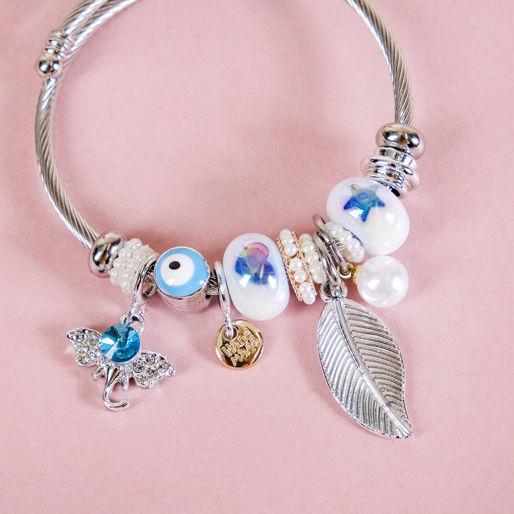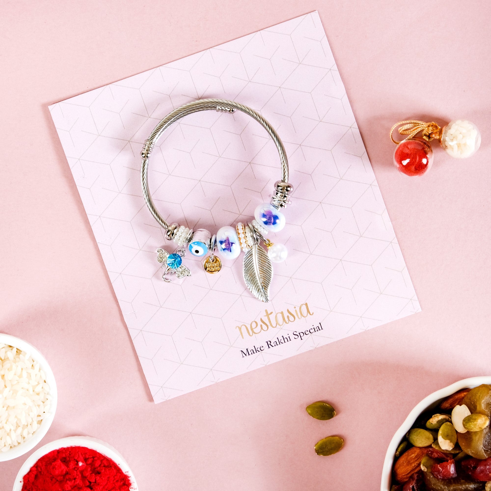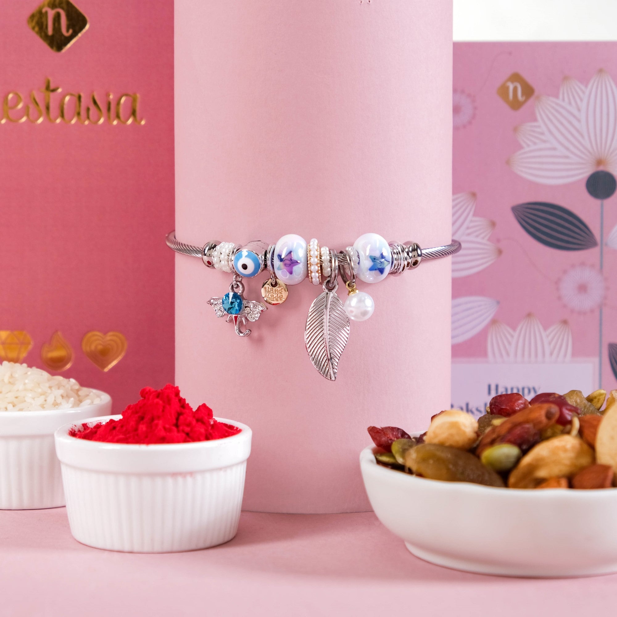 Embark on a journey of sibling love and tradition with our captivating Rakhi gift hamper, designed to sprinkle joy and warmth this Raksha Bandhan! This thoughtfully curated Rakhi hamper includes a stunning metal charm bracelet Rakhi, adorned with an enchanting Evil Eye charm and other delightful charms, symbolising the eternal bond of siblings. The Rakhi bracelet is accompanied by a traditional roli-chawal set for auspicious blessings, a tantalising mix of premium dry fruits for indulgence, and a heartfelt greeting card expressing your love for your dear sister. All beautifully presented in an elegant gift box, this hamper embodies affection and tradition, making it the perfect token of appreciation for your sister on this special occasion.