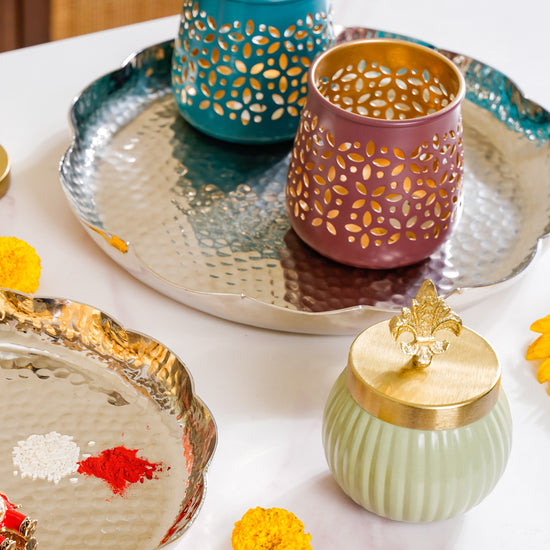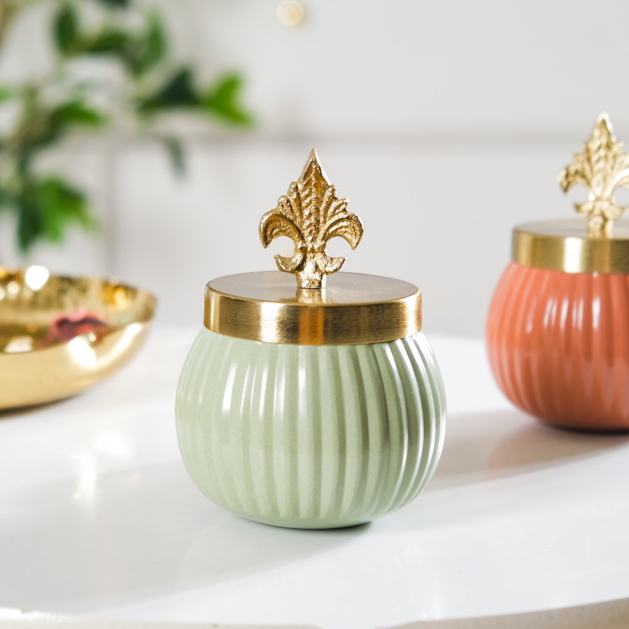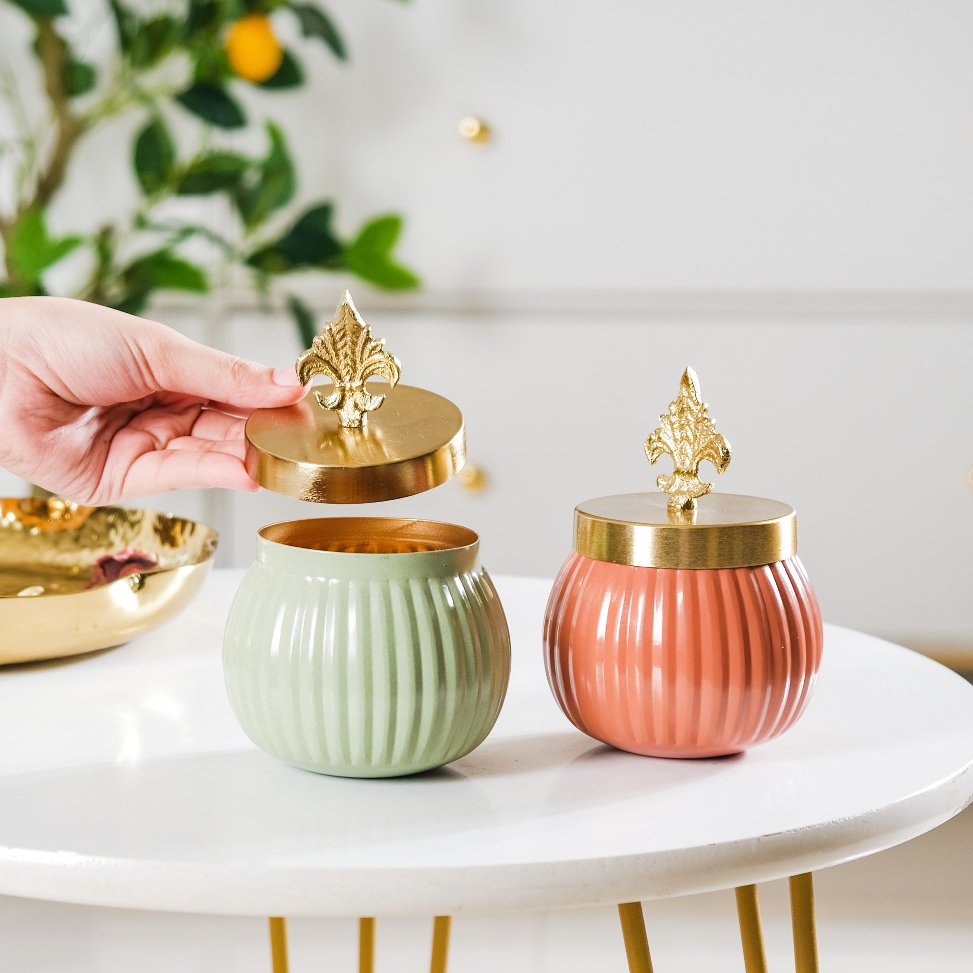 Unleash the allure of decorative storage with our remarkable set of 2 metal jars, each adorned with a mesmerizing decorative lid. These jars are more than just storage containers; they are exquisite works of art. Crafted from premium-quality metal, they boast a sleek and durable construction that ensures both functionality and beauty. The decorative lids, featuring intricate details and captivating designs, add a touch of elegance to any setting. Use them to store cherished keepsakes, treasured jewellery, or even statement pieces on their own. With our set of 2 metal jars, storage becomes an art form where practicality merges seamlessly with captivating aesthetics.