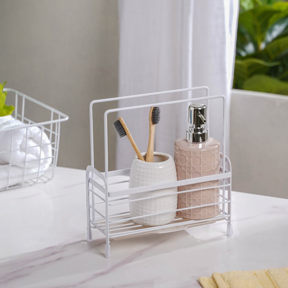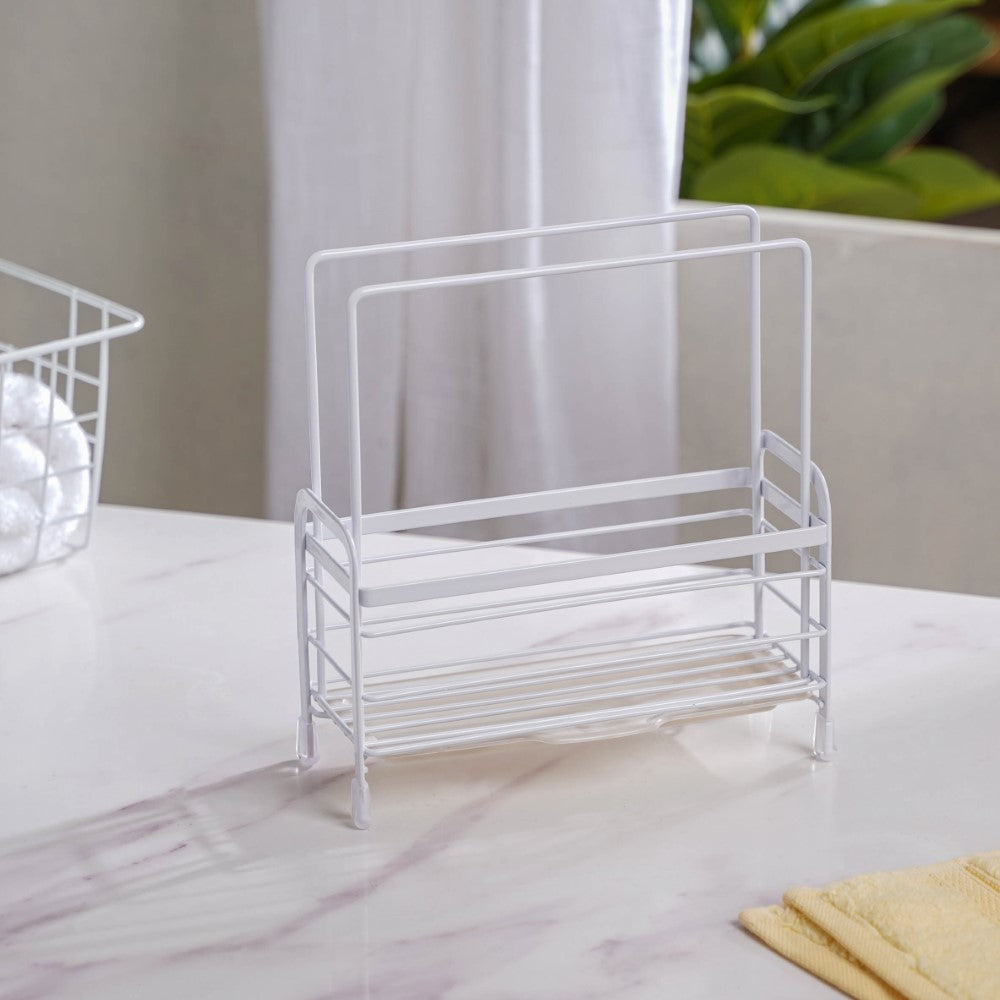 The white storage shelf is crafted in sturdy metal which comes with a removable tray on the base. The metal organizer is large enough to accommodate a variety of items like storing soap, detergents, bath products and more. The top rod helps to dry and place washcloth or dish cloth for quick drying. The spacious racks ensure that the items are kept nice and tidy. The sleek storage organizer is great for professional and personal use. The drainage tray at the bottom allow storing sponges and brushes and easy drainage to prevent bacteria buildup. Features:-durable and space-saving-water resistant and safe for wet spaces like kitchen and bath-top rack for drying dish cloth or wash cloth-skid proof legs to avoid toppling in soapy water-suitable for the bathroom, kitchen, dresser, or garden-removable drainage tray for hassle-free cleaning-easy drainage preventing bacteria buildup-racks can be disassembled for storage when not in use-easy and effortless to assemble-innovative and flexible design-stable and strong base-two tier storage rack Nestip: The rack can be placed in the garden area for keeping small plants so that the excess water can be drained out. Size: 21.5cm L x 9cm B x 23cm H Color: White Material: Metal and PVC (tray) Products included: 1 storage rack Style: OMG114KU03